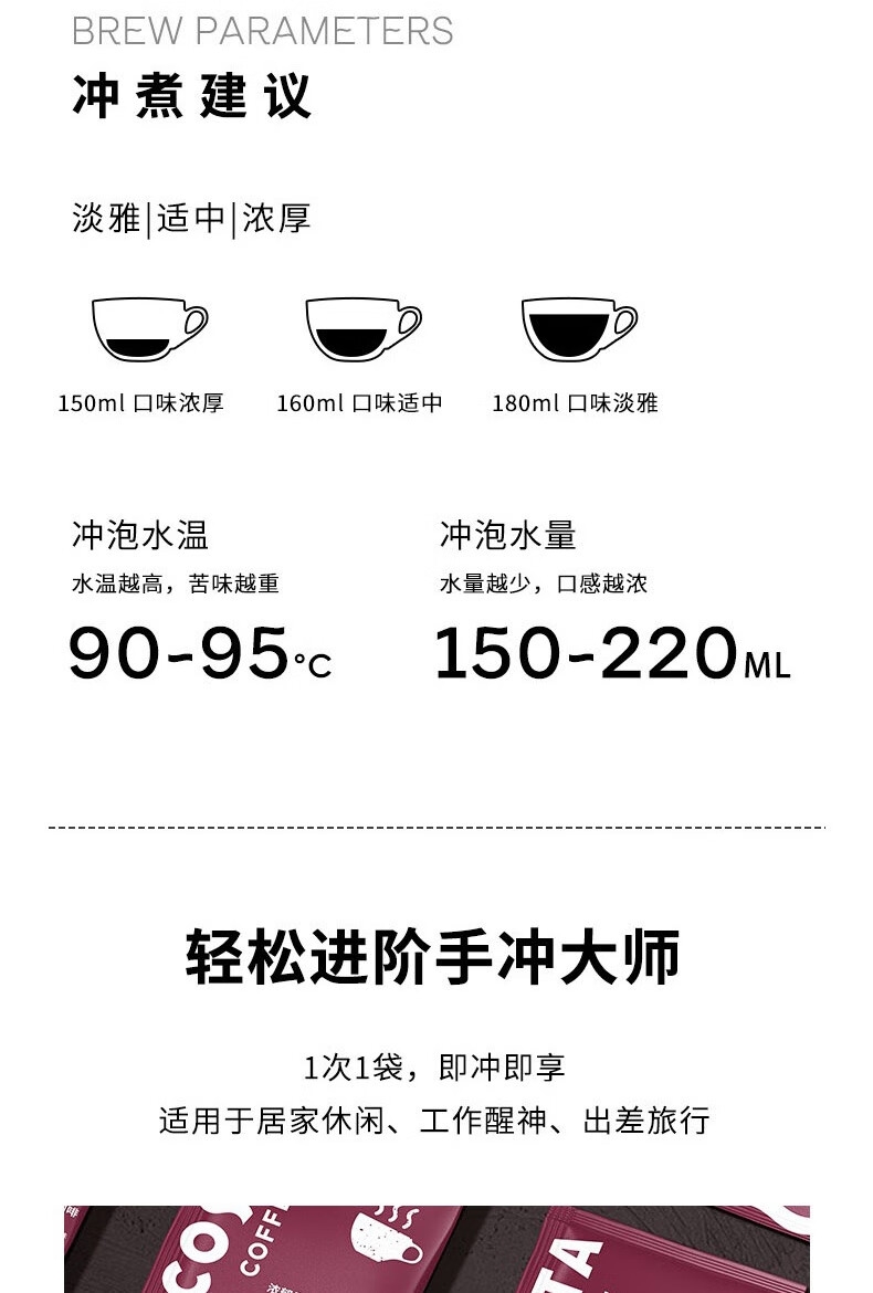 咖啡小包装易携带,适用居家休闲,工作提神,出行游玩;手冲壶采用天鹅颈细长造型,轻松控制稳定水流;专属马克杯