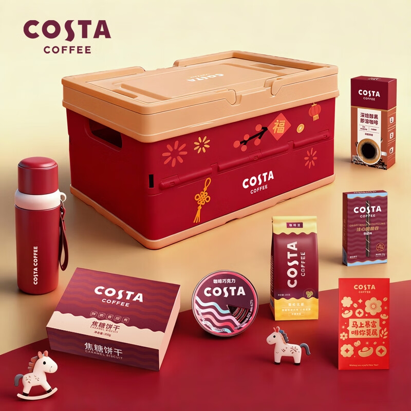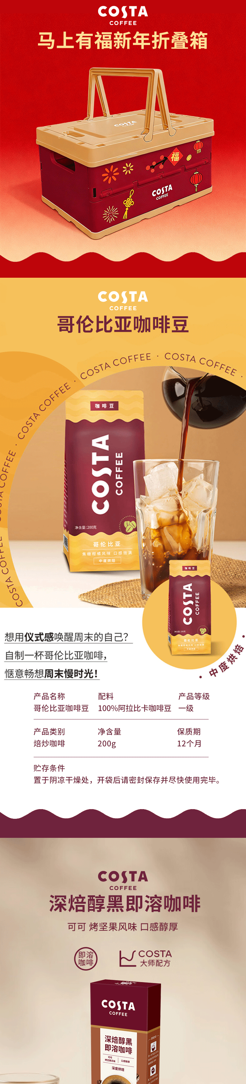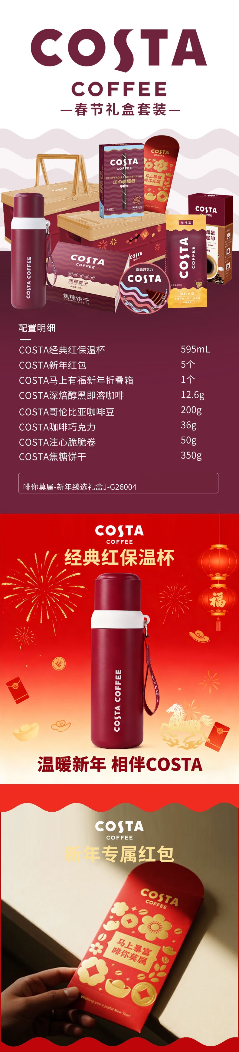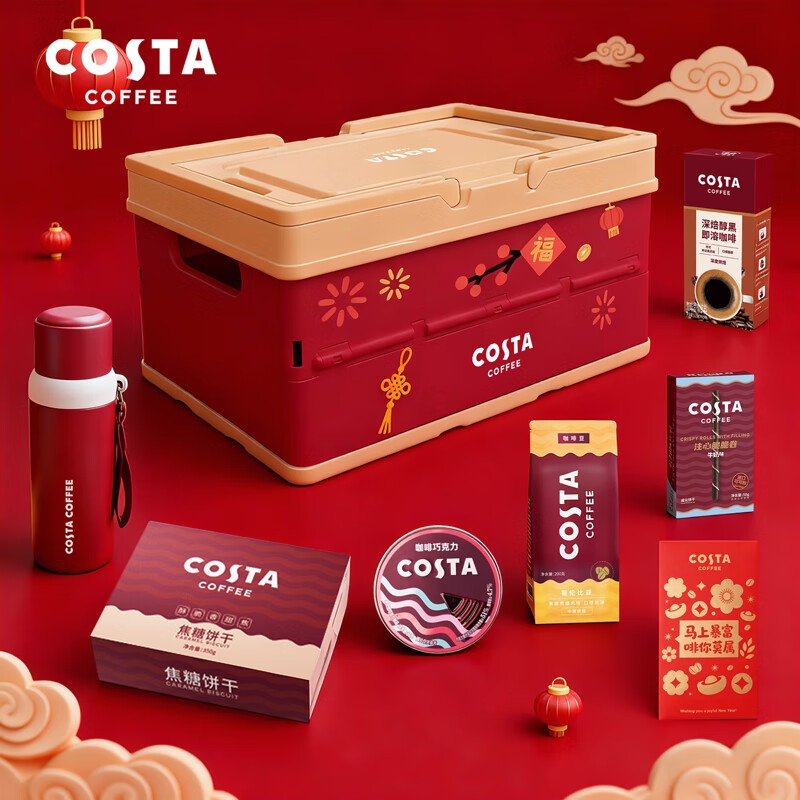 配置清单:COSTA经典红保温杯595ml*1 COSTA新年红包*5 COSTA马上有福新年折叠箱*1 COSTA深焙醇黑即溶咖啡12.6g*1 COSTA哥伦比亚咖啡豆200g*1 COSTA咖啡巧克力36g*1 COSTA注心脆脆卷50g*1 COSTA焦糖饼干350g*1