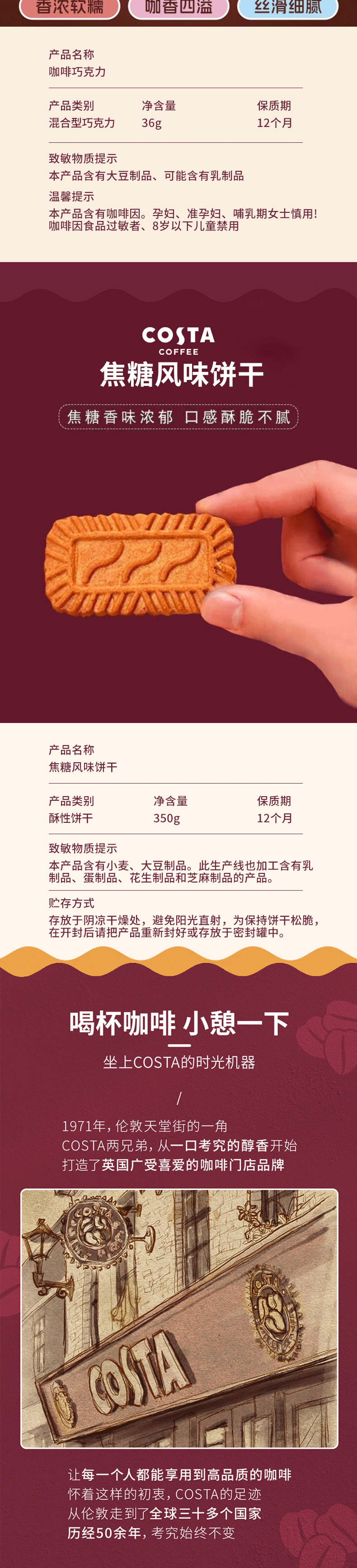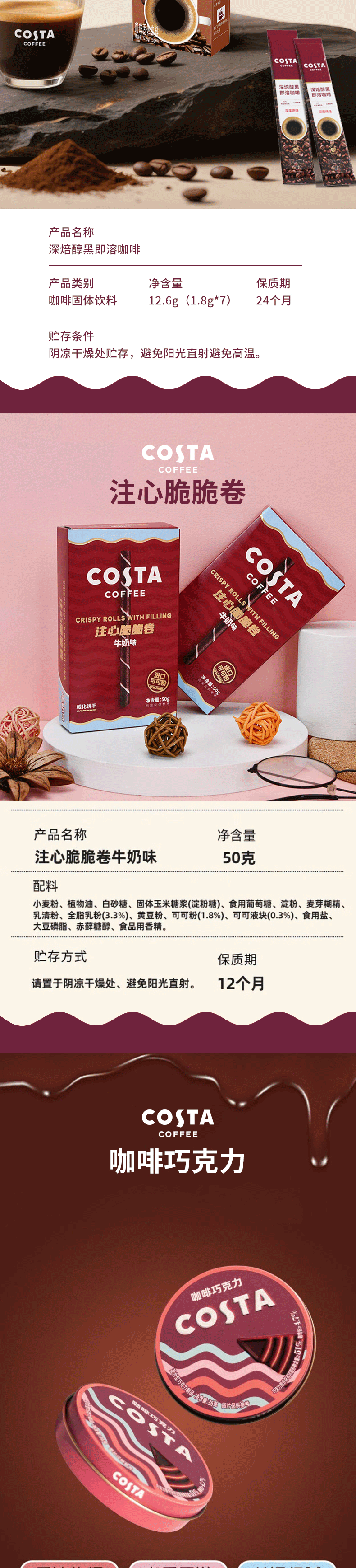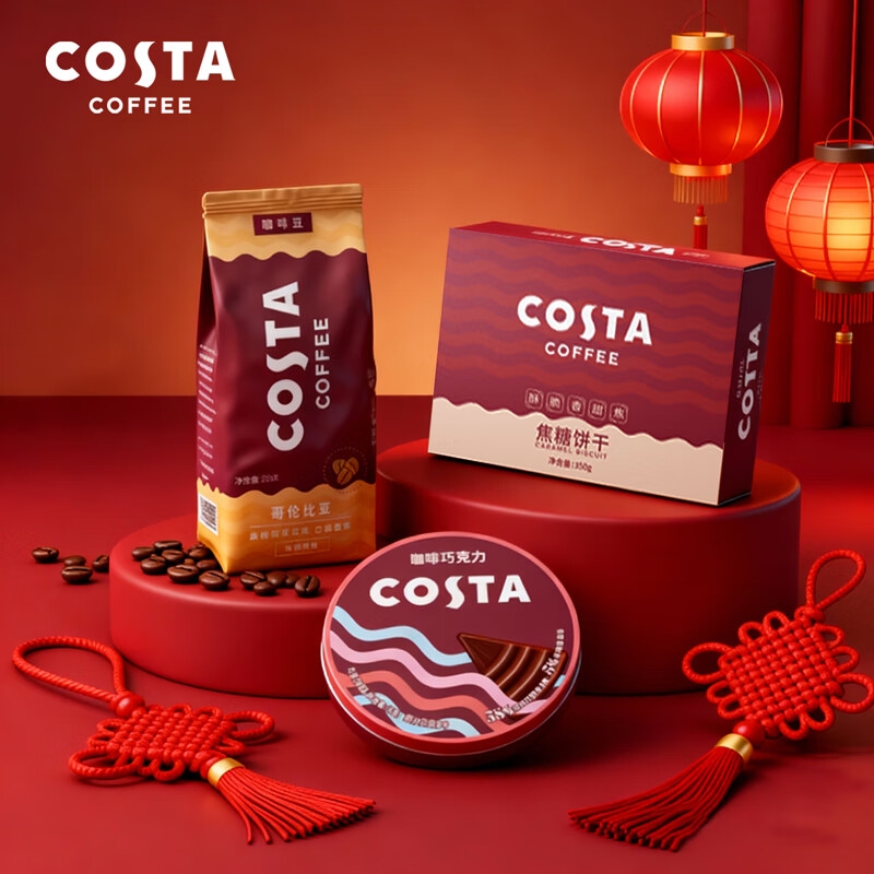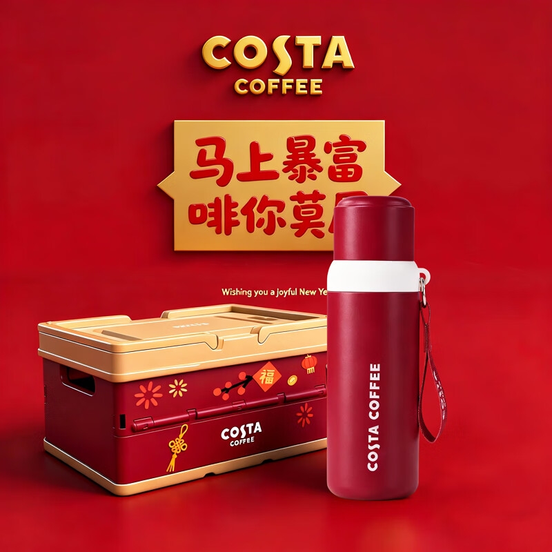 配置清单:COSTA经典红保温杯595ml*1 COSTA新年红包*5 COSTA马上有福新年折叠箱*1 COSTA深焙醇黑即溶咖啡12.6g*1 COSTA哥伦比亚咖啡豆200g*1 COSTA咖啡巧克力36g*1 COSTA注心脆脆卷50g*1 COSTA焦糖饼干350g*1