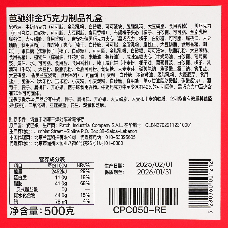 芭驰 绯金巧克力限定礼盒装500g
