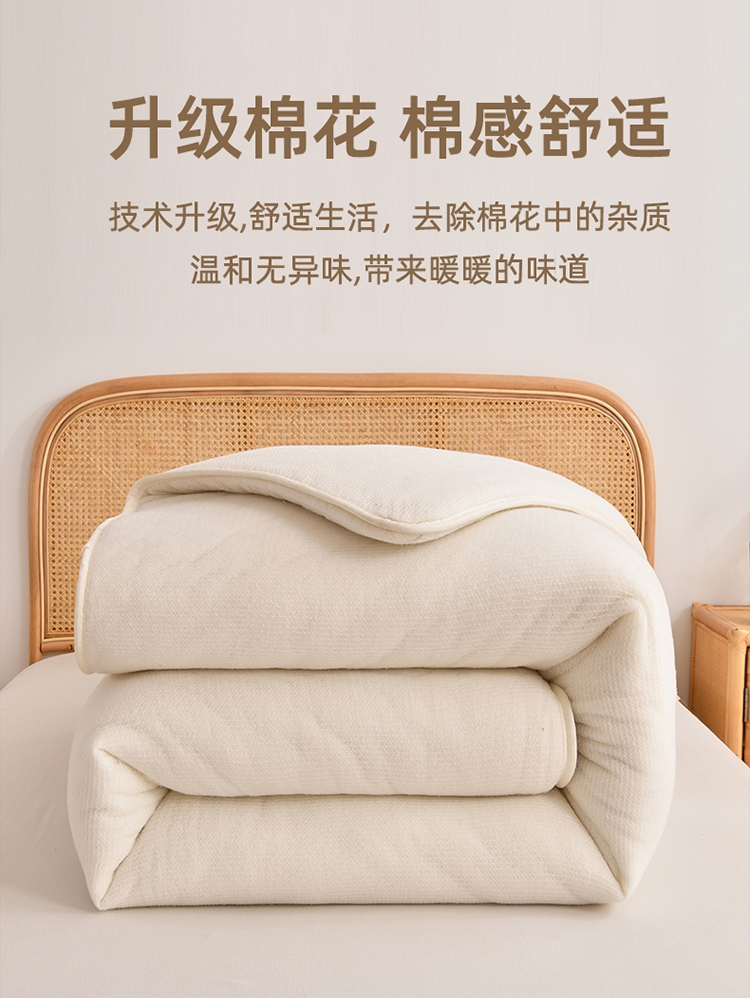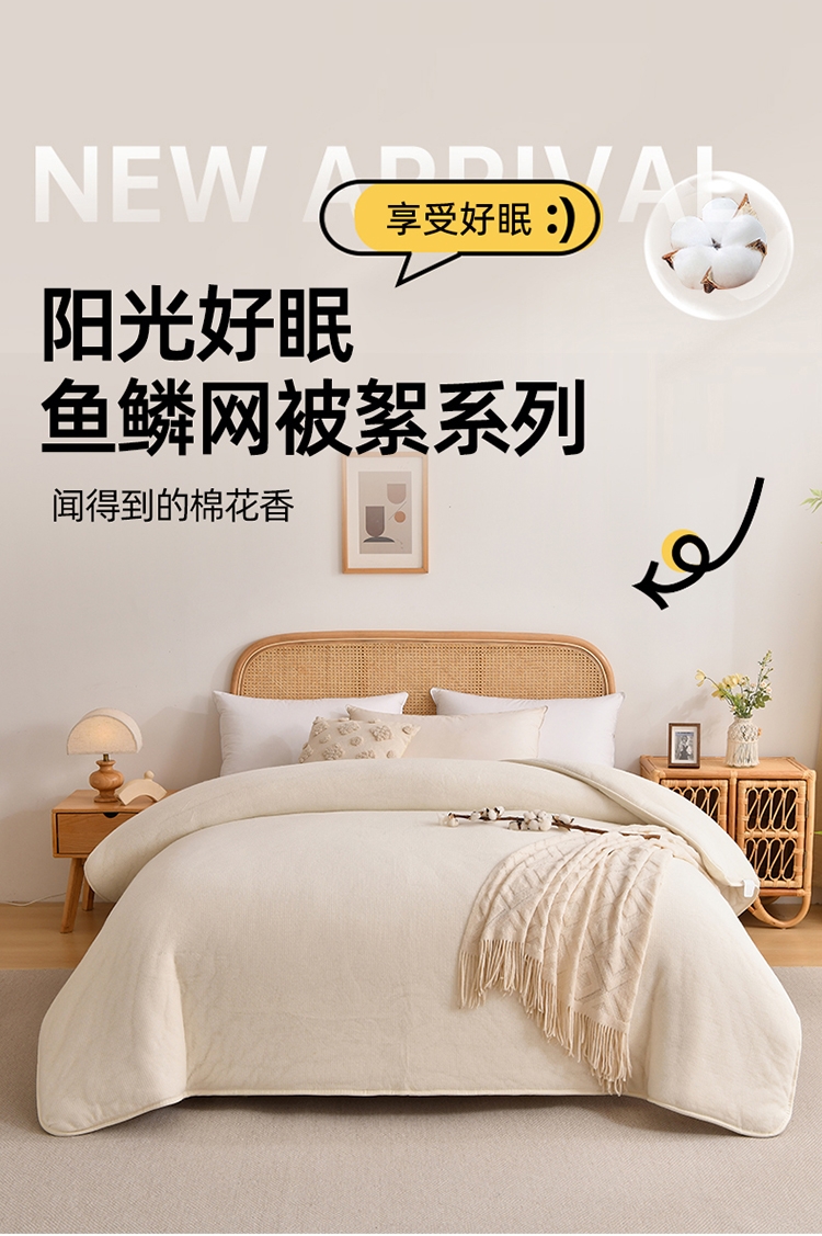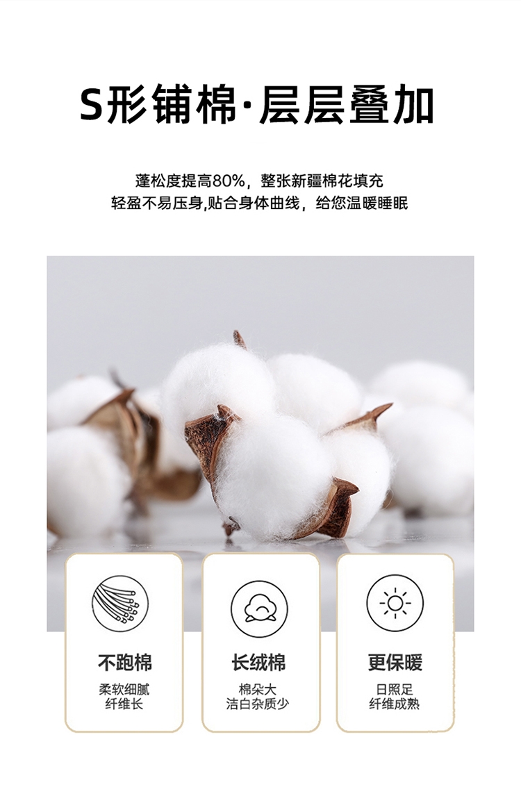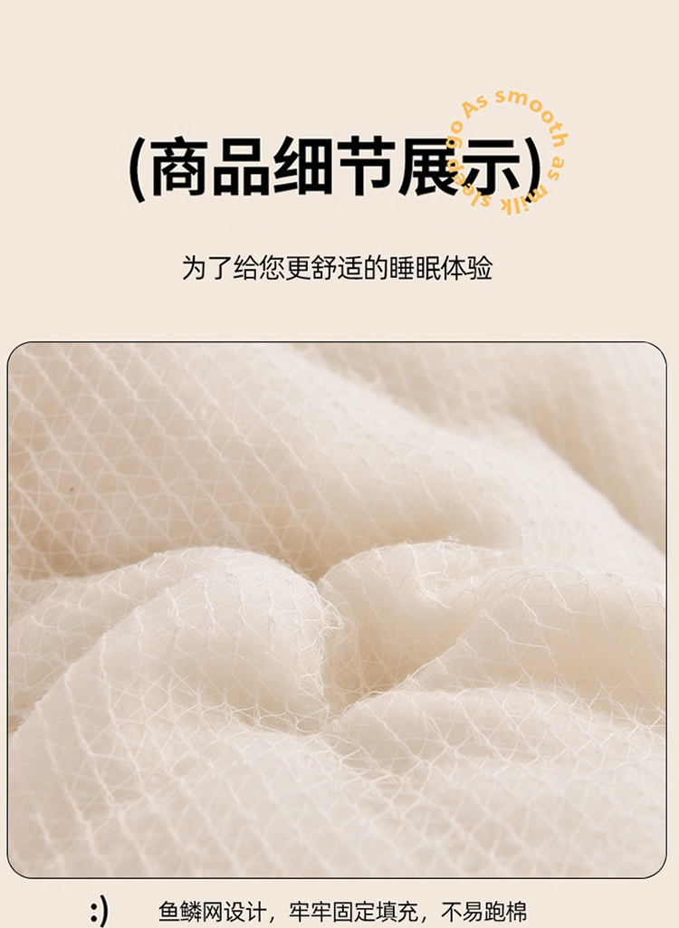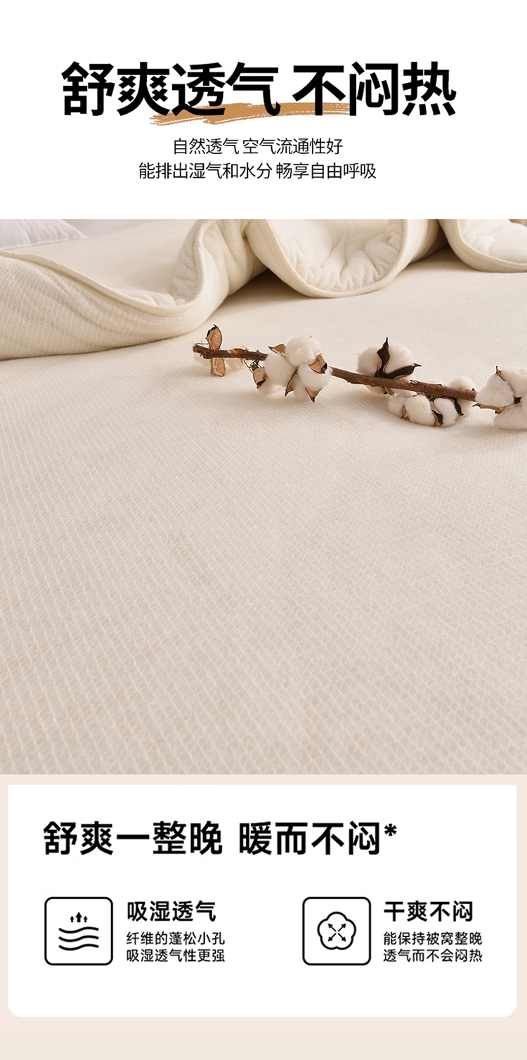 技术升级,舒适生活,去除棉花中的杂质温和无异味,;蓬松度提高80%,整张新疆棉花填充轻盈不易压身,;鱼鳞网设计,牢牢固定填充,不易跑棉