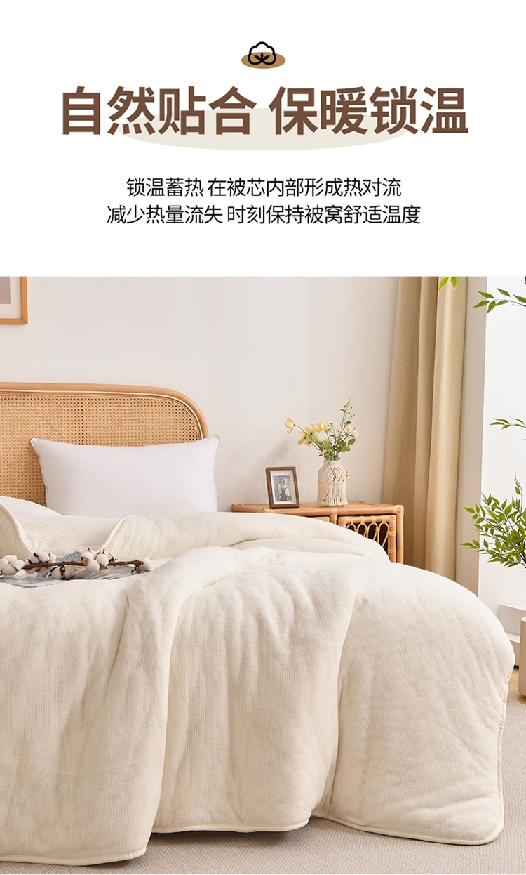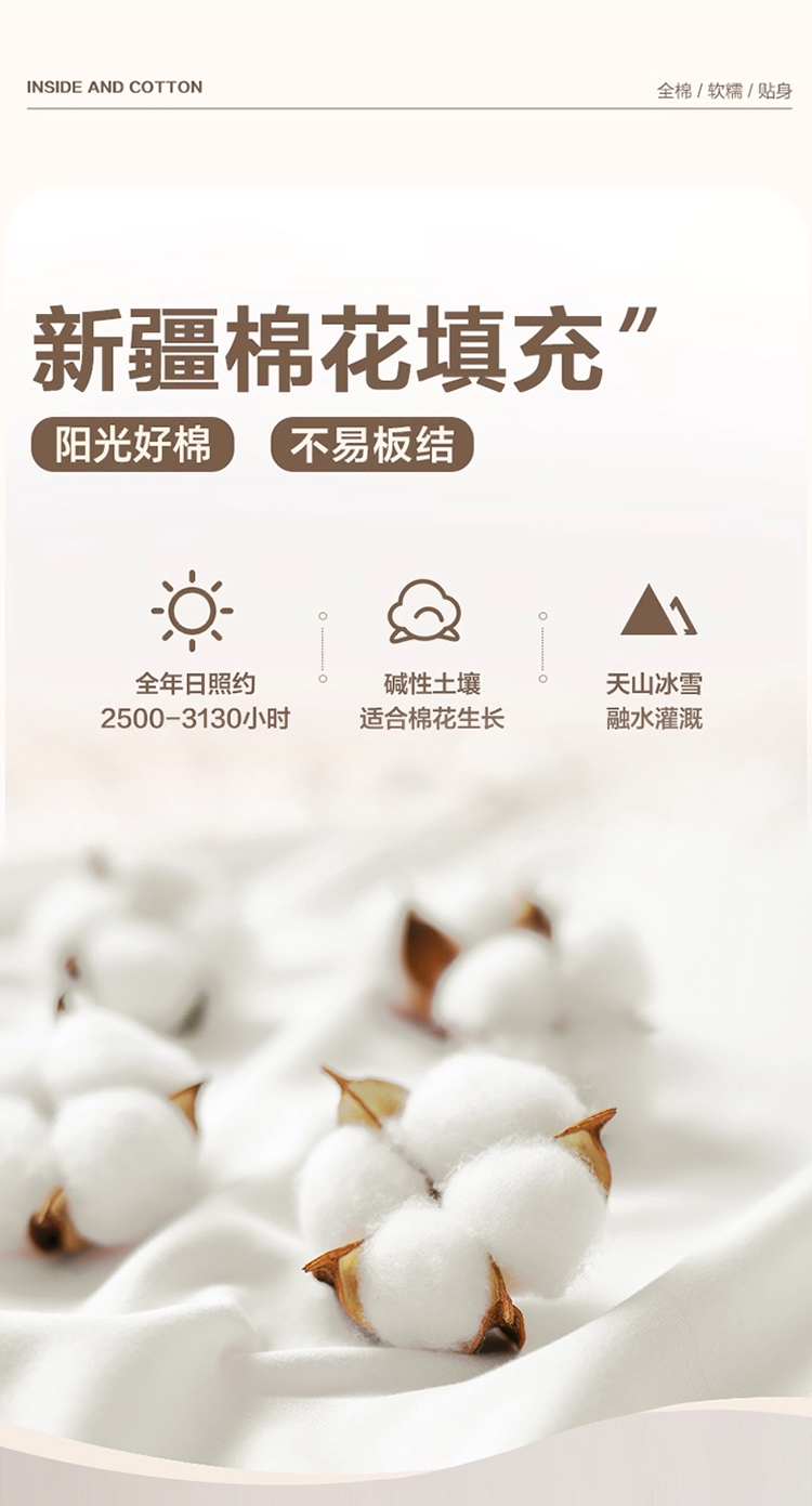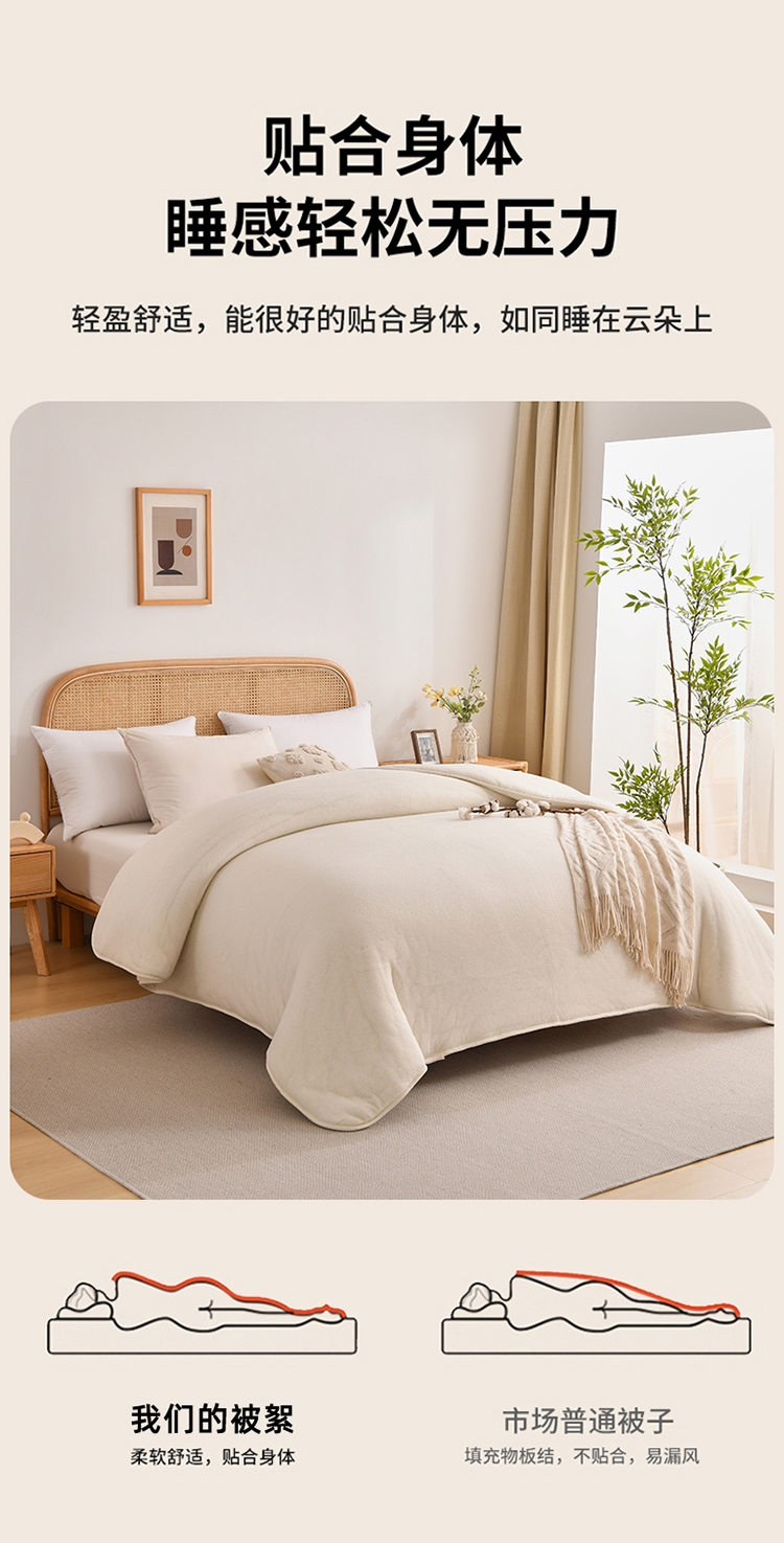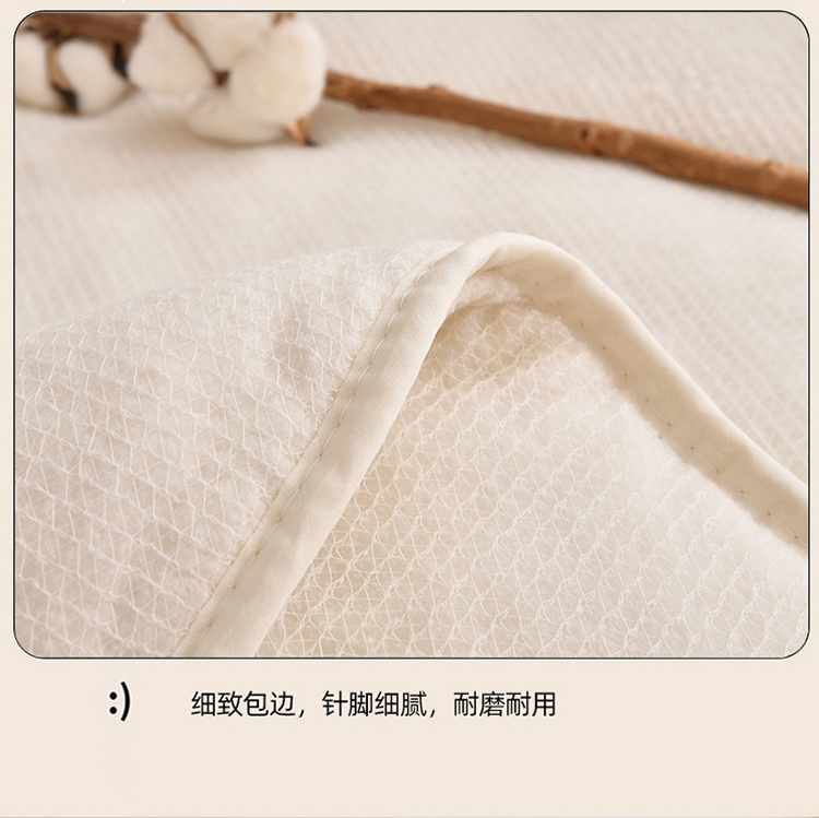 技术升级,舒适生活,去除棉花中的杂质温和无异味,;蓬松度提高80%,整张新疆棉花填充轻盈不易压身,;鱼鳞网设计,牢牢固定填充,不易跑棉