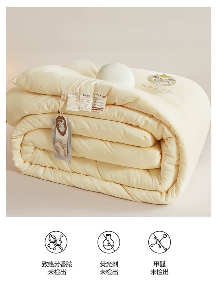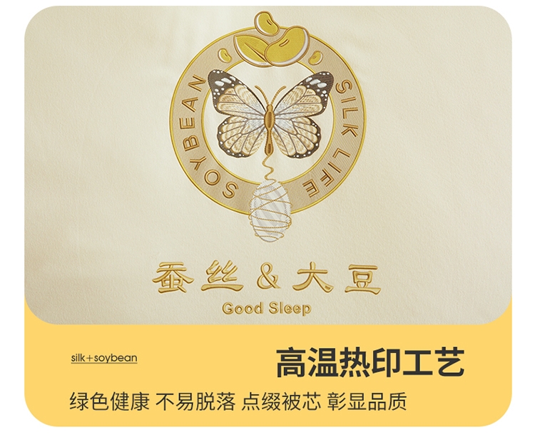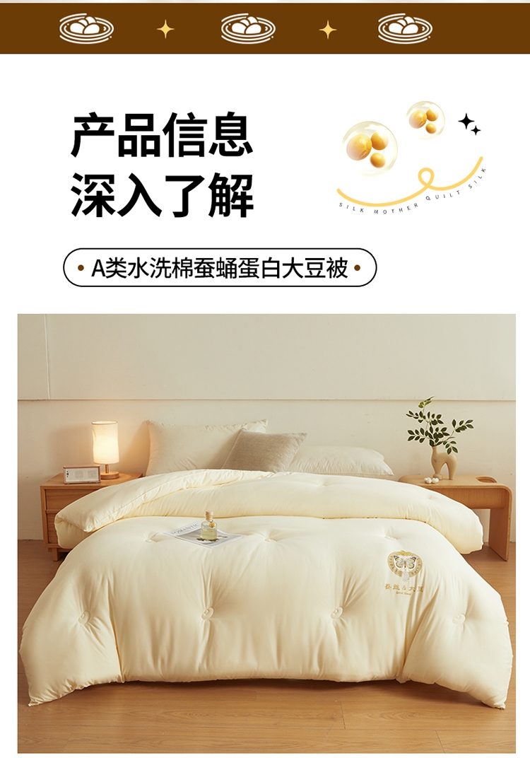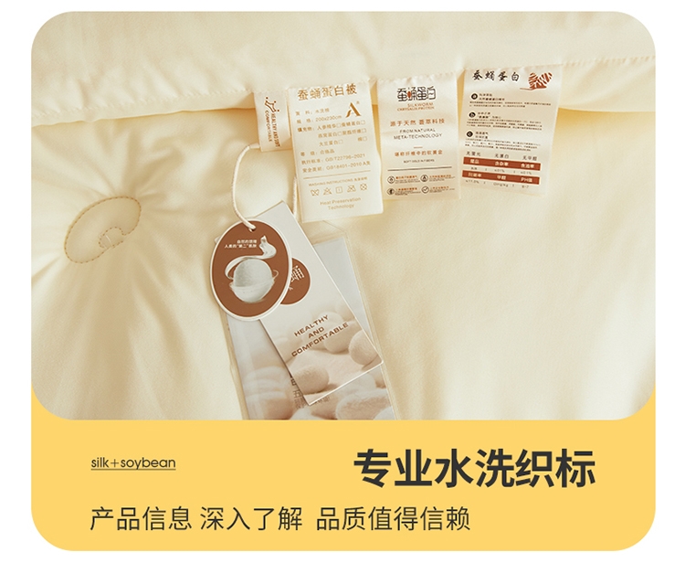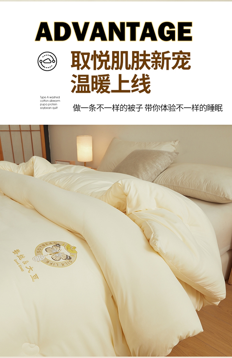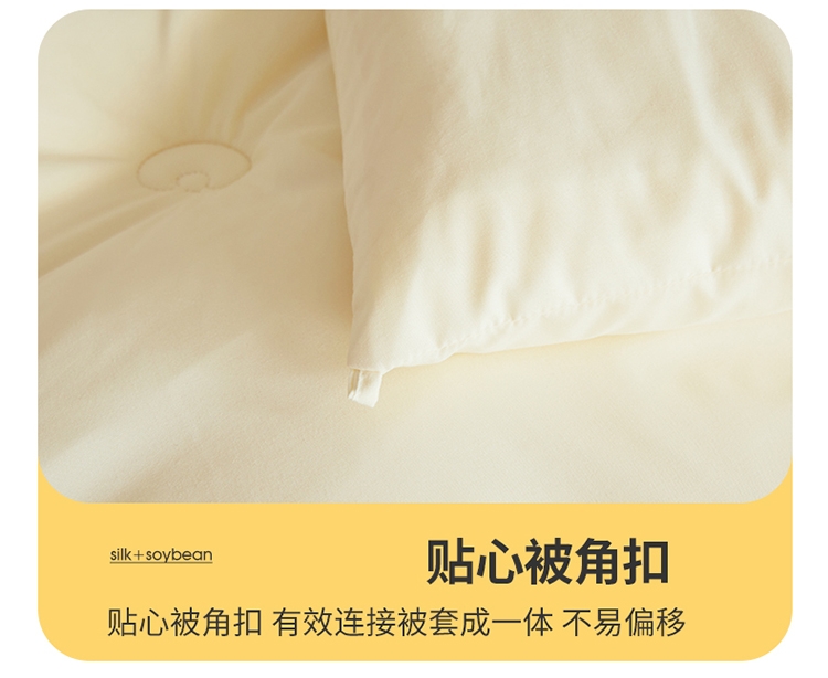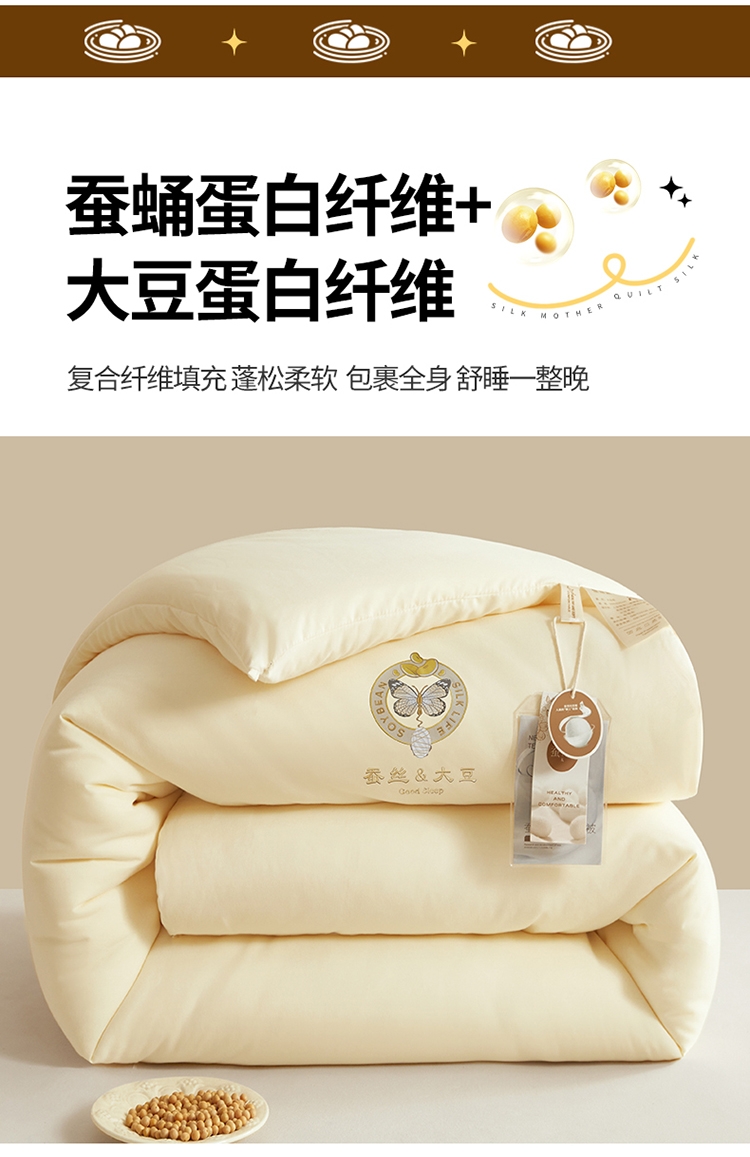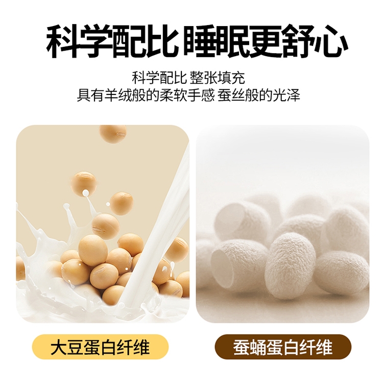 大豆蛋白纤维复合纤维填充 蓬松柔软 包裹全身;质感软糯细腻 面料经过水洗工艺处理 免打理柔软柔和;睡出健康 活力满满 双蛋白填充 滋养肌肤 柔暖呵护