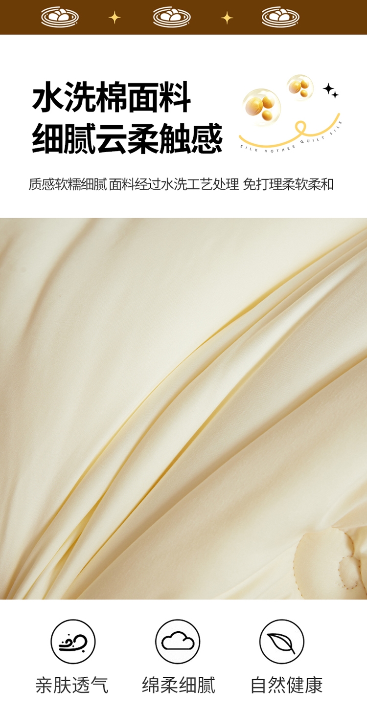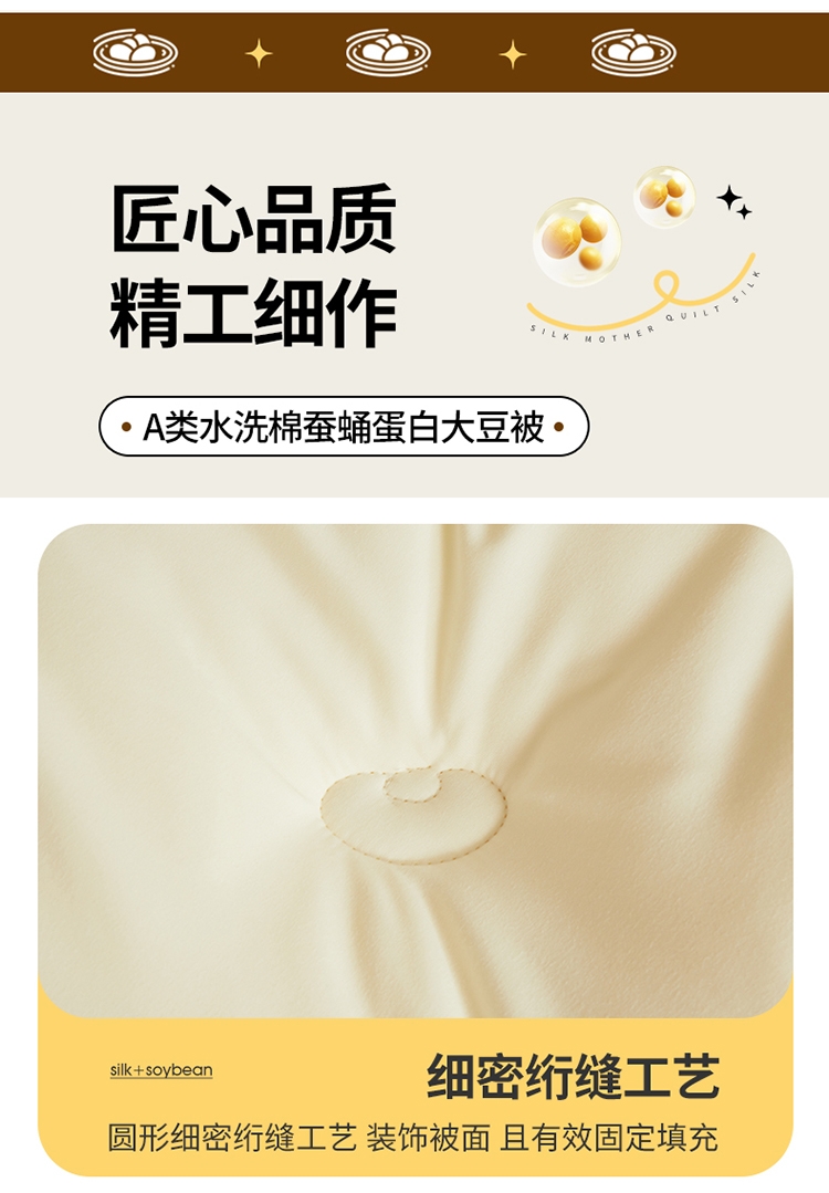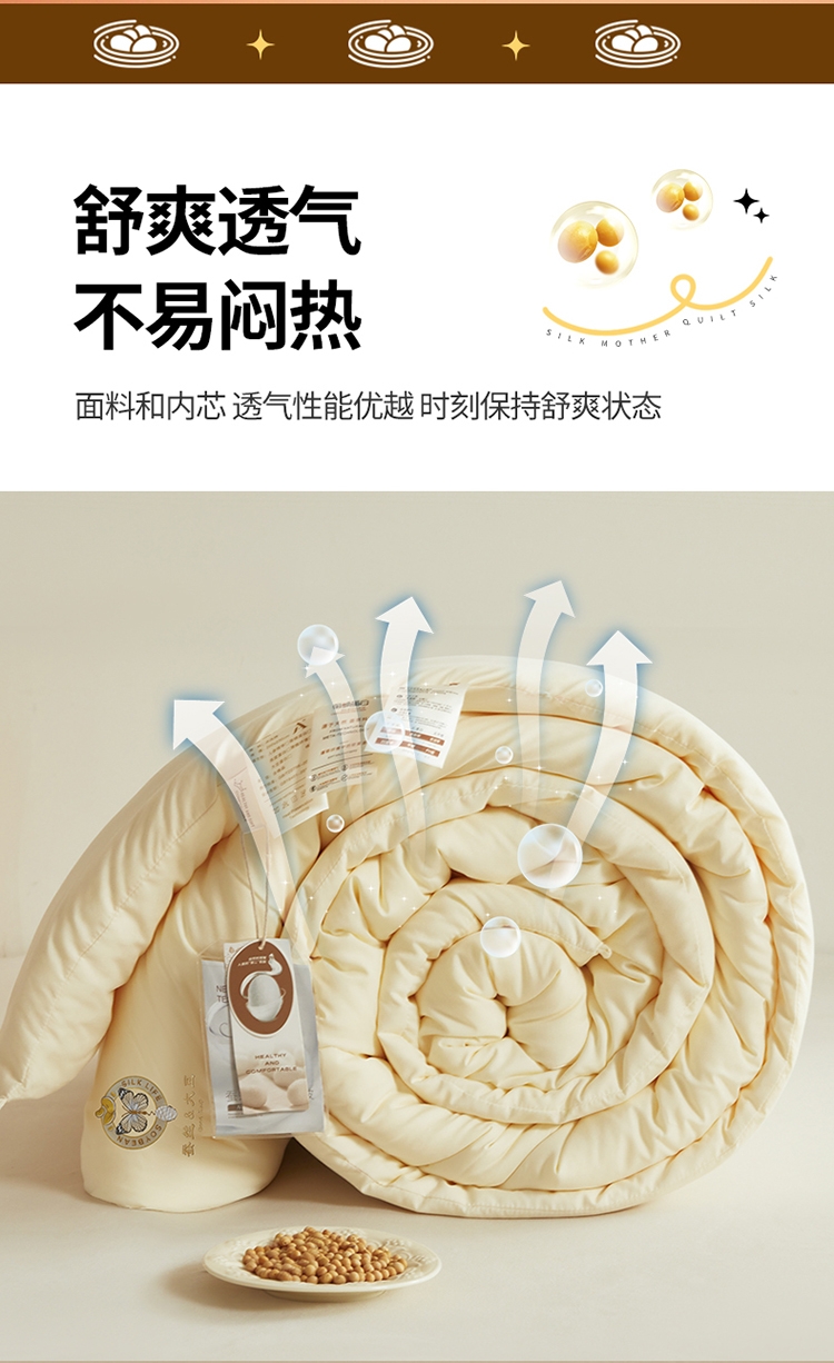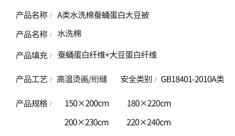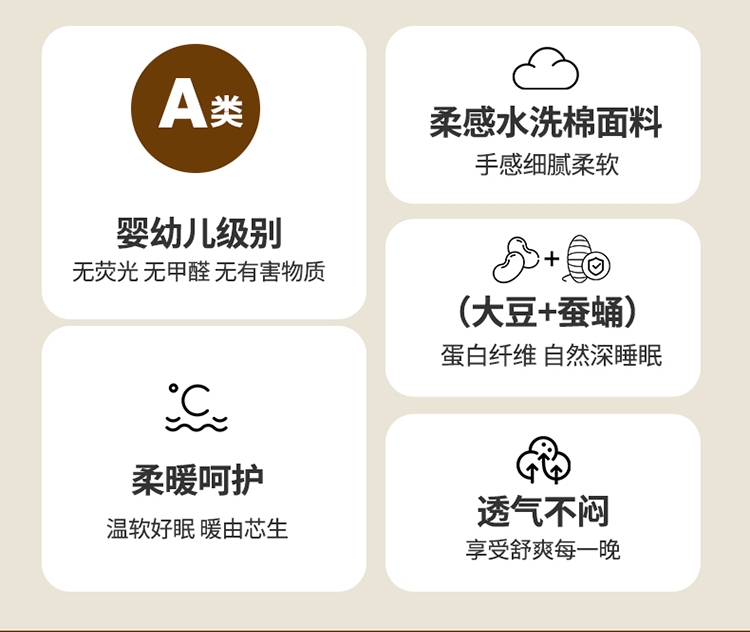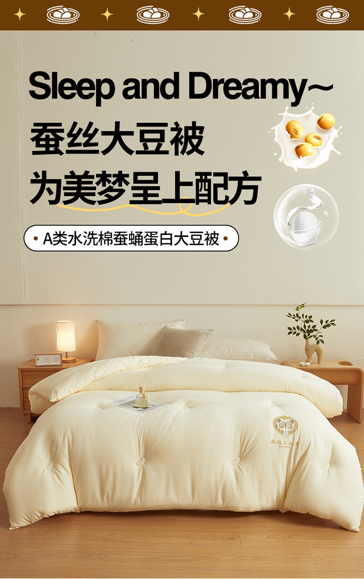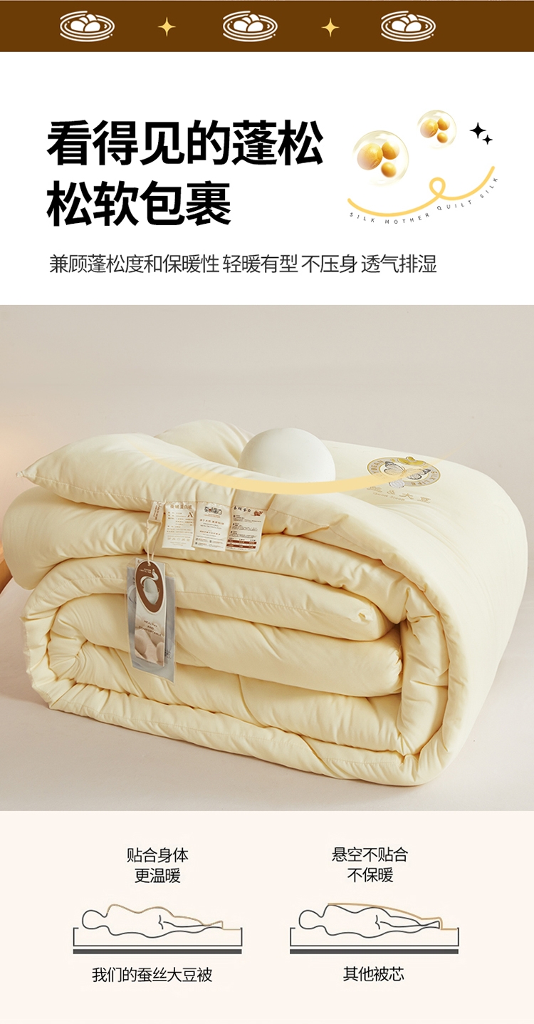 大豆蛋白纤维复合纤维填充 蓬松柔软 包裹全身;质感软糯细腻 面料经过水洗工艺处理 免打理柔软柔和;睡出健康 活力满满 双蛋白填充 滋养肌肤 柔暖呵护