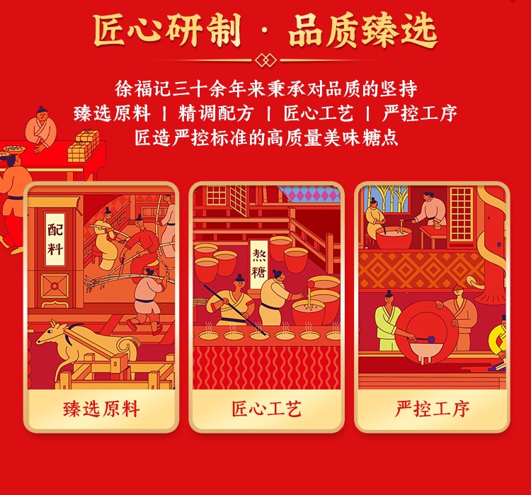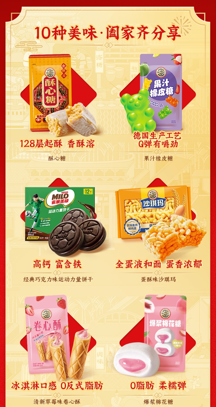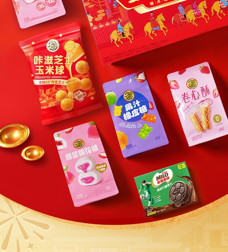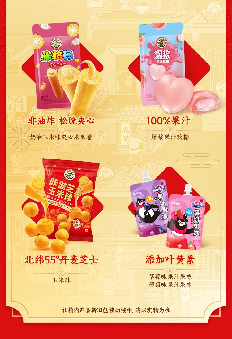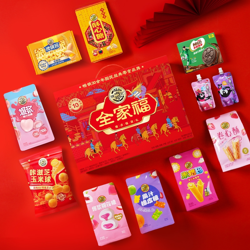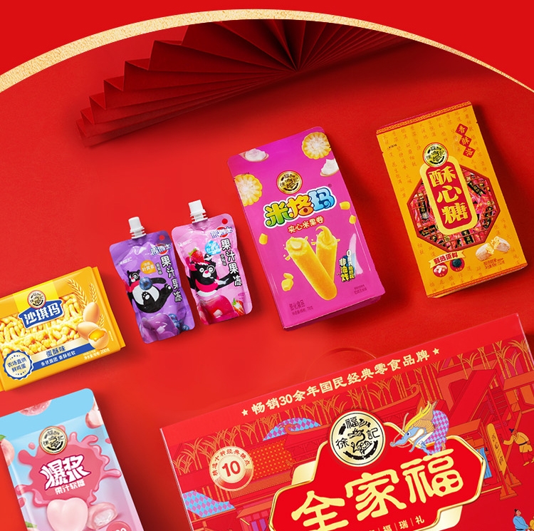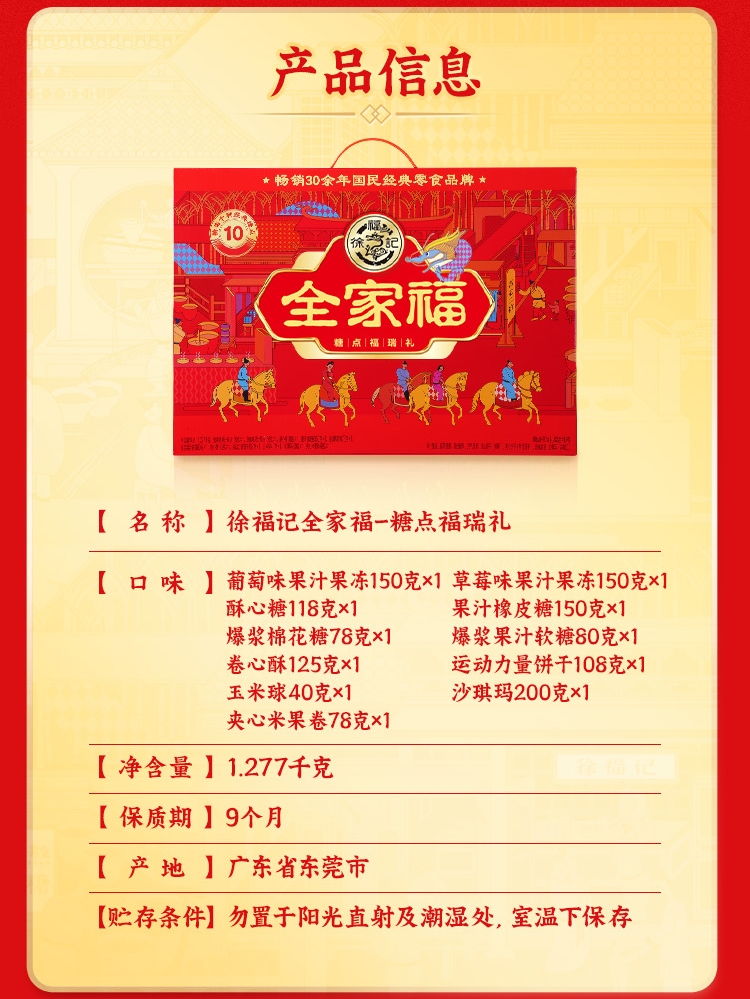 配置:【徐福记】酥心糖118g 【徐福记】橡皮糖150g 【徐福记】棉花糖78g 【徐福记】爆浆白桃80g 【徐福记】卷心酥125g 【徐福记】美禄108g 【徐福记】米果卷78g 【徐福记】香酥沙琪玛200g 【徐福记】玉米球40g 【徐福记】熊博士葡萄味&草莓味果150gx2