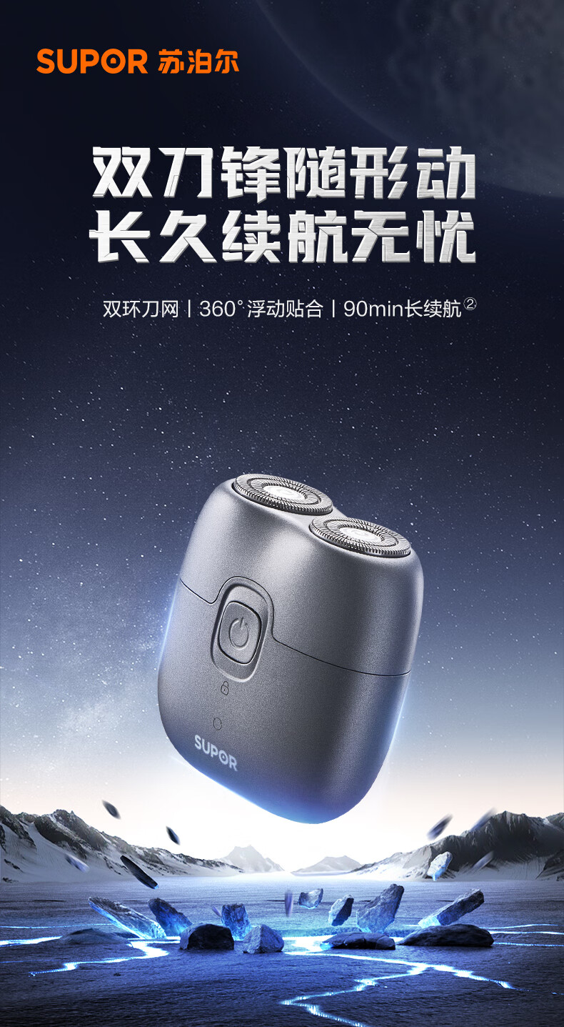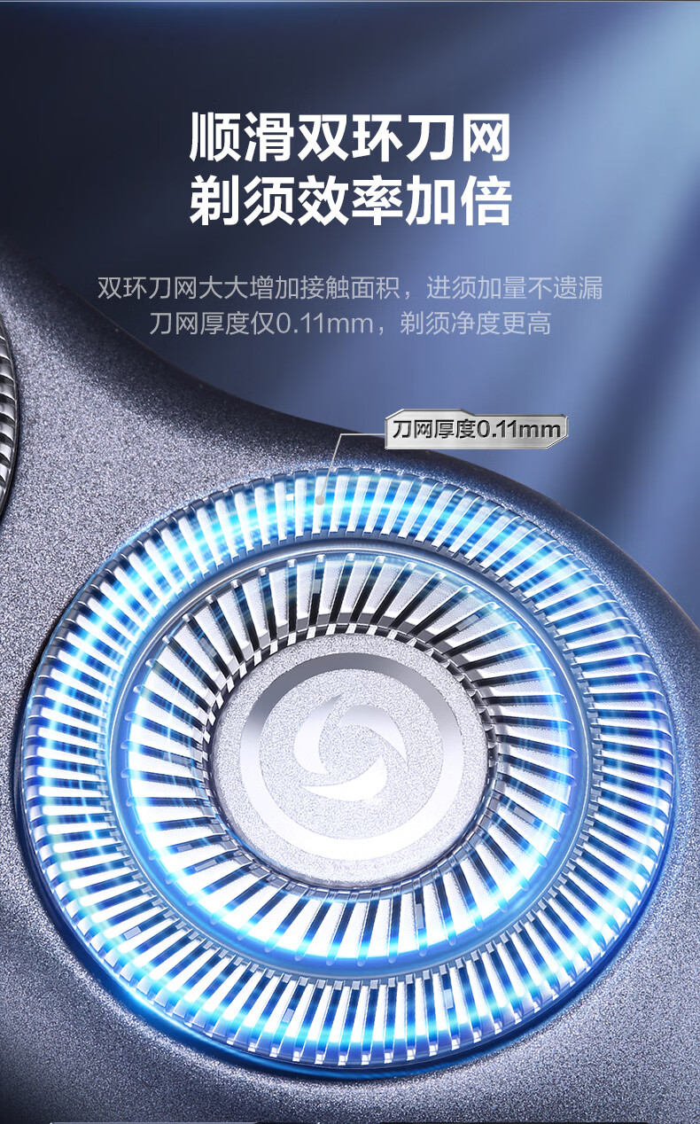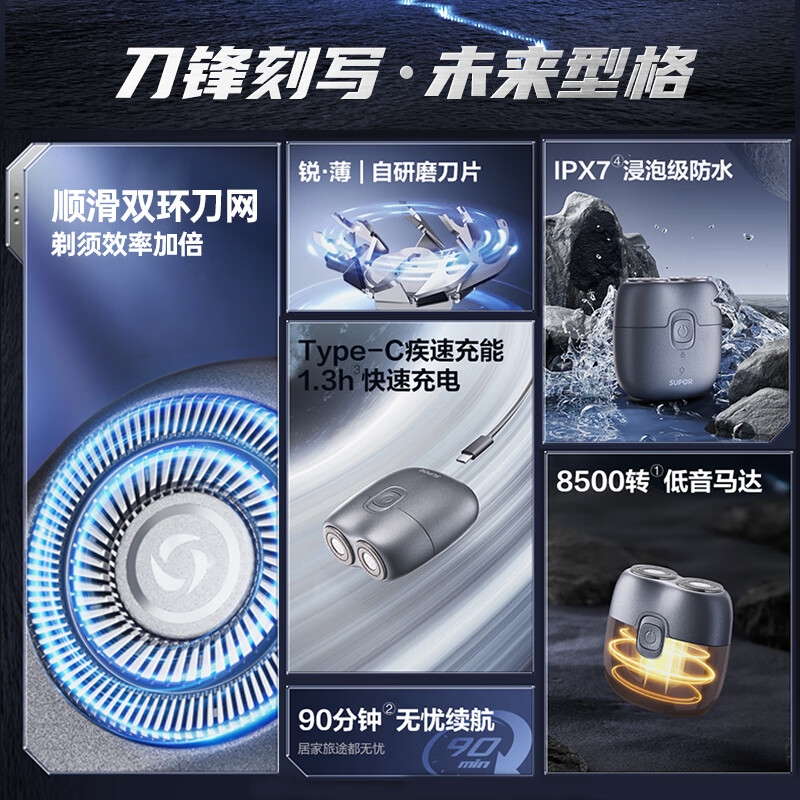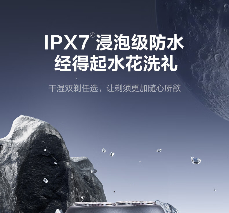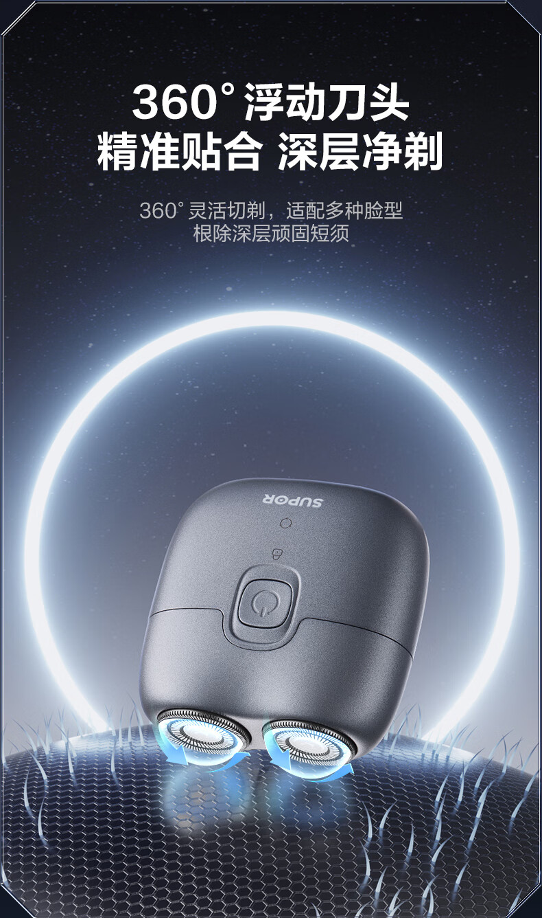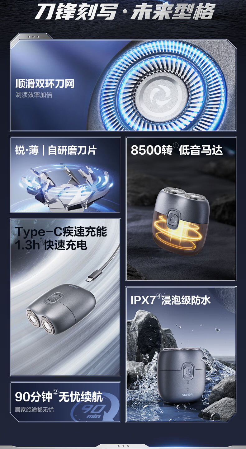 360°浮动两刀头; IPX7 等级防水;90min长续航