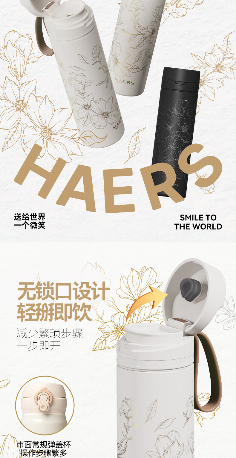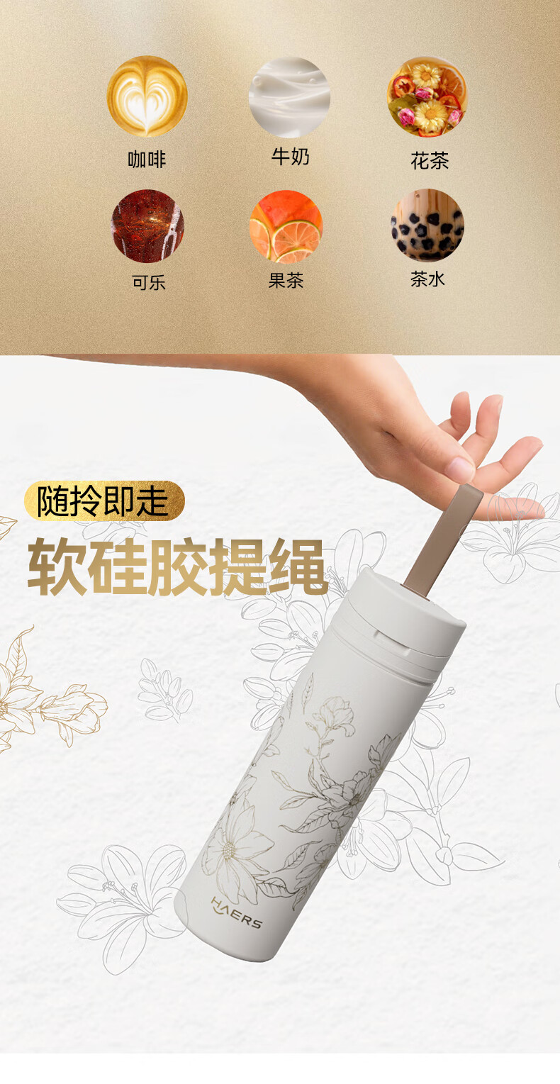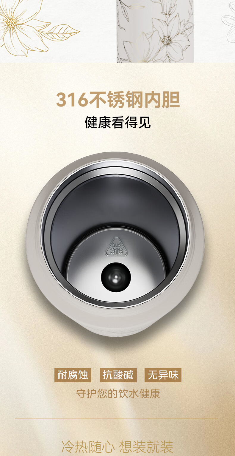 无锁口设计 ,轻掰即饮;纤细杯体尺寸 ,随携无忧;软胶提绳搭配 ,随拎即走; 316不锈钢内胆 ,健康安心