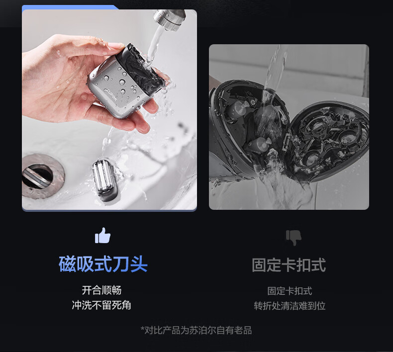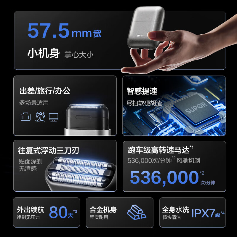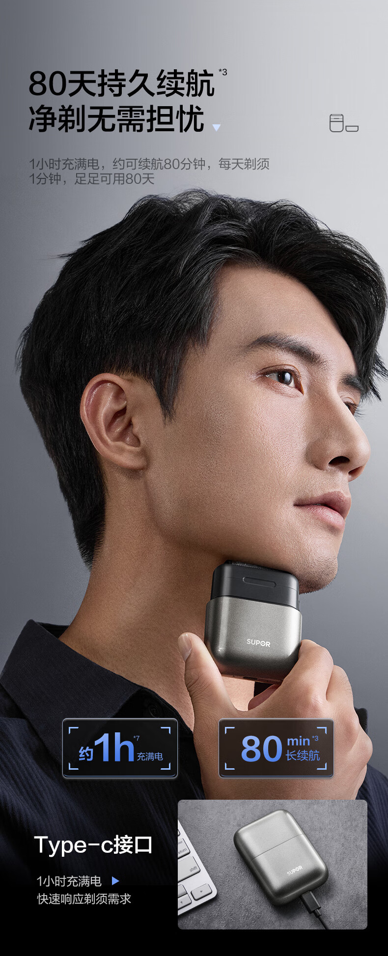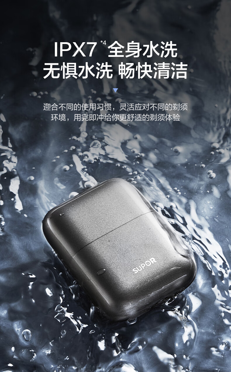 80天持久续航;磁吸刀头方便清洗;IPX7 全身水洗