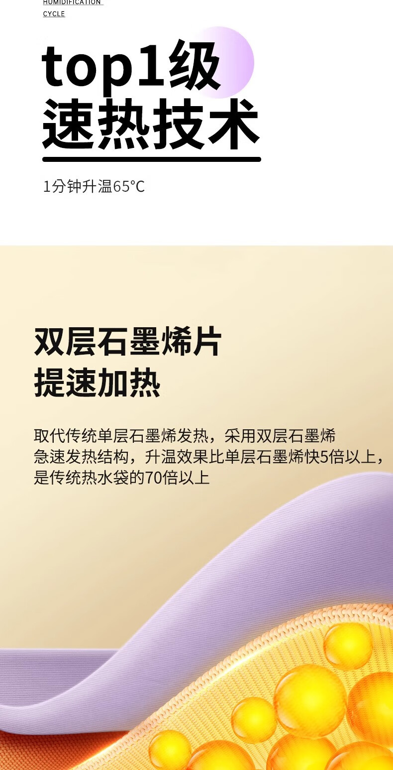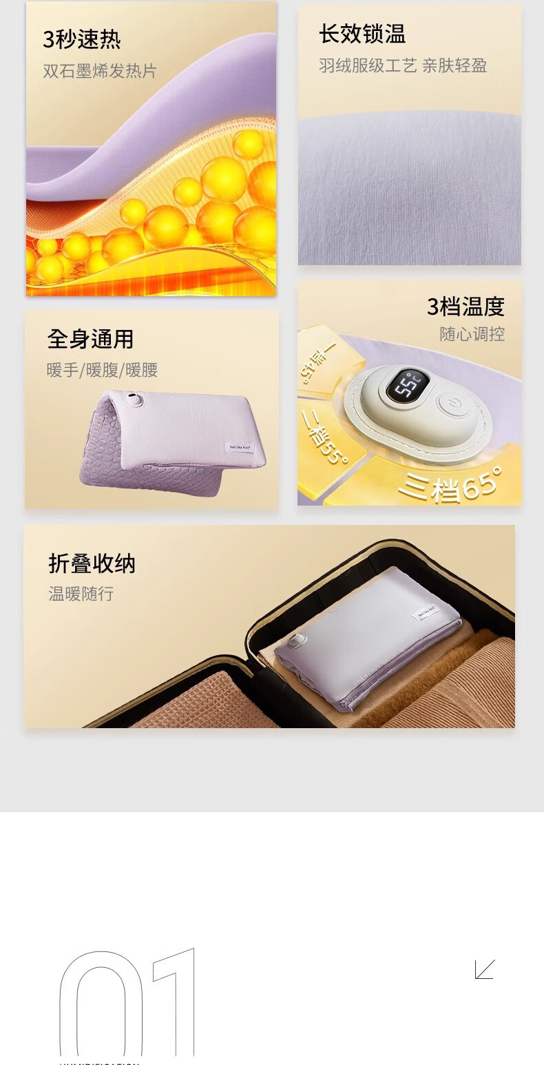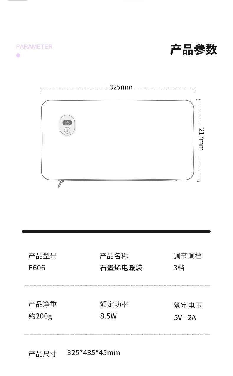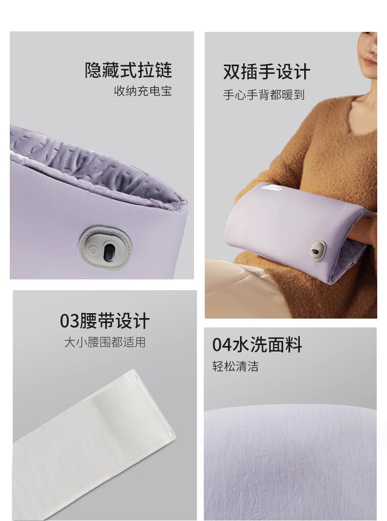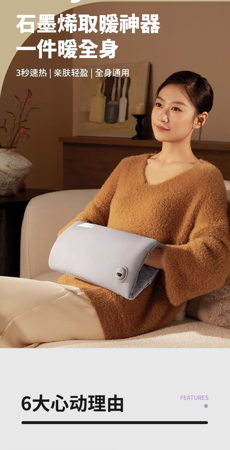 石墨烯发热技术 3秒快速升温;暖腰、暖宫、暖手 解放双手;大面积取暖,热量更足;搭配5000mah充电宝,长效供暖