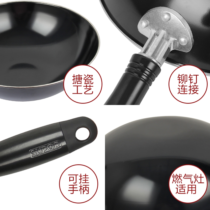 优质铁基材,卫生健康;表面高温防锈处理,表里搪瓷工艺,一擦即亮;燃气灶明火专用