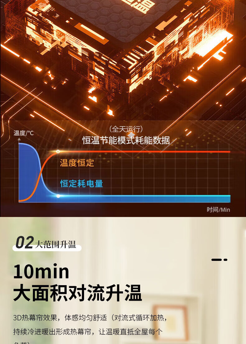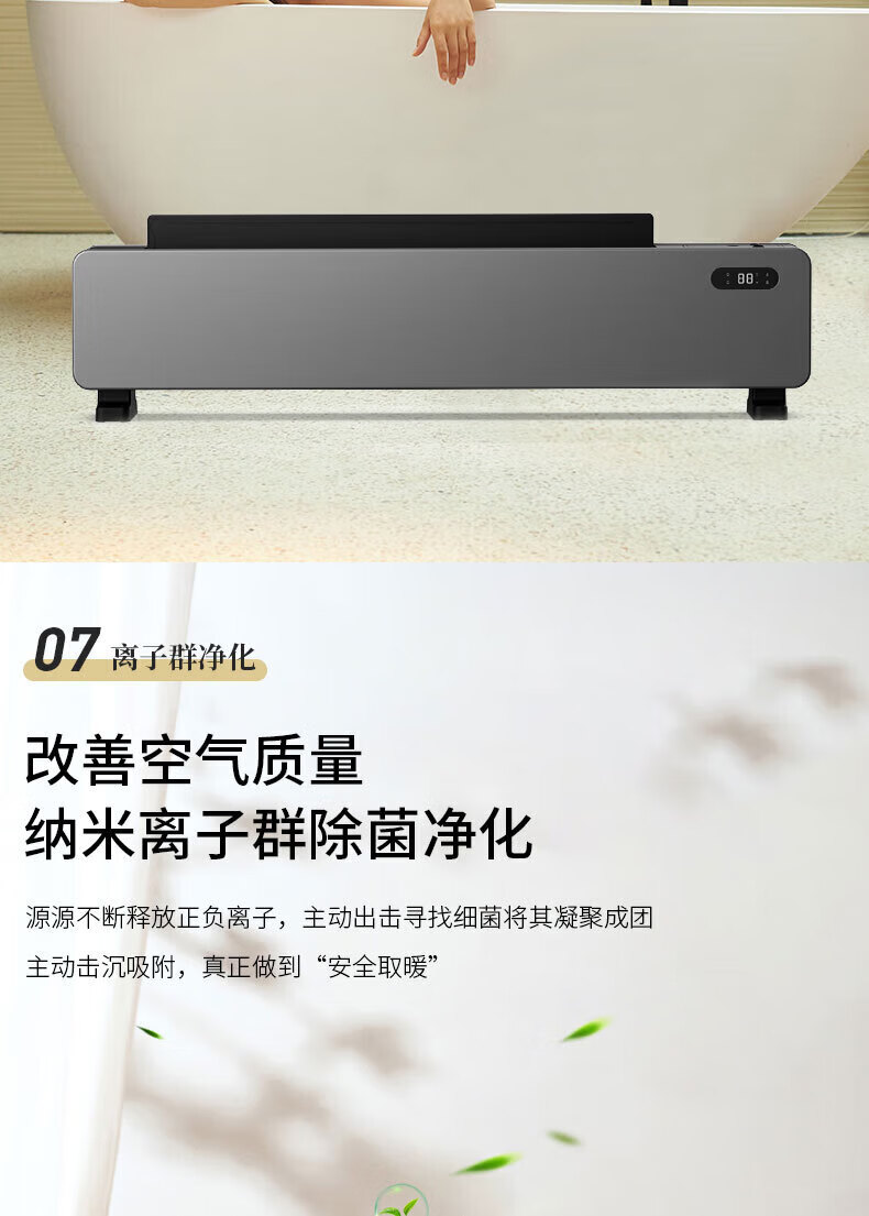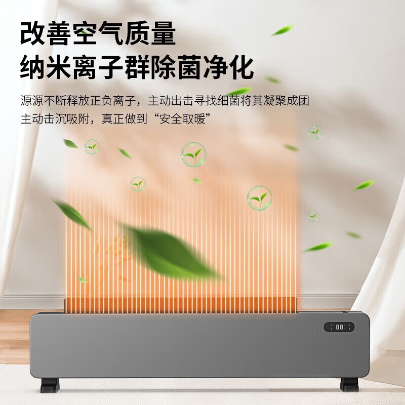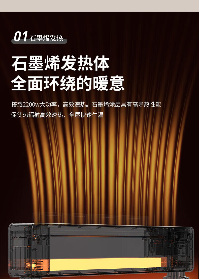特有防尘盖设计,启动后自动翻盖开启,满满仪式感;石墨烯发热体,取暖效率提升,即开即热;离子群模块:有效净化空气。