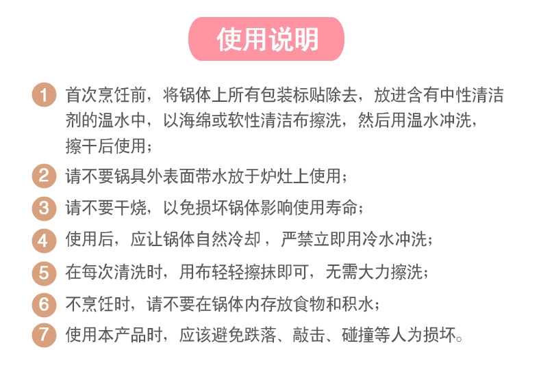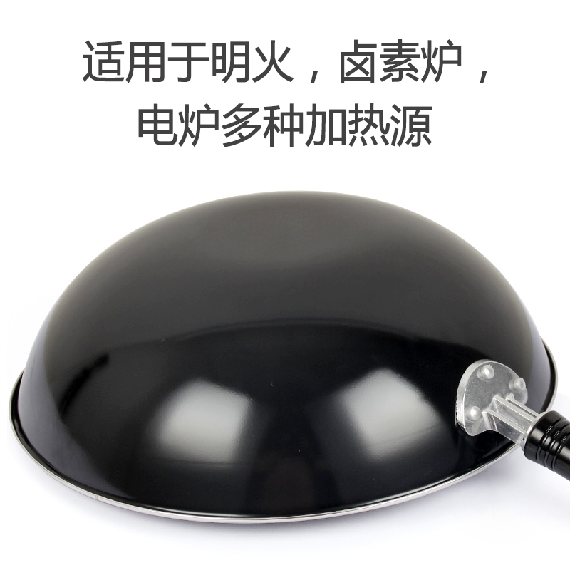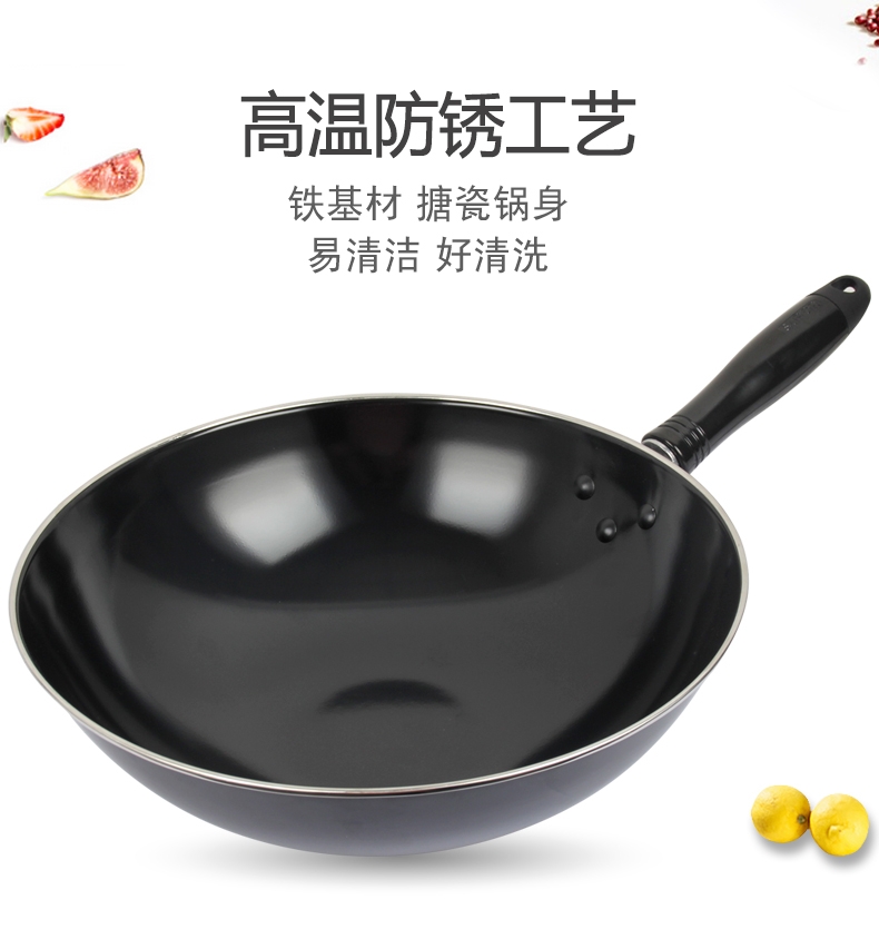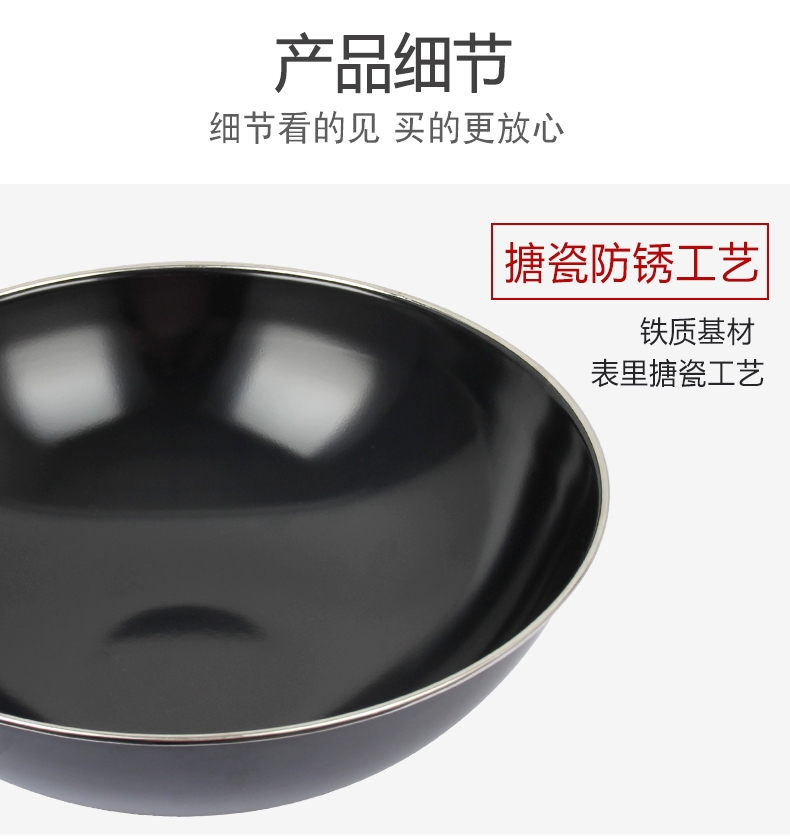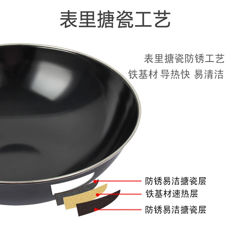 优质铁基材,卫生健康 ;表面高温防锈处理,表里搪瓷工艺,一擦即亮 ;燃气灶明火专用