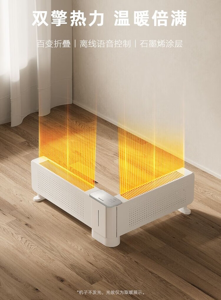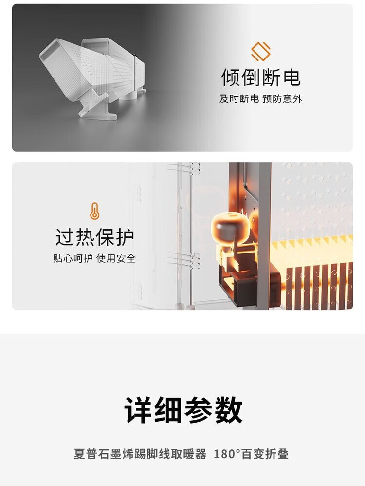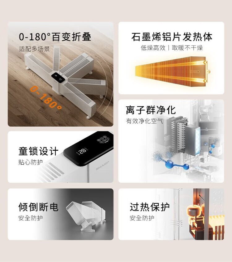 全新折叠设计,0°-180°多角度摆放,收纳不占空;机器两端内嵌式提手,移动更方便;童锁设计、倾倒防护、过热保护