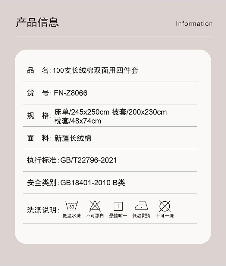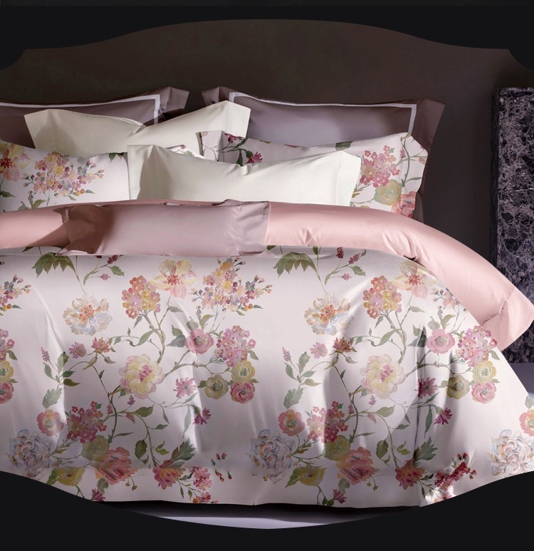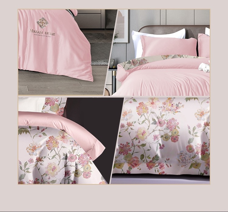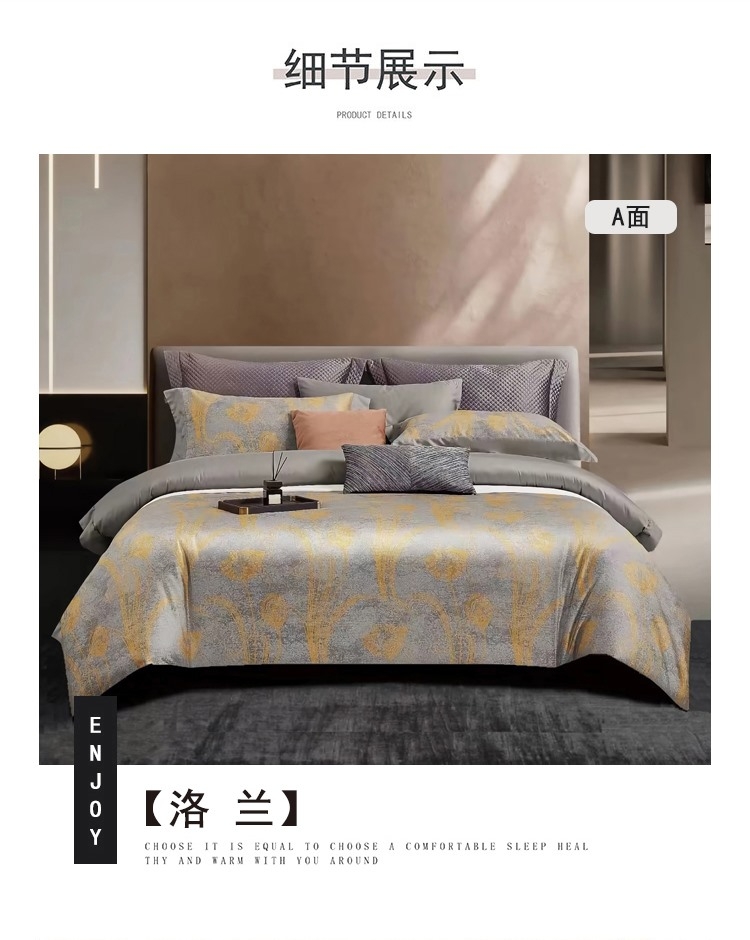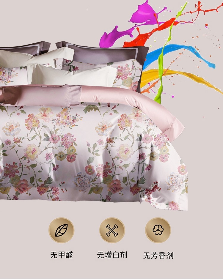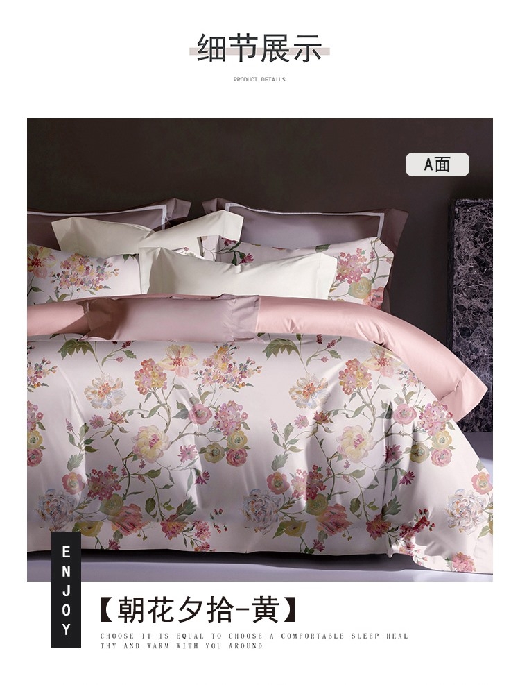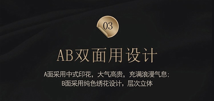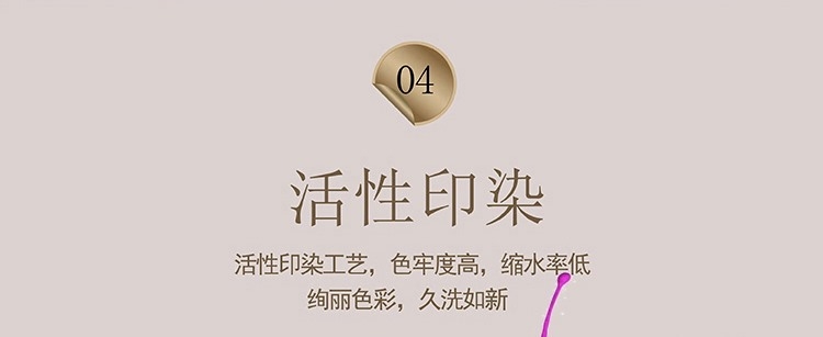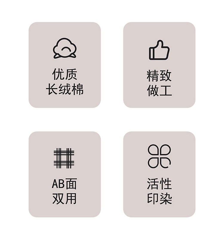 面料选用优质长绒棉,触感丝滑;AB双面用设计,高贵大气,层次立体;活性印染工艺,色彩绚丽,色牢度高,久洗如新