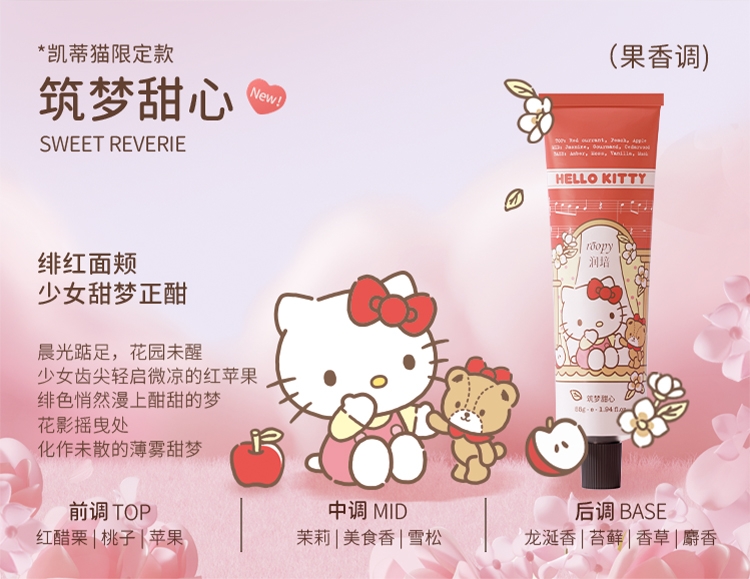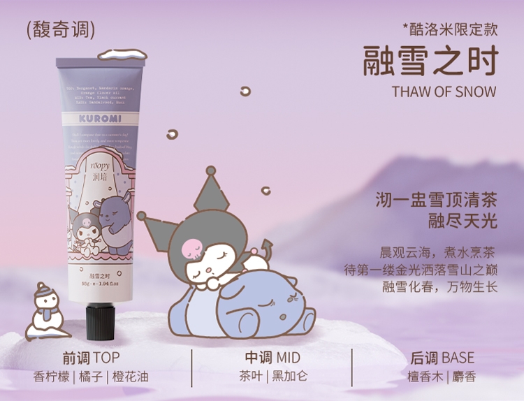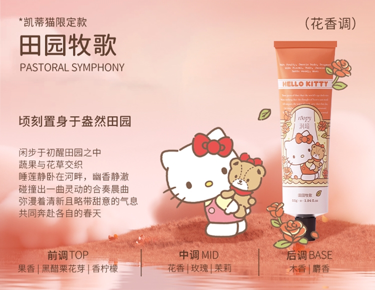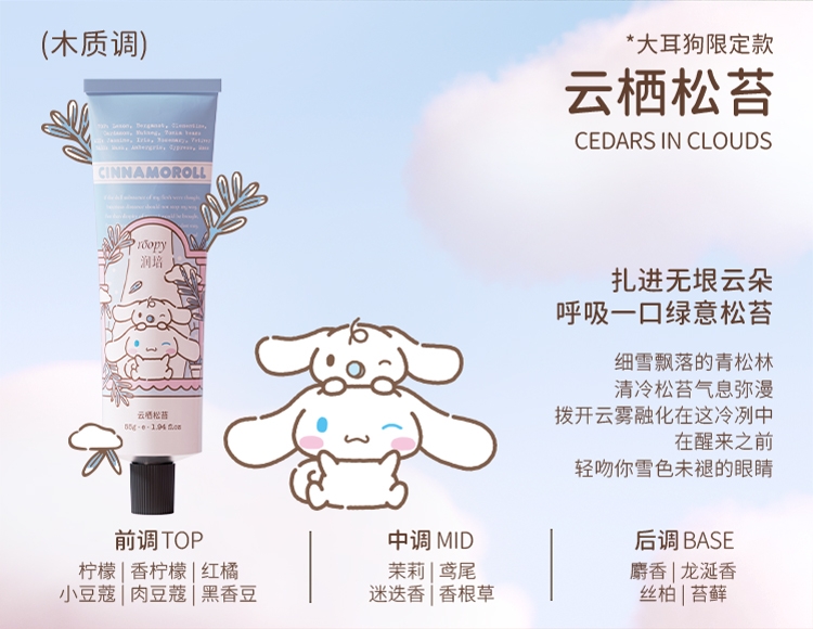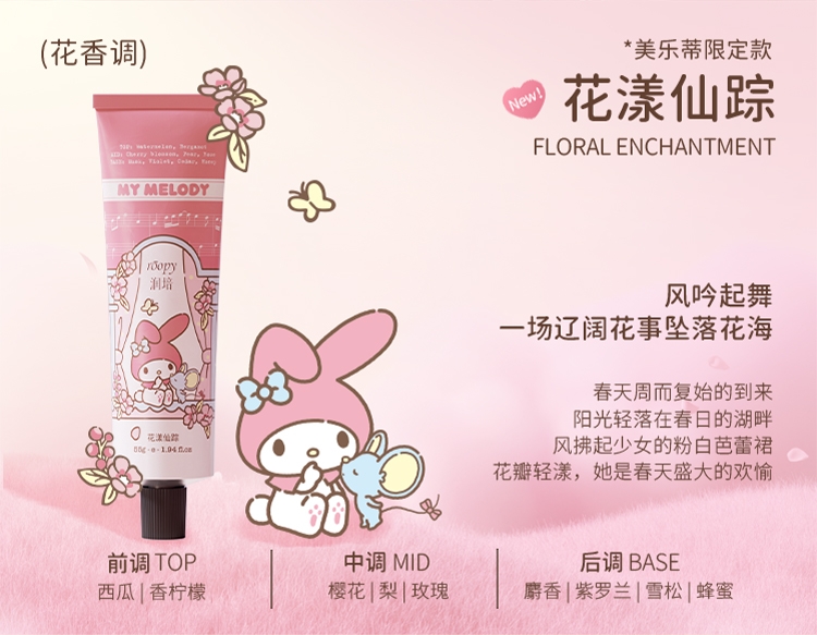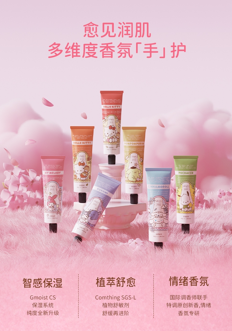 三丽鸥家族合作系列限量款,可爱与实力的结合;随手润护,水润轻盈,改善干痒,温和舒缓,改善倒刺;携手百年香料世家专研香氛情绪密码,特调高定香氛