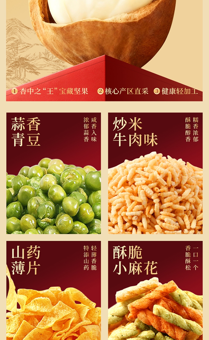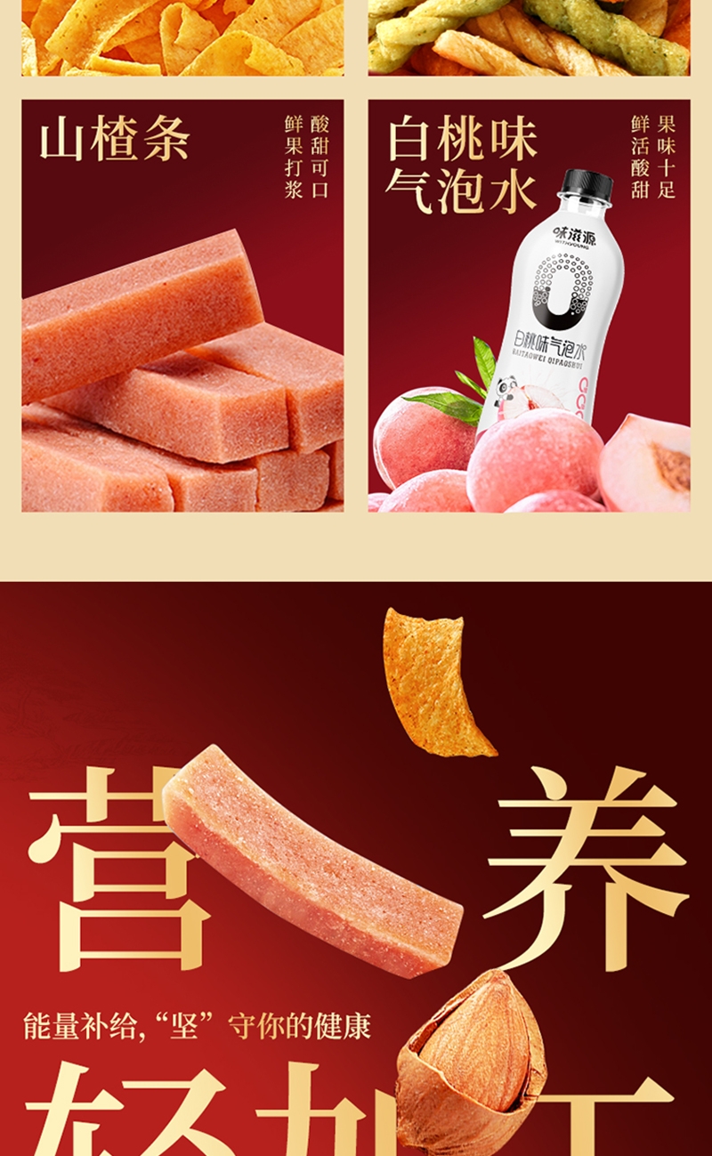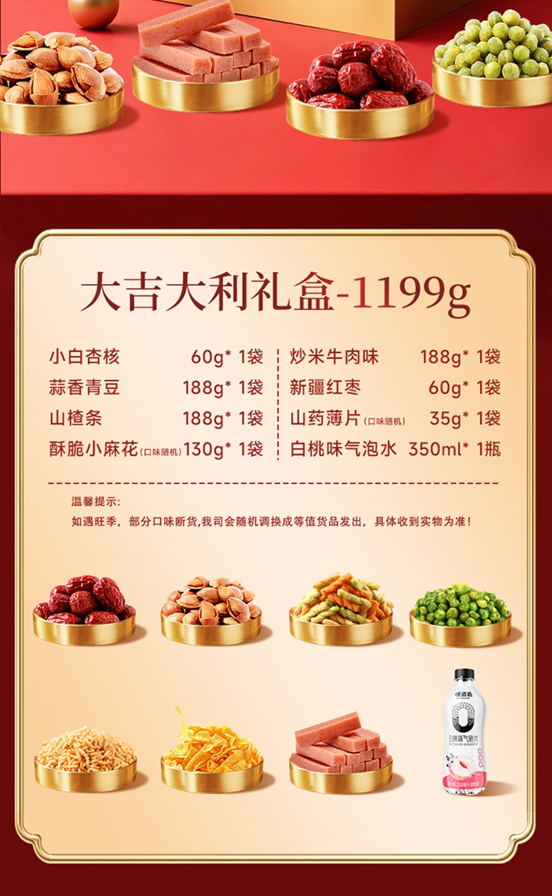 配置清单:白桃味气泡水350ml 蒜香青豆188g(红色款) 山楂条188g(红色款) 小白杏60g 小麻花130g(随机) 炒米牛肉味188g 红枣60g 山药薄片35g