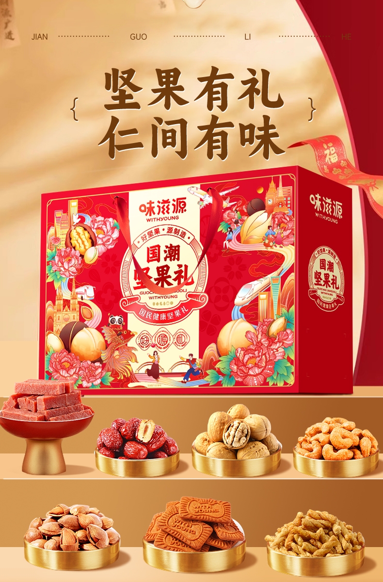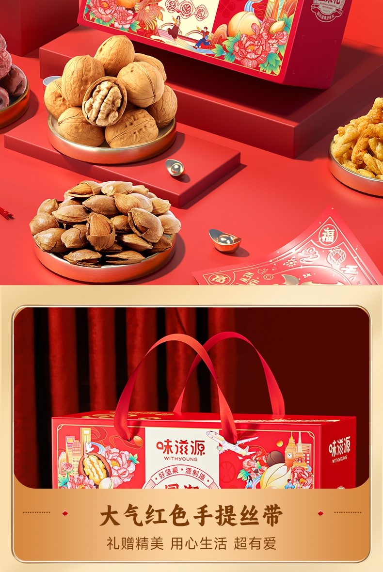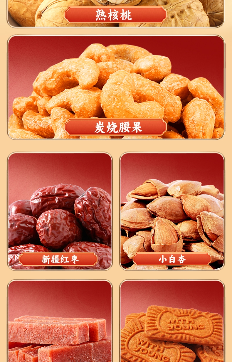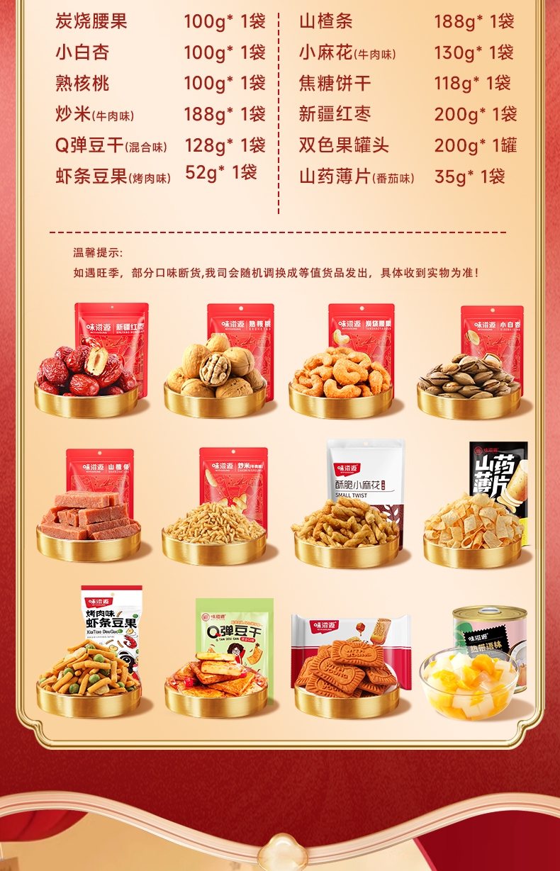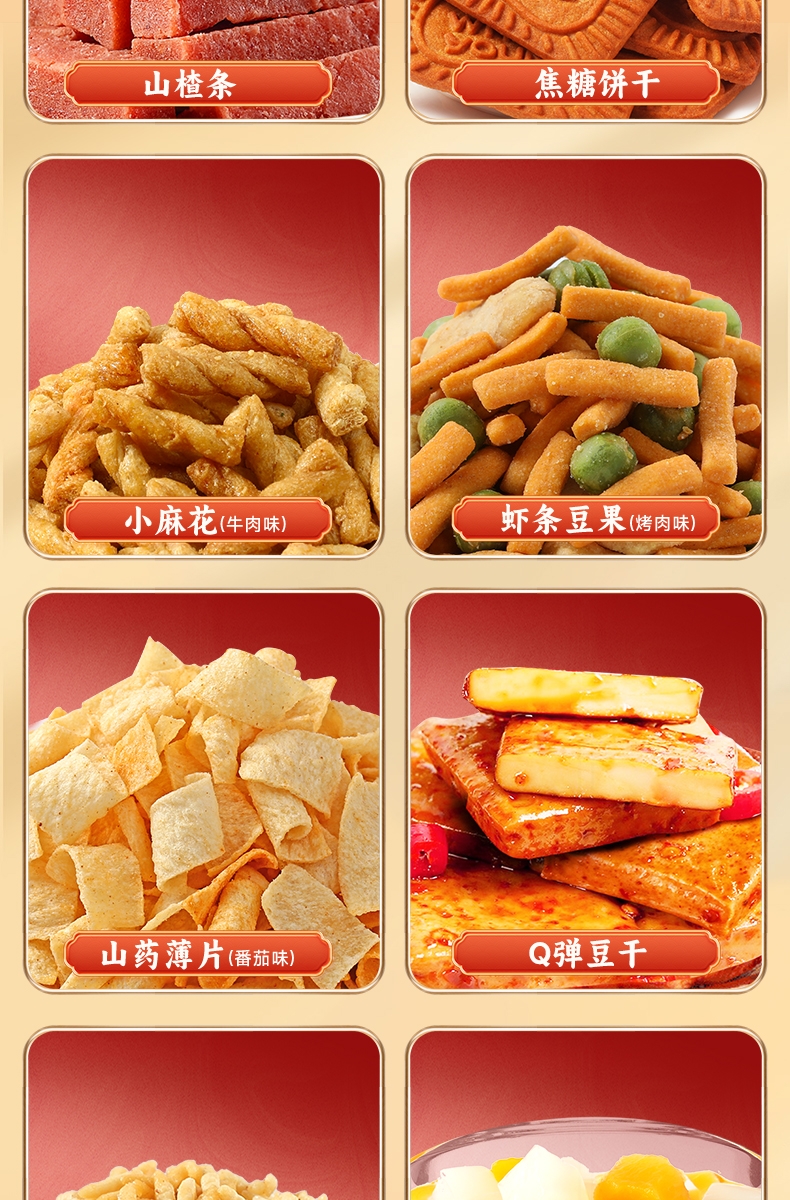 配置清单:Q弹豆干128g混合味 山药薄片(农家番茄味)35g 虾条豆果52g(烤肉味) 小白杏100g(红色款) 熟核桃100g(红色款) 炭烧腰果100g(红色款) 山楂条188g(红色款) 炒米牛肉味188g(红色款) 新疆红枣200g 小麻花130g(随机) 焦糖饼干118g 双色果罐头200g