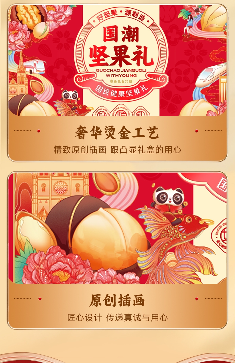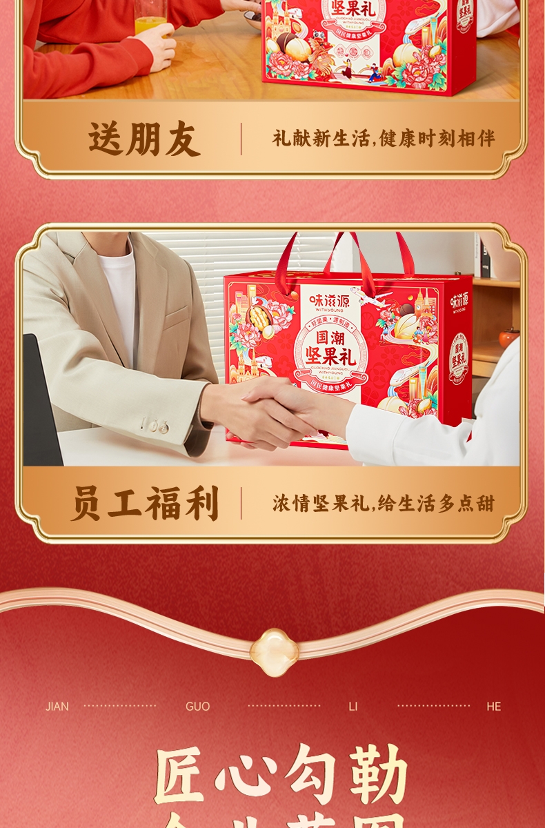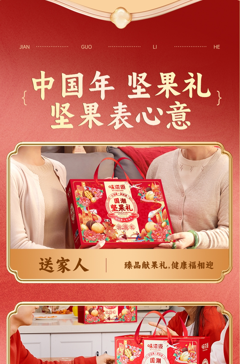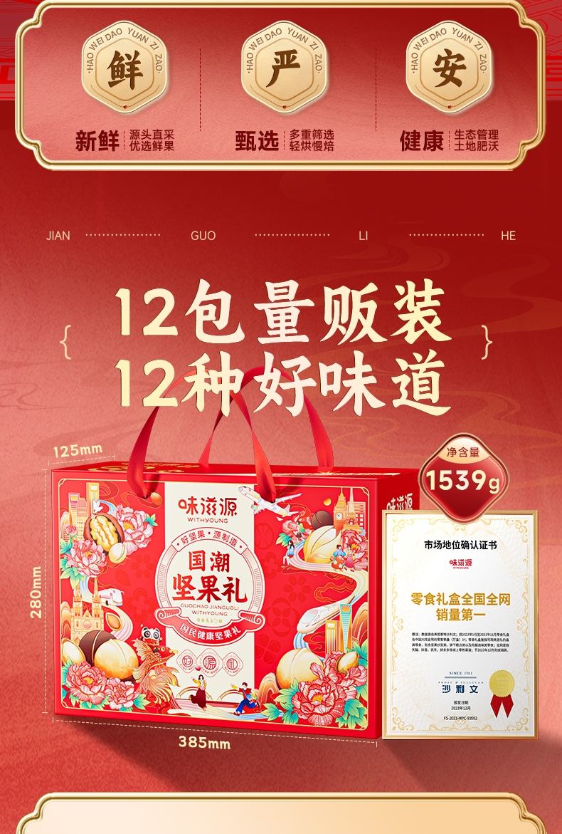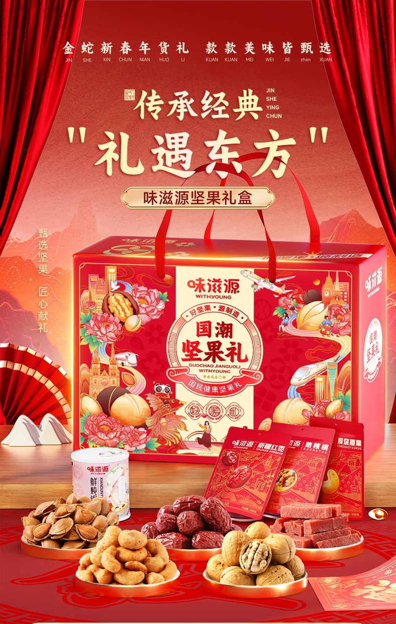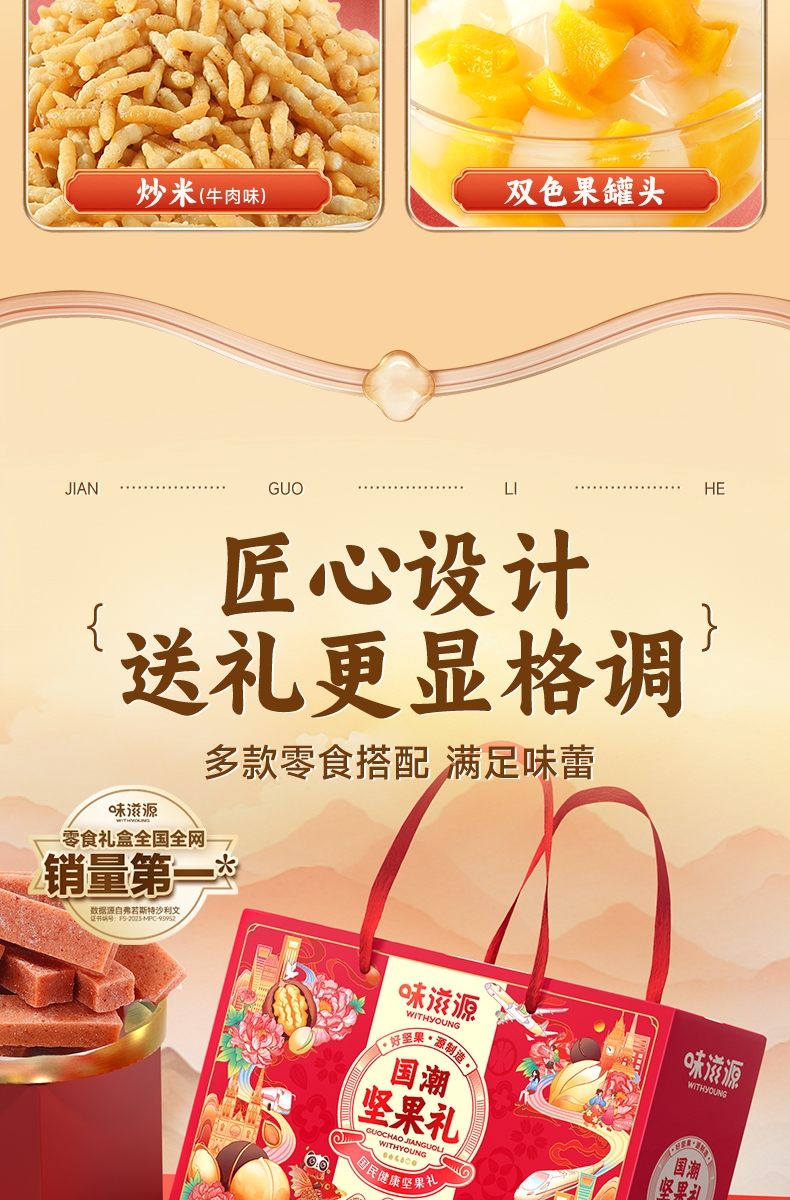 配置清单:Q弹豆干128g混合味 山药薄片(农家番茄味)35g 虾条豆果52g(烤肉味) 小白杏100g(红色款) 熟核桃100g(红色款) 炭烧腰果100g(红色款) 山楂条188g(红色款) 炒米牛肉味188g(红色款) 新疆红枣200g 小麻花130g(随机) 焦糖饼干118g 双色果罐头200g