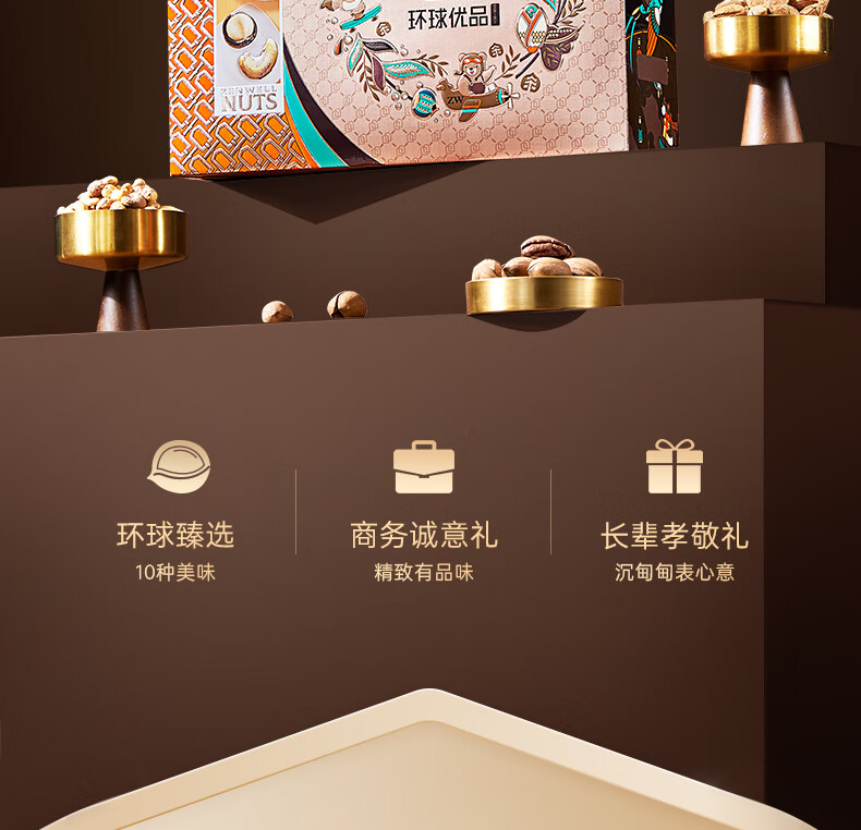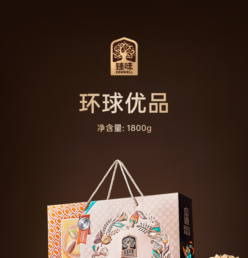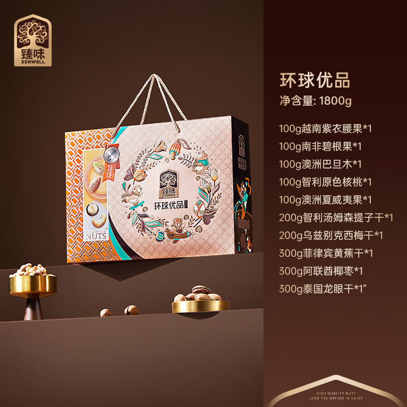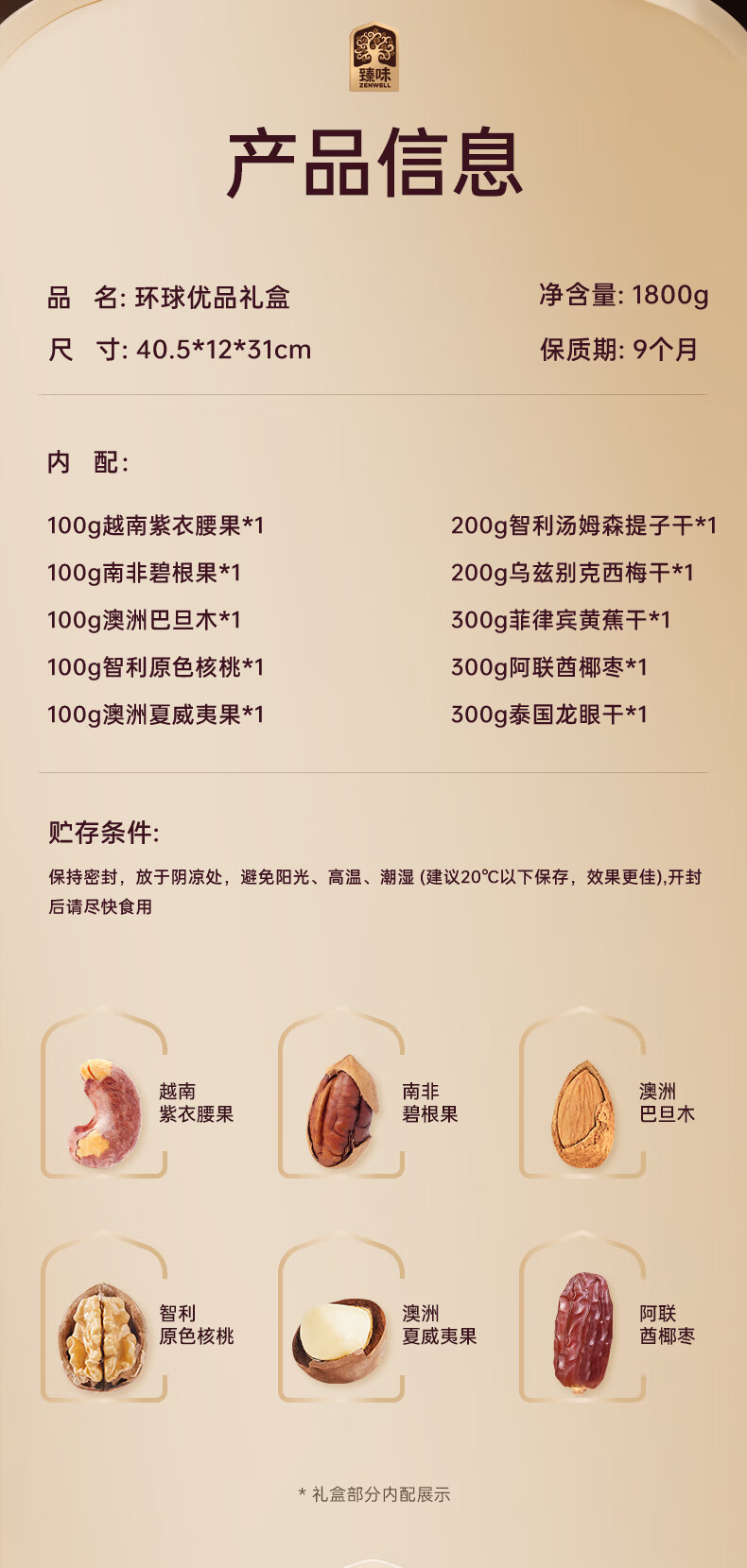 配置:100g越南紫衣腰果*1 100g南非碧根果*1 100g澳洲巴旦木*1 100g智利原色核桃*1 100g澳洲夏威夷果*1 200g智利汤姆森提子干*1 200g乌兹别克西梅干*1 300g菲律宾黄蕉干*1 300g阿联酋椰枣*1 300g泰国龙眼干*1