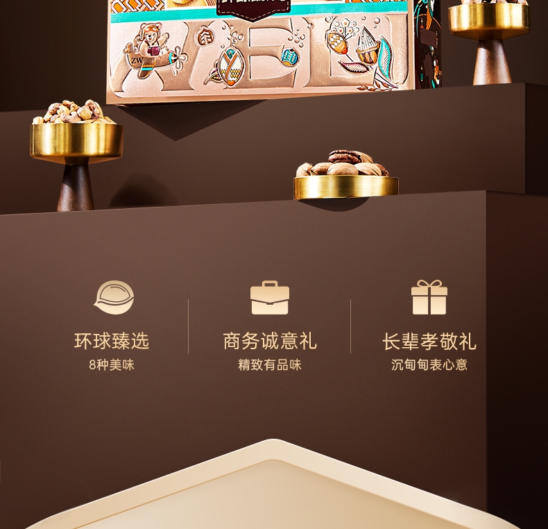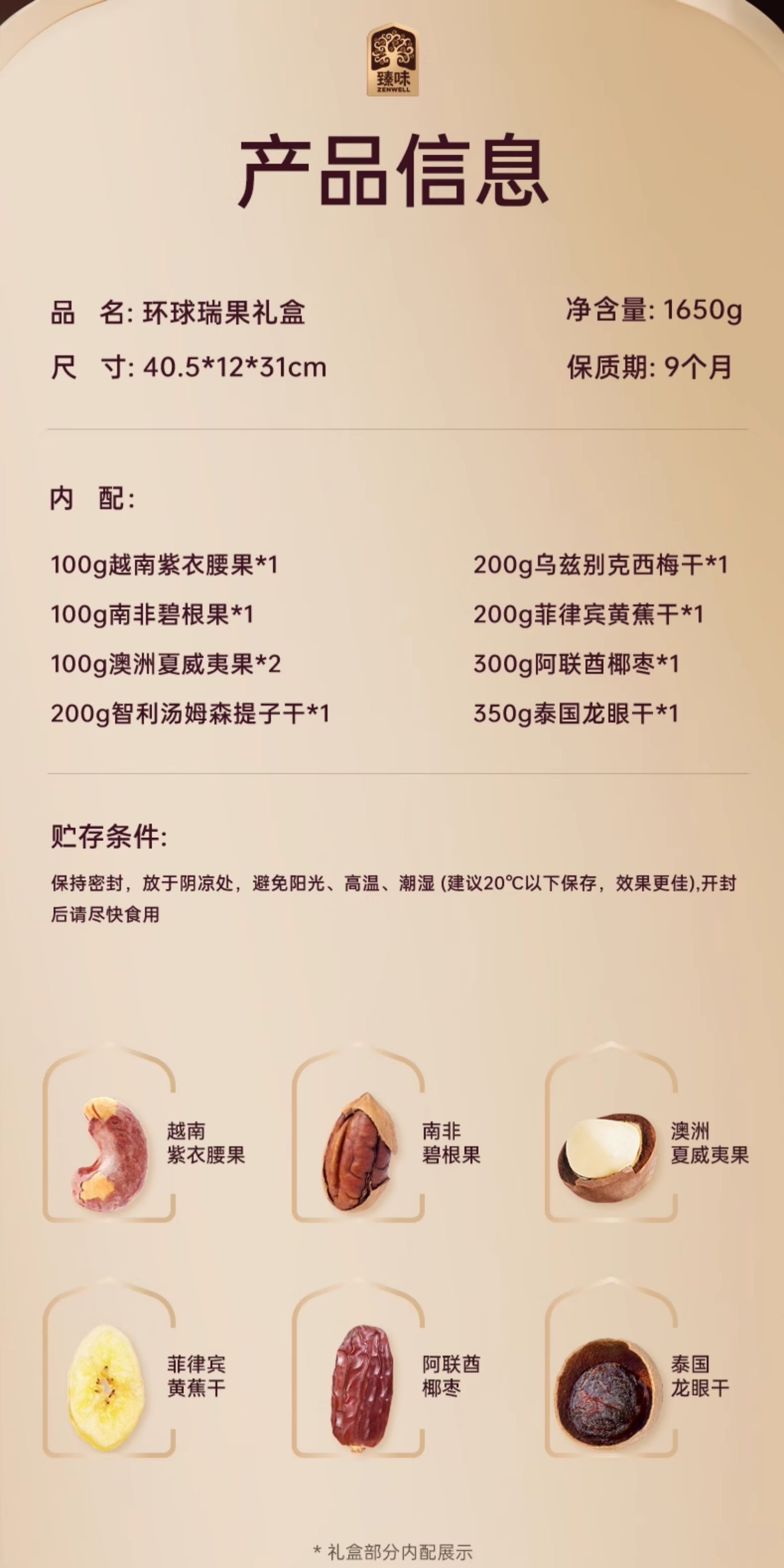配置:100g越南紫衣腰果*1 100g南非碧根果*1 100g澳洲夏威夷果*2 200g智利汤姆森提子干*1 200g乌兹别克西梅干*1 200g菲律宾黄蕉干*1 300g阿联酋椰枣*1 350g泰国龙眼干*1