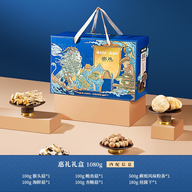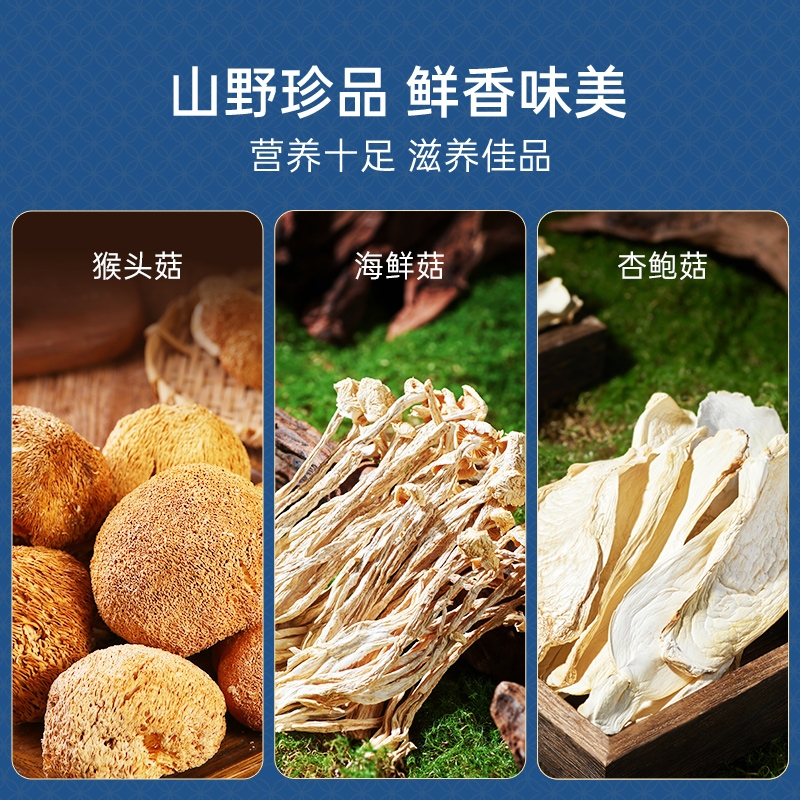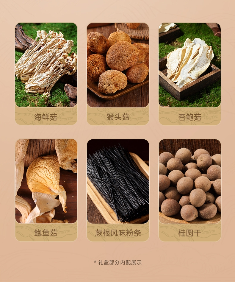 配置:100g猴头菇*1 100g海鲜菇*1 100g鲍鱼菇*1 100g杏鲍菇*1 500g蕨根风味粉条*1 180g桂圆干*1