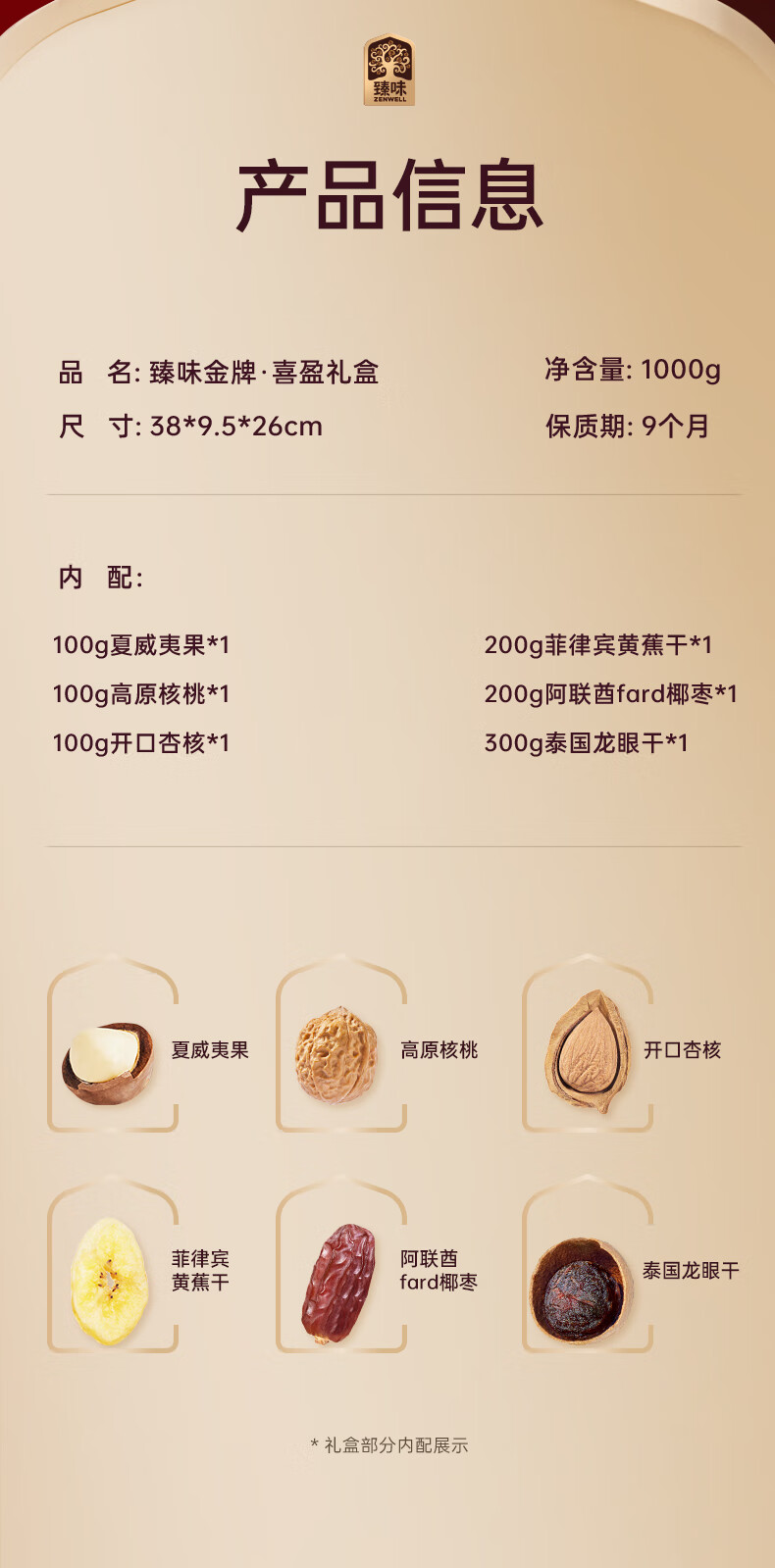 配置:100g夏威夷果*1 100g高原核桃*1 100g开口杏核*1 200g菲律宾黄蕉干*1 200g阿联酋fard椰枣*1 300g泰国龙眼干*1