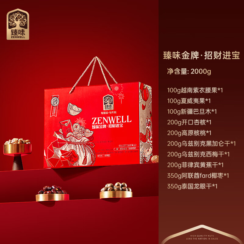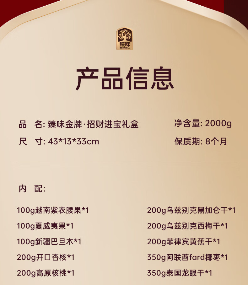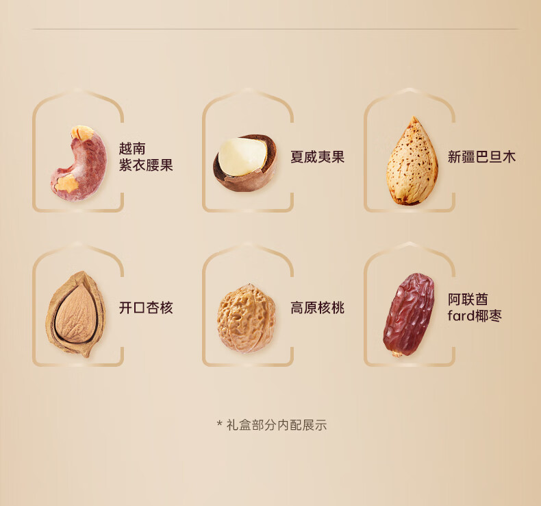配置:100g越南紫衣腰果*1 100g夏威夷果*1 100g新疆巴旦木*1 200g开口杏核*1 200g高原核桃*1 200g乌兹别克黑加仑干*1 200g乌兹别克西梅干*1 200g菲律宾黄蕉干*1 350g阿联酋fard椰枣*1 350g泰国龙眼干*1