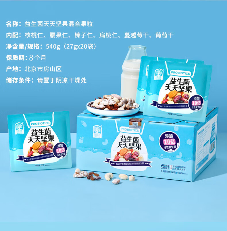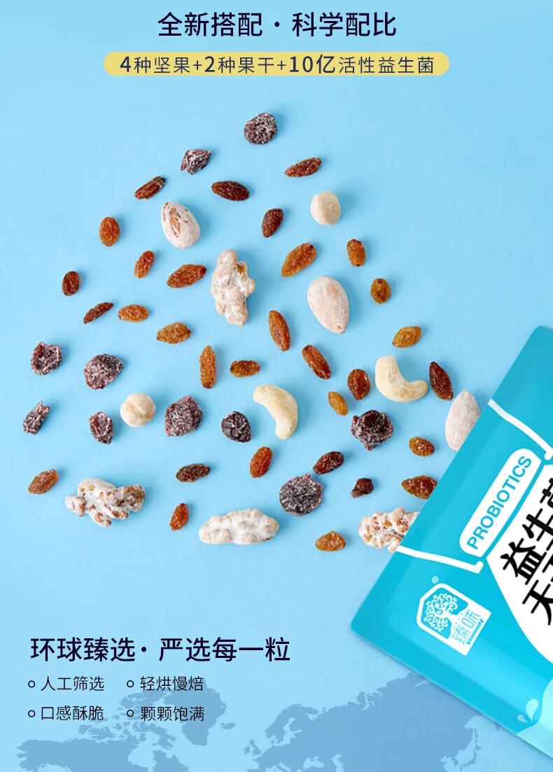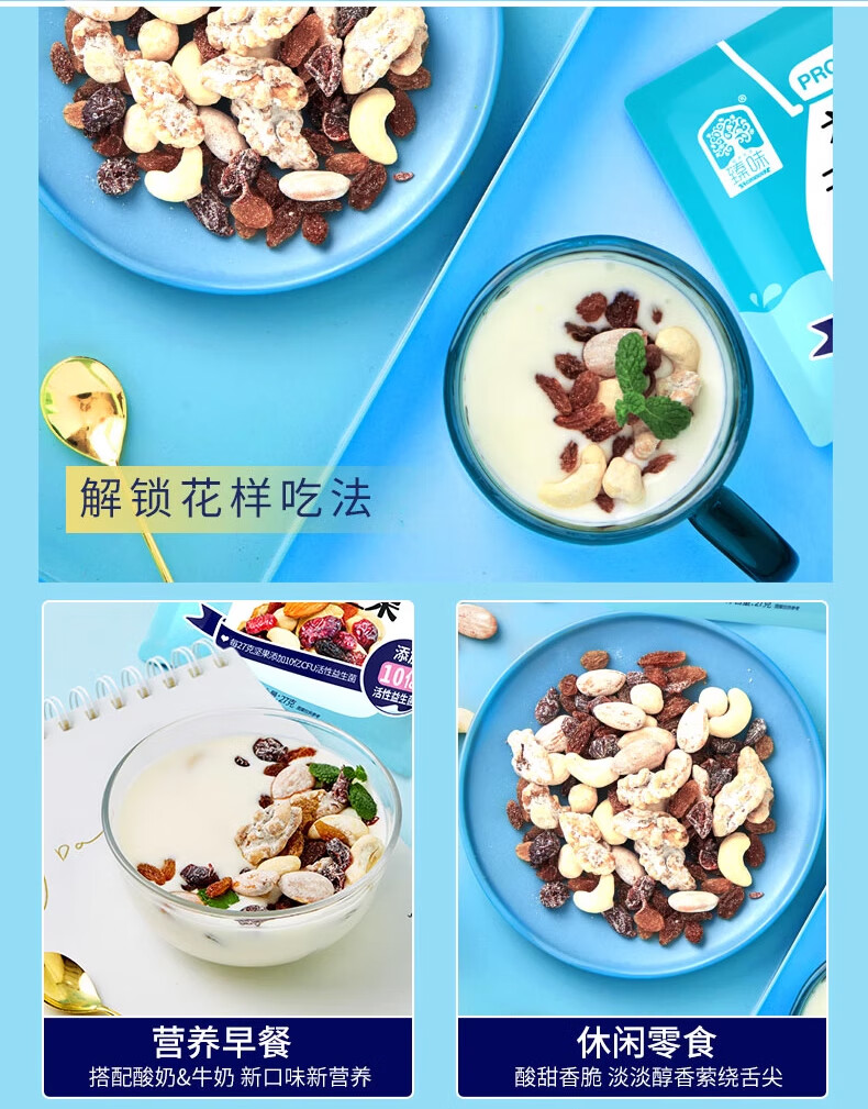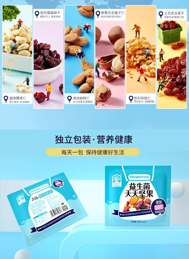 内配:越南腰果仁 美国核桃仁 美国扁桃仁 土耳其榛子仁 美国蔓越莓干 澳大利亚金提干