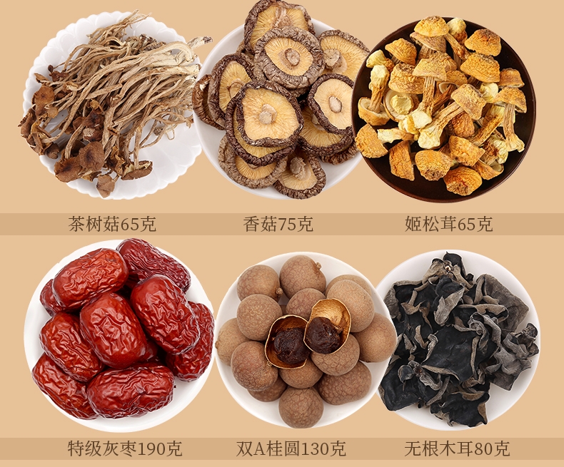 配置清单:香菇75克*1 茶树菇65克*1 姬松茸65克*1 无根木耳80克*1 特级灰枣190克*1 双A桂圆130克*1