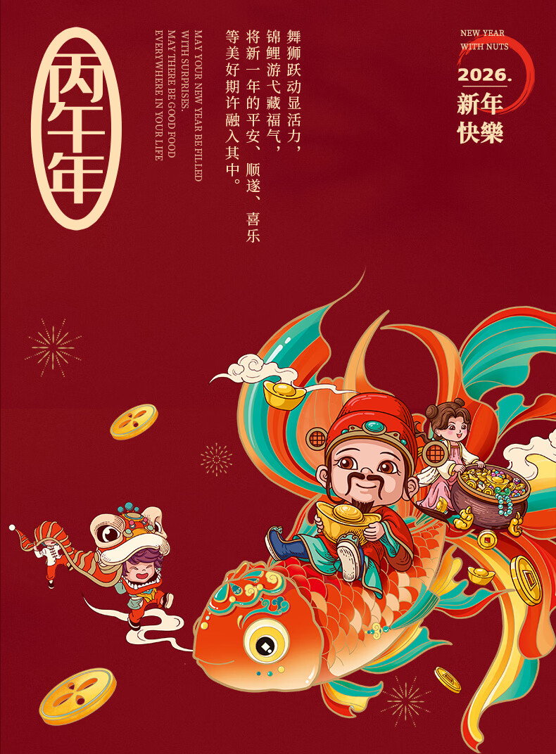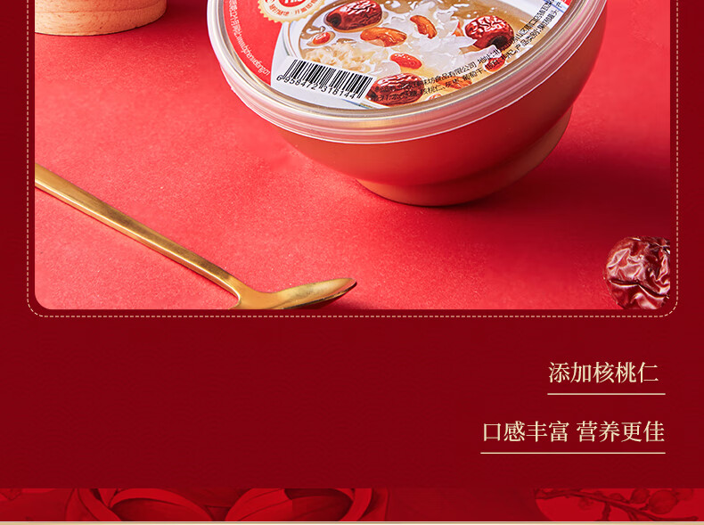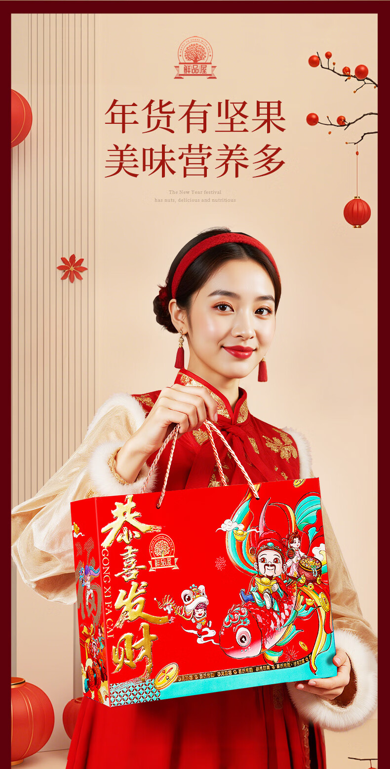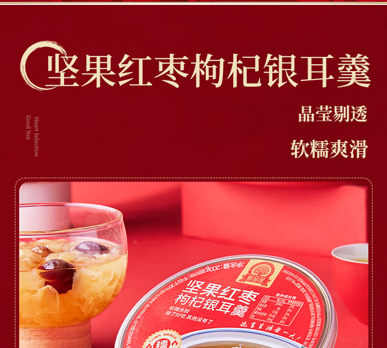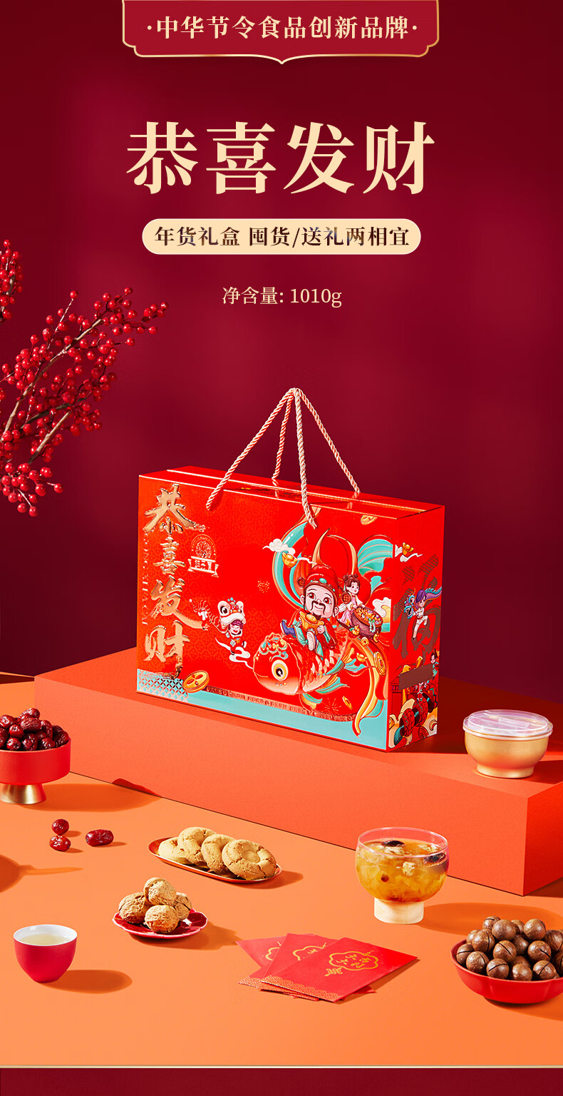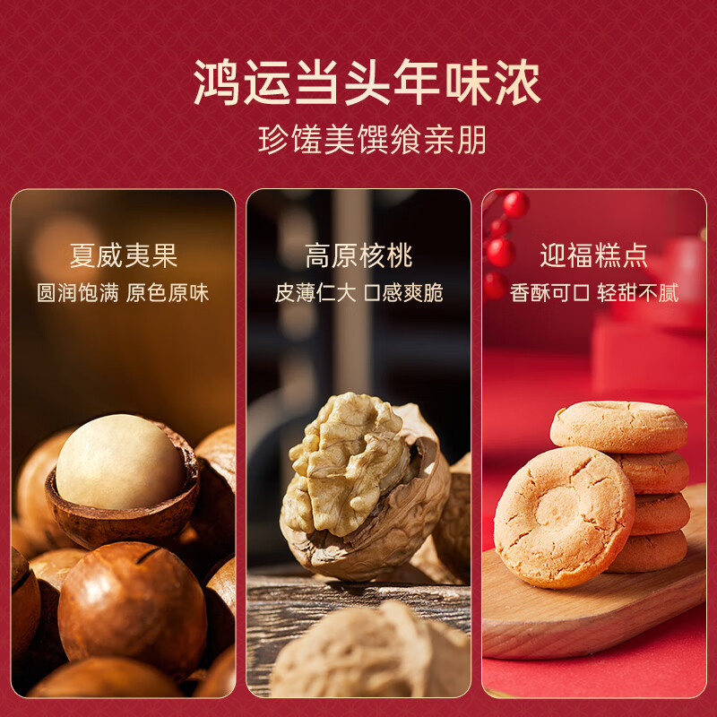 配置:80g夏威夷果*1 100g高原核桃*1 300g新疆灰枣*1 22g迎福糕点*15 200g坚果红枣枸杞银耳羹*1