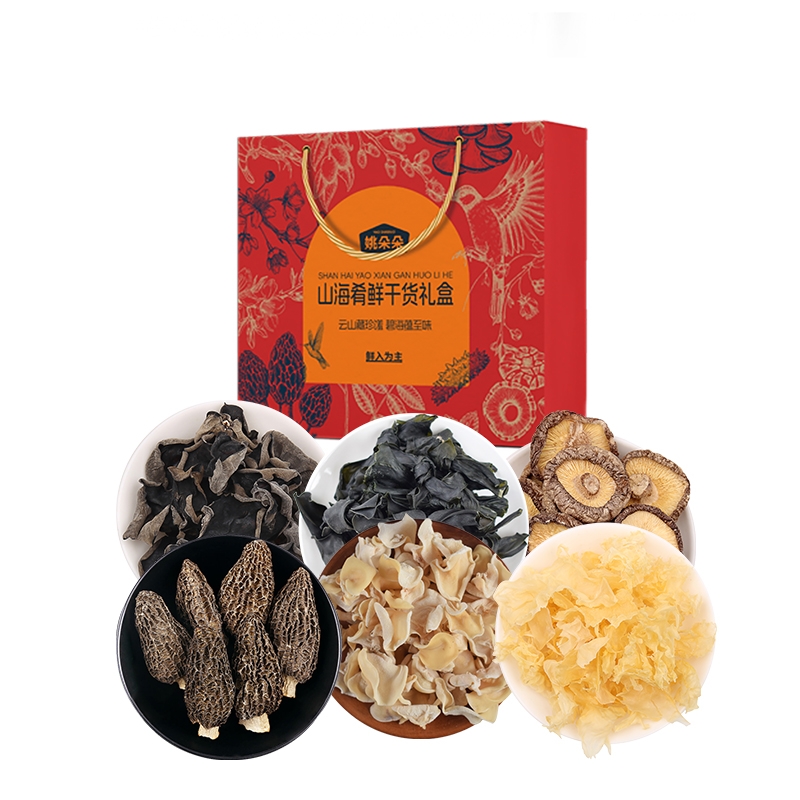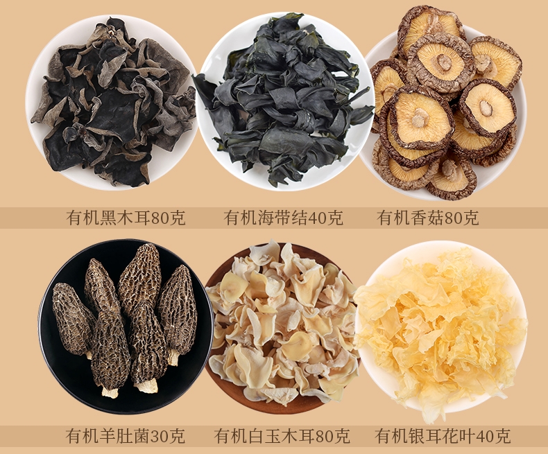 配置清单:有机黑木耳80克*1 有机羊肚菌30克*1 有机白玉木耳80克*1 有机海带结40克*1 有机香菇80克*1 有机银耳花叶40克*1