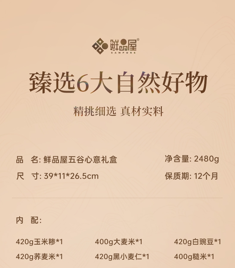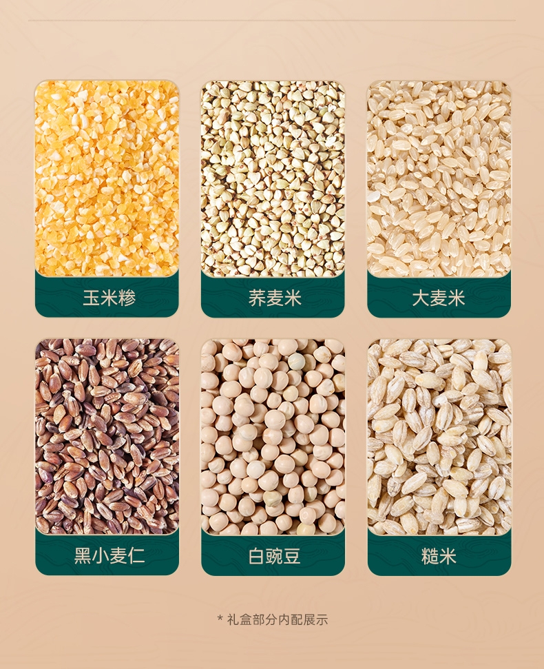 配置:420g玉米糁*1 420g荞麦米*1 400g大麦米*1 420g黑小麦仁*1 420g白豌豆*1 400g糙米*1