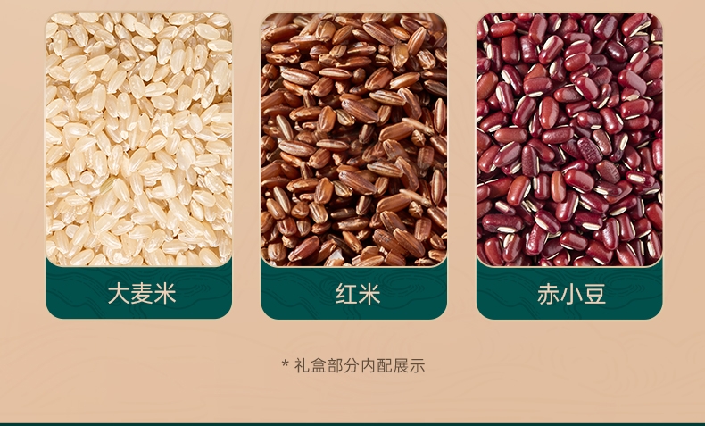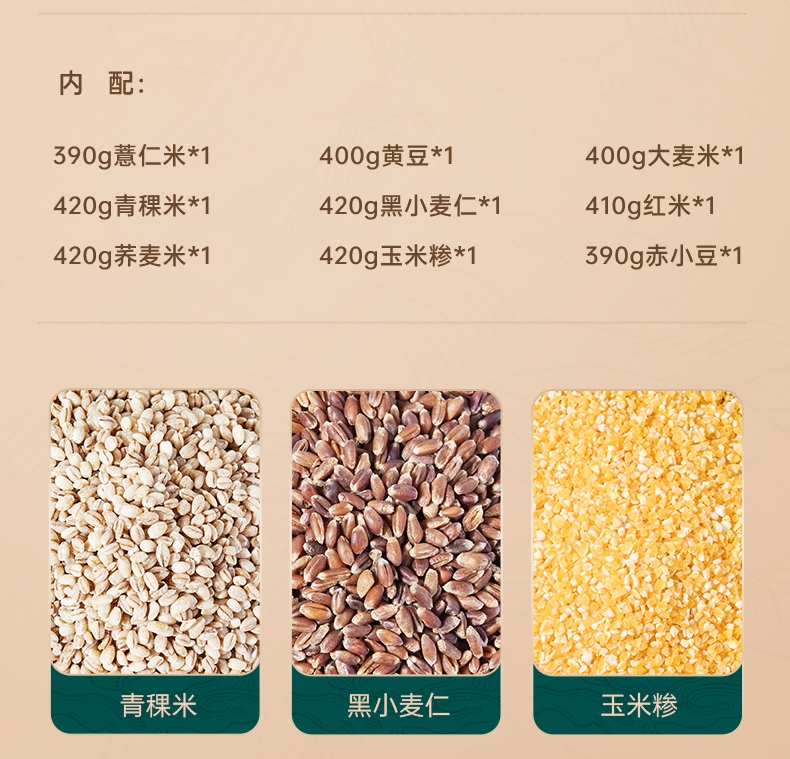 配置:390g薏仁米*1 420g青稞米*1 420g荞麦米*1 400g黄豆*1 420g黑小麦仁*1 420g玉米糁*1 400g大麦米*1 410g红米*1 390g赤小豆*1
