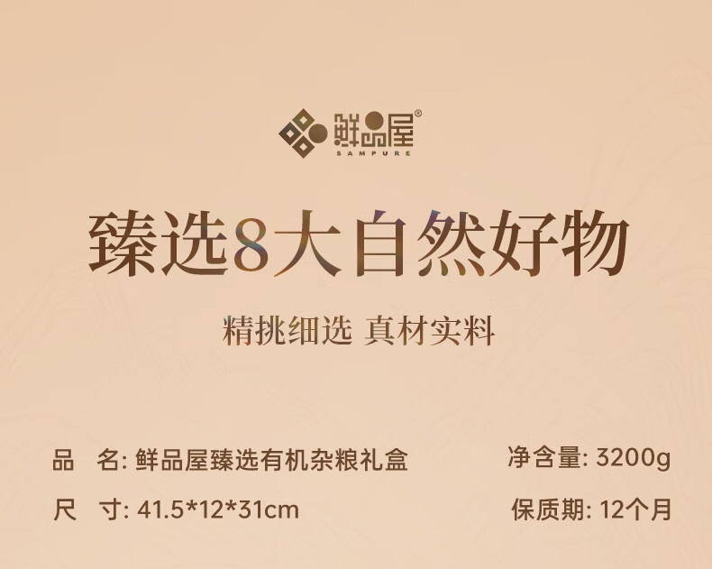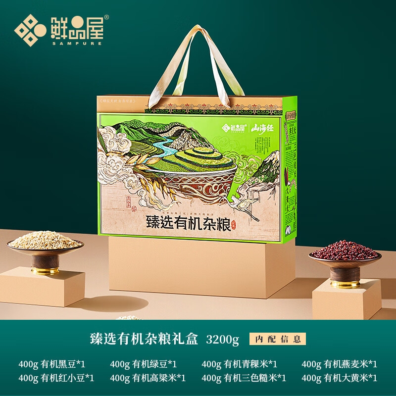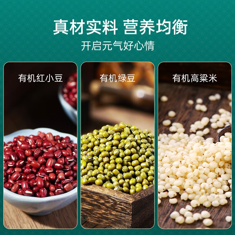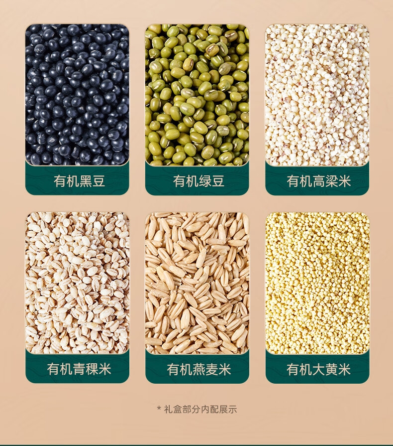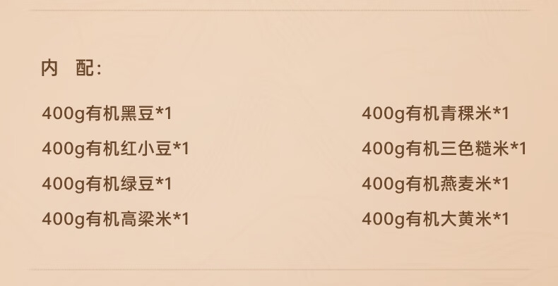 配置:400g有机黑豆*1 400g有机红小豆*1 400g有机绿豆*1 400g有机高梁米*1 400g有机青稞米*1 400g有机三色糙米*1 400g有机燕麦米*1 400g有机大黄米*1
