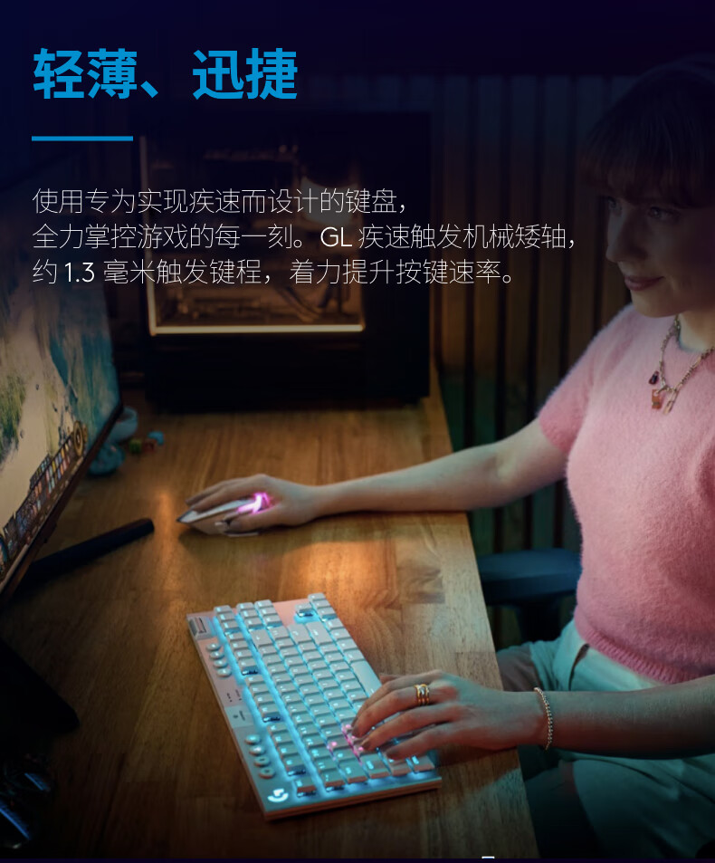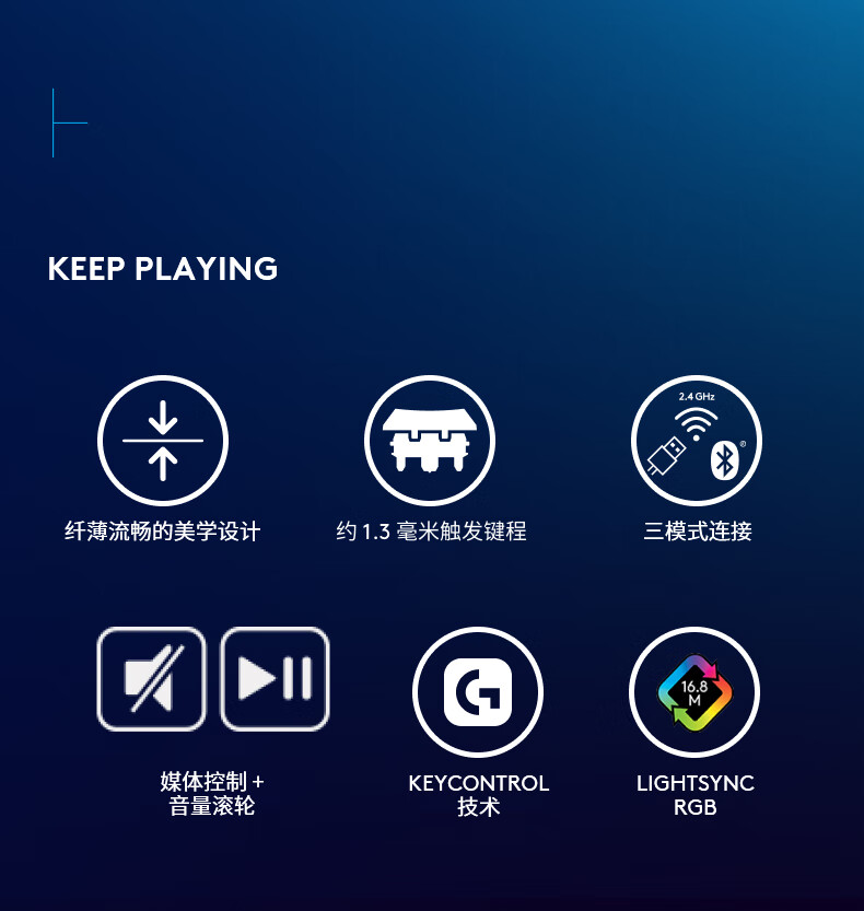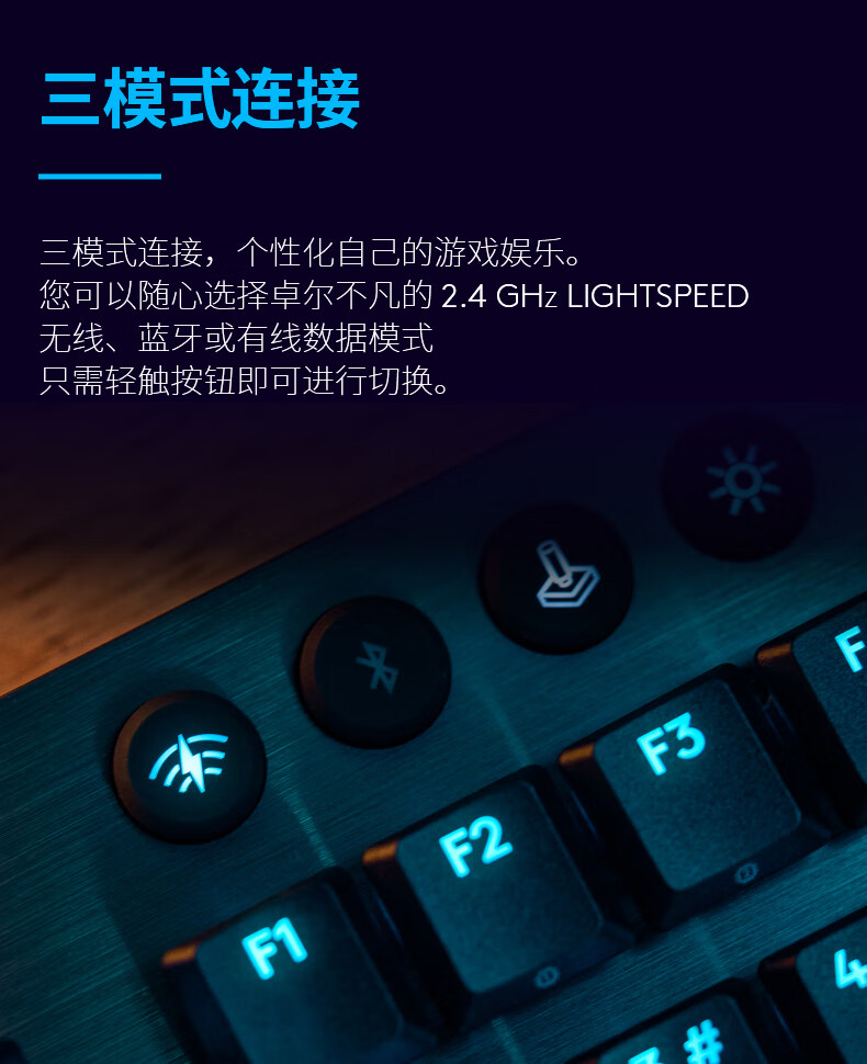 纤薄流畅的美学设计;约1.3毫米触发键程;三模式连接