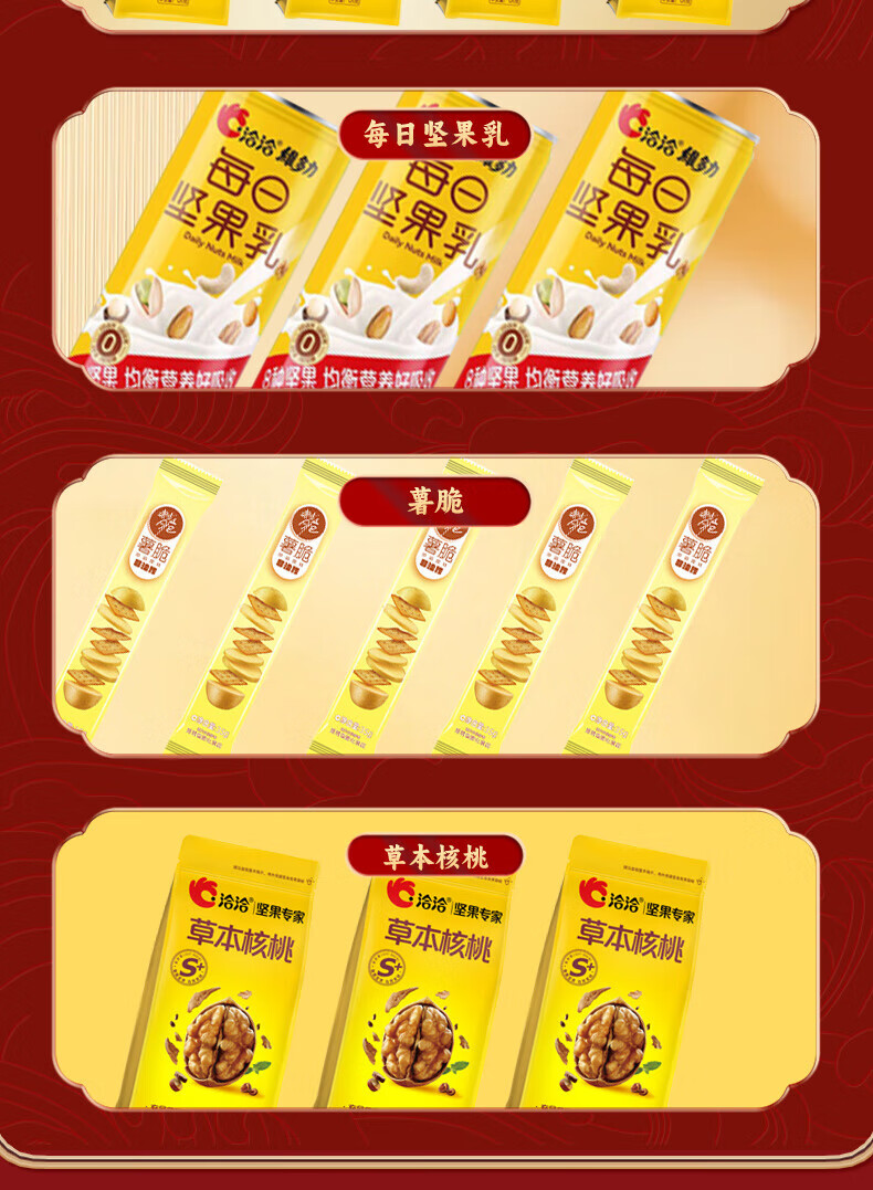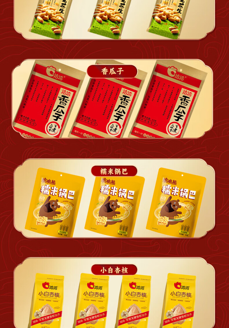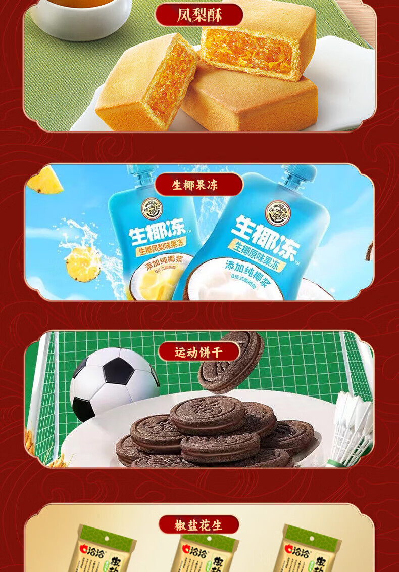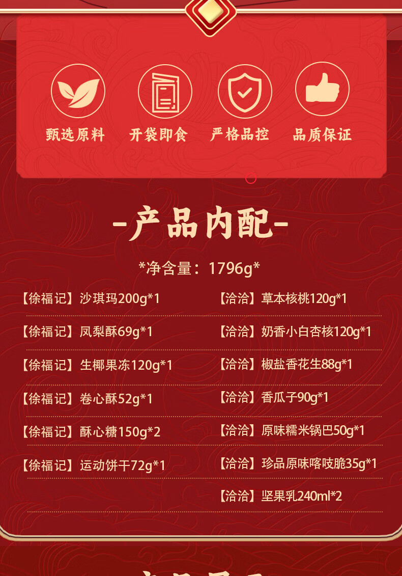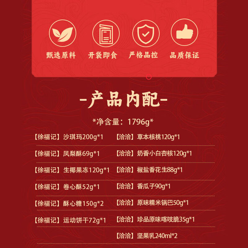- 配置:【徐福记】沙琪玛200g*1 【徐福记】凤梨酥69g*1 【徐福记】生椰果冻120g*1 【徐福记】卷心酥52g*1 【徐福记】酥心糖150g*2 【雀巢】运动饼干72g*1 【洽洽】草本核桃120g*1 【洽洽】奶香小白杏核120g*1 【洽洽】椒盐香花生88g*1 【洽洽】香瓜子90g*1 【洽洽】原味糯米锅巴50g*1 【洽洽】珍品原味喀吱脆35g*1 【洽洽】坚果乳240ml*2
