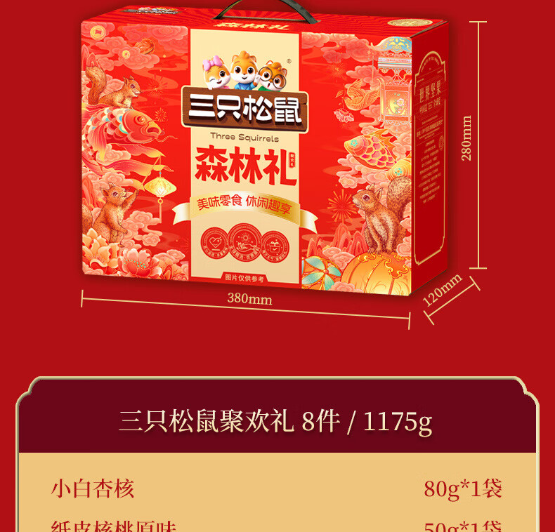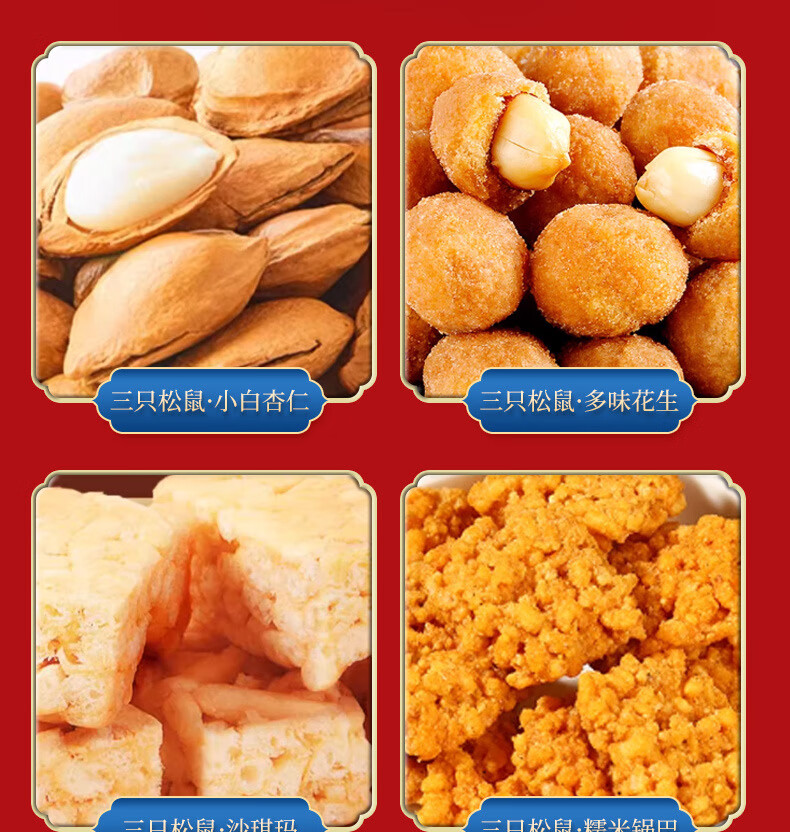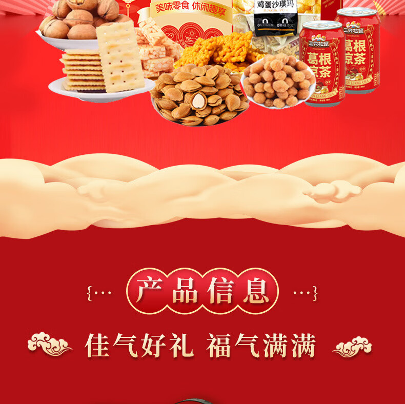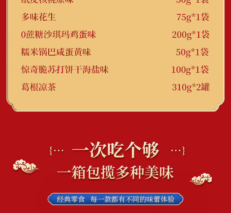 配置:小白杏核80g*1 纸皮核桃50g*1 多味花生75g*1 0蔗糖沙琪玛鸡蛋味200g*1 糯米锅巴咸蛋黄味50g*1 惊奇脆苏打饼干海盐味100g*1 葛根凉茶310ml*1 葛根凉茶310ml*1