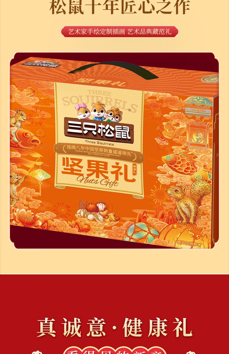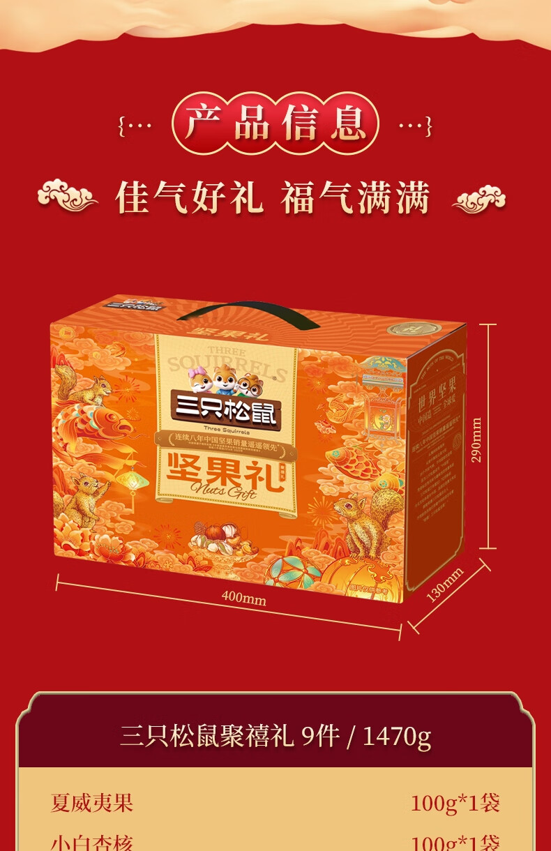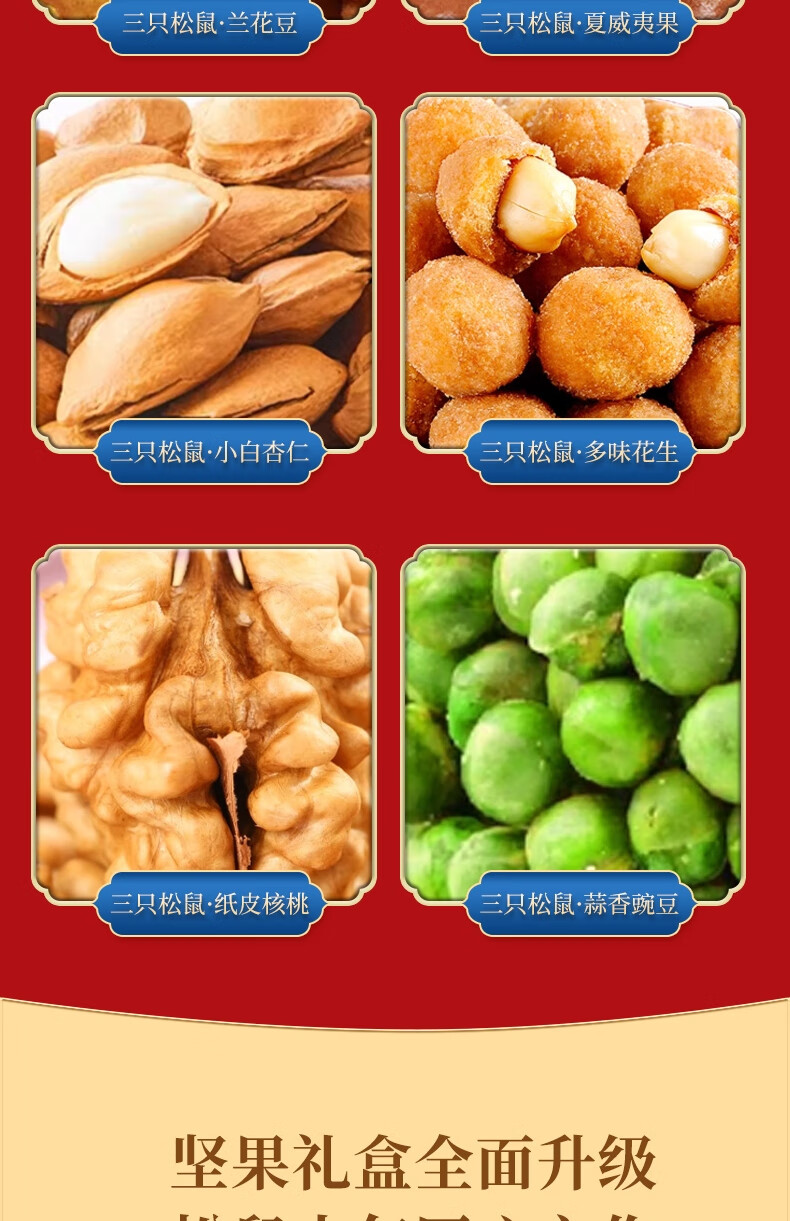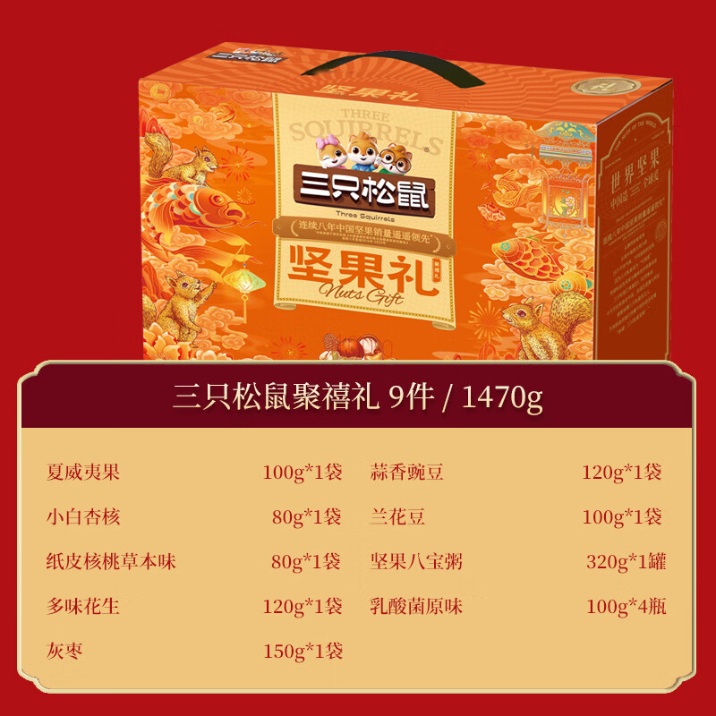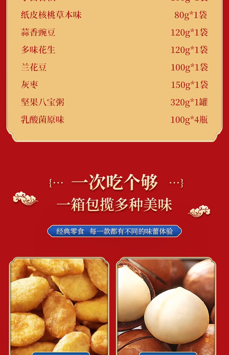 配置:夏威夷果100g*1 小白杏核80g*1 纸皮核桃草本味80g*1 多味花生120g*1 灰枣150g*1 蒜香豌豆120g*1 兰花豆100g*1 坚果八宝粥320g*1 乳酸菌原味100g*4