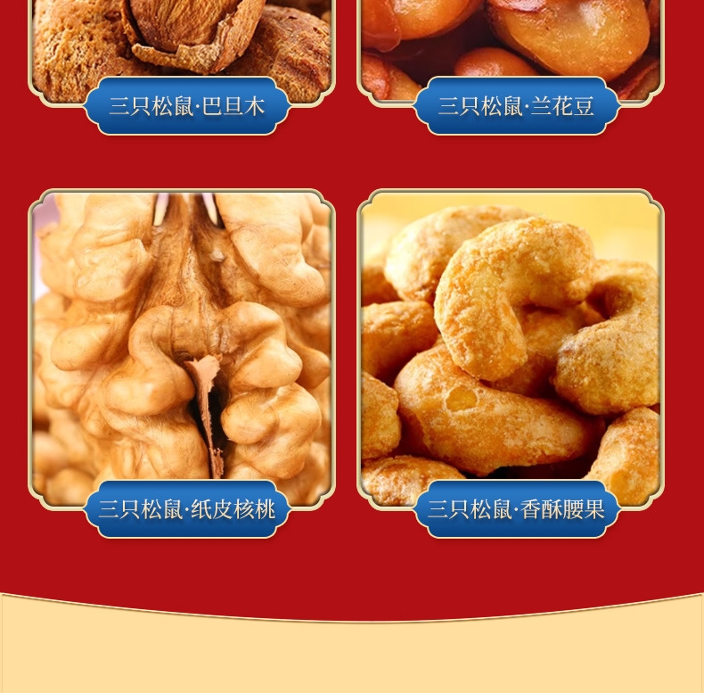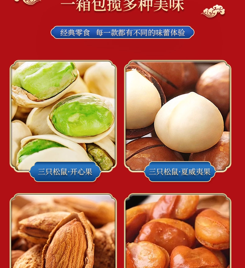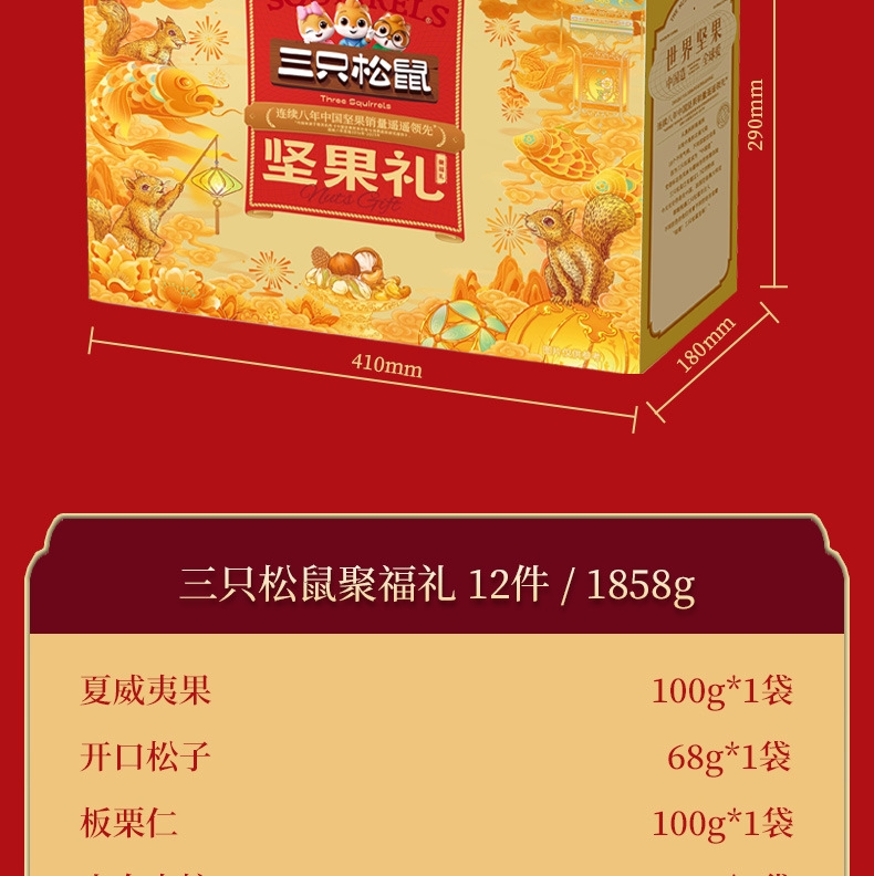 配置:夏威夷果100g*1 开口松子68g*1 板栗仁100g*1 小白杏核100g*1 开心果80g*1 纸皮核桃原味120g*1 手剥巴旦木100g*1 大头榛子100g*1 香酥腰果100g*1 小白杏核100g*1 灰枣250g*1 坚果八宝粥320g*1 坚果八宝粥320g*1