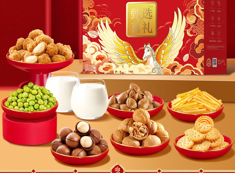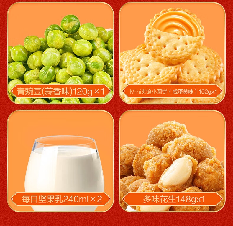 配置:奶香核桃100G 夏威夷果(奶香味)60G 手剥小白杏核(奶香味)60g 青豌豆(蒜香味)120g 多味花生148g Mini夹馅小圆饼(咸蛋黄味)102g 沙拉薯条45g 每日坚果乳240ml*2