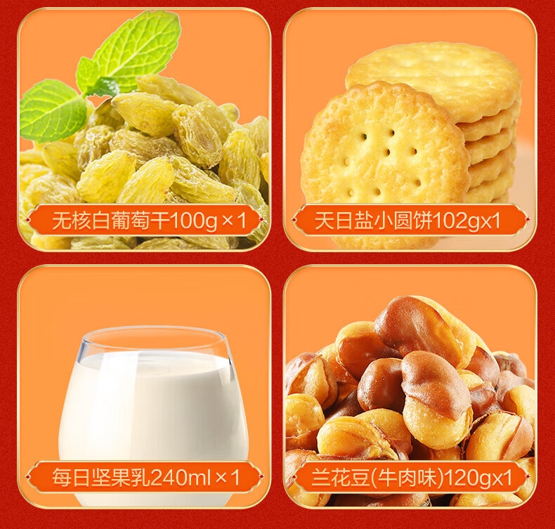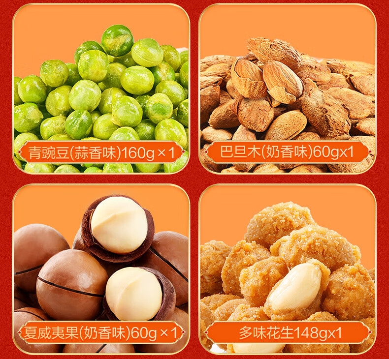 配置:夏威夷果(奶香味)60g 开心果60g 蟹香味腰果60g 手剥小白杏核60G 巴旦木(奶香味)60g 奶香核桃100g 多味花生148g 天日盐小圆饼102g 青豌豆(蒜香味)160g 无核白葡萄干100g 牛肉味兰花豆120g 每日坚果乳240ml