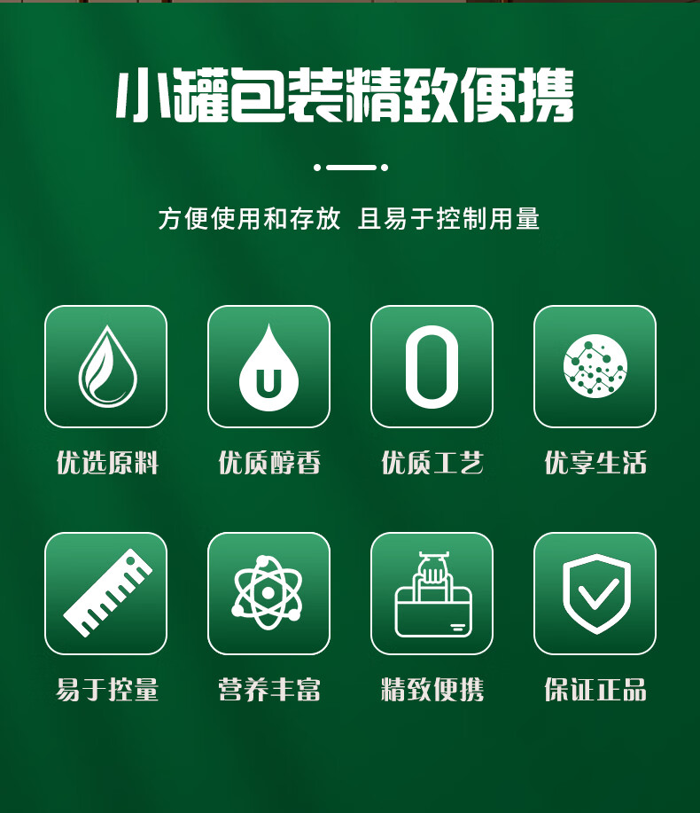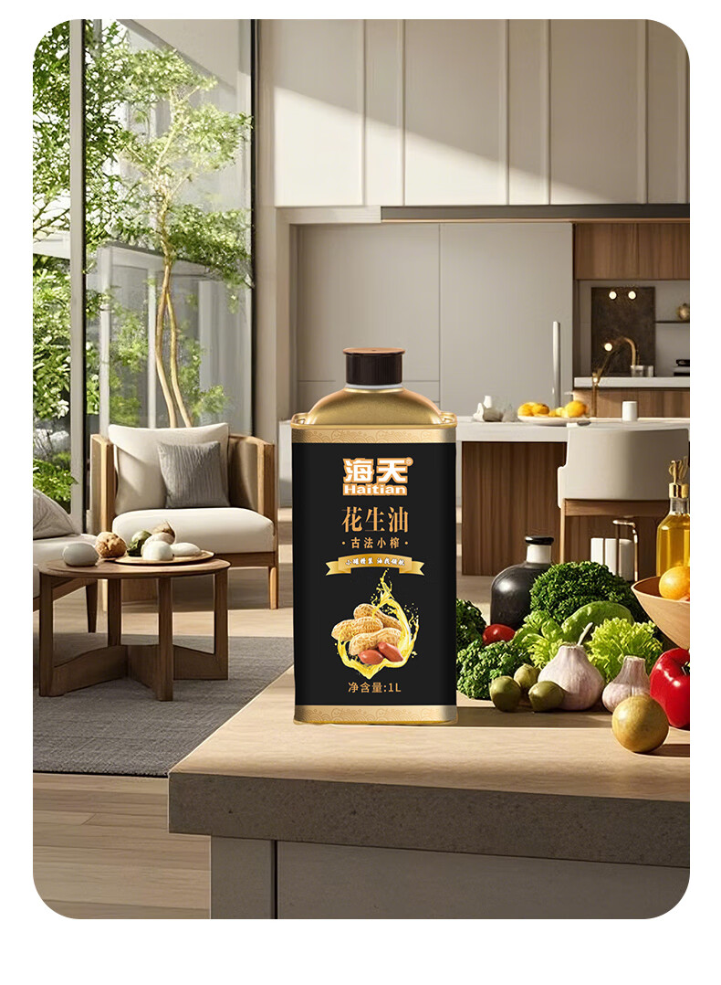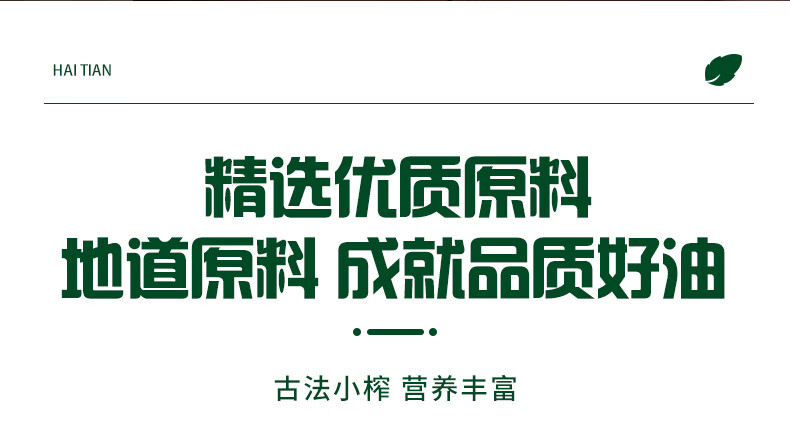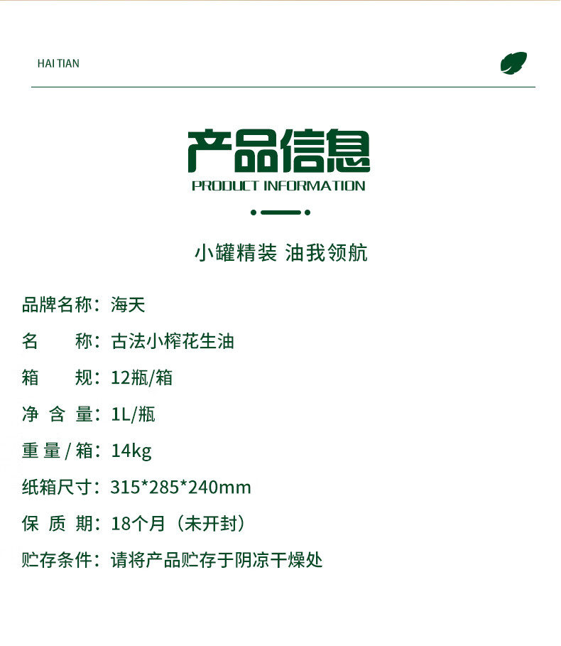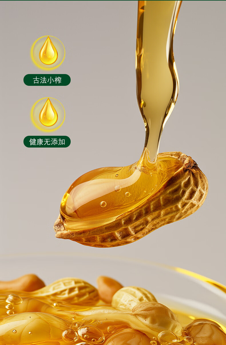 精选优质花生 颗粒饱满 粒粒精选;古法小榨 见精细 取初榨 得上品;低温沉降 锁住每一滴清香 更营养更健康