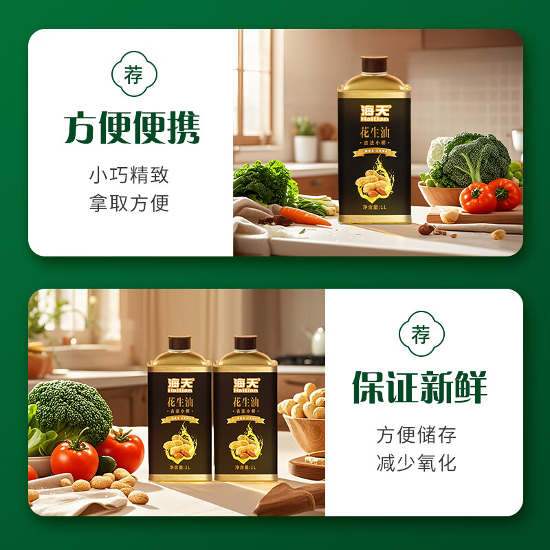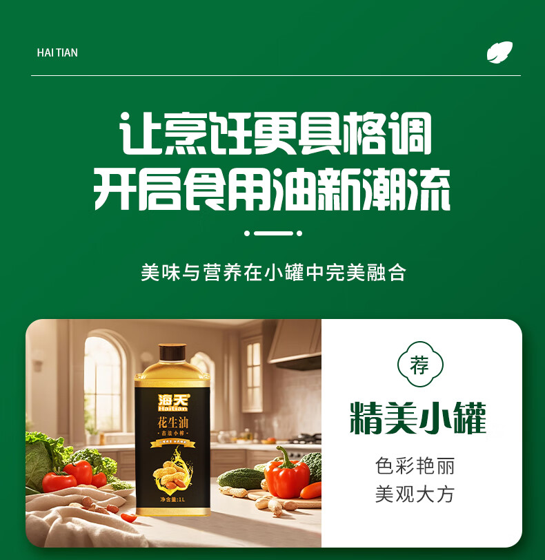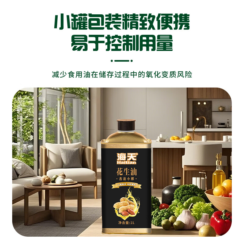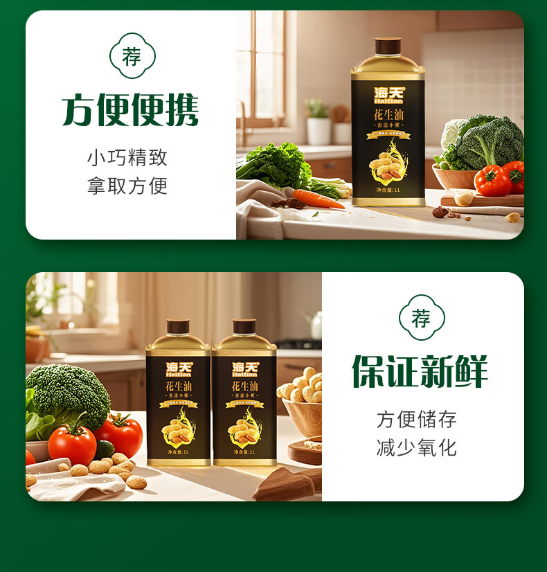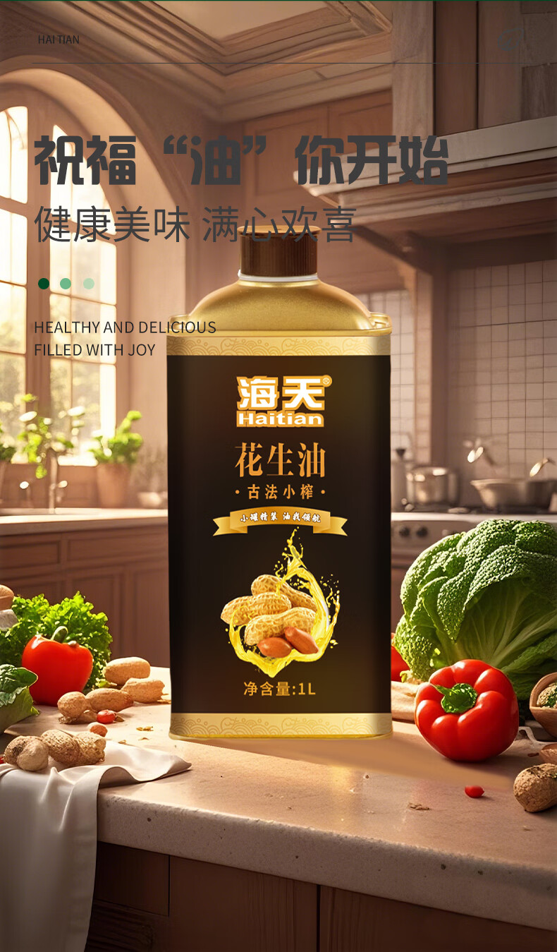 精选优质花生 颗粒饱满 粒粒精选;古法小榨 见精细 取初榨 得上品;低温沉降 锁住每一滴清香 更营养更健康