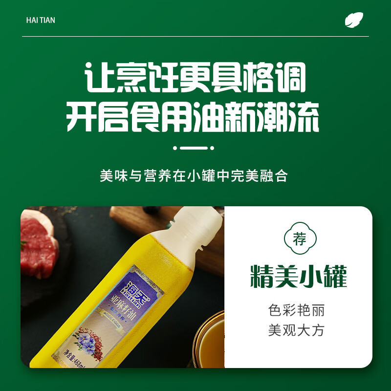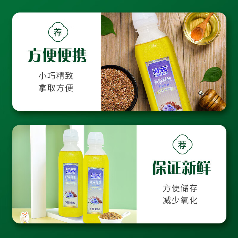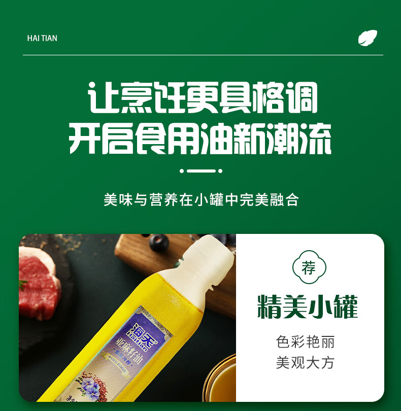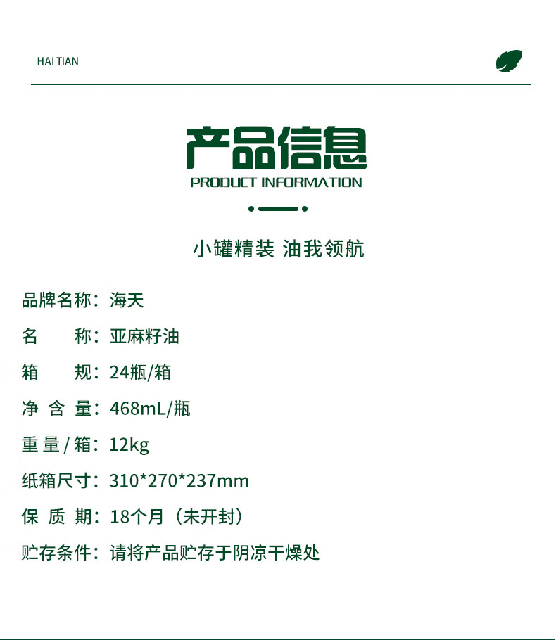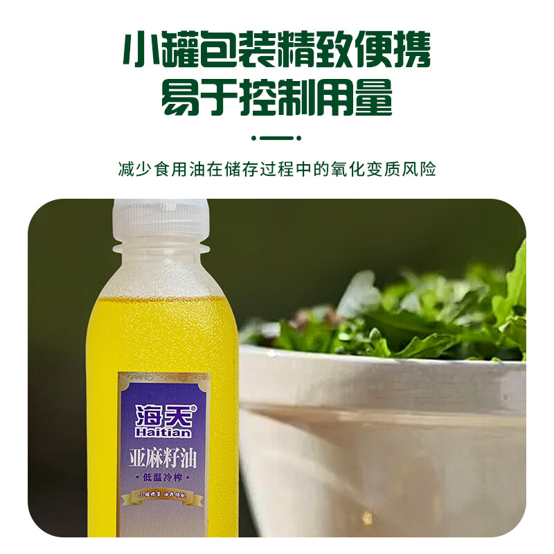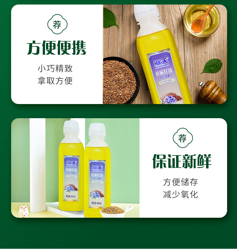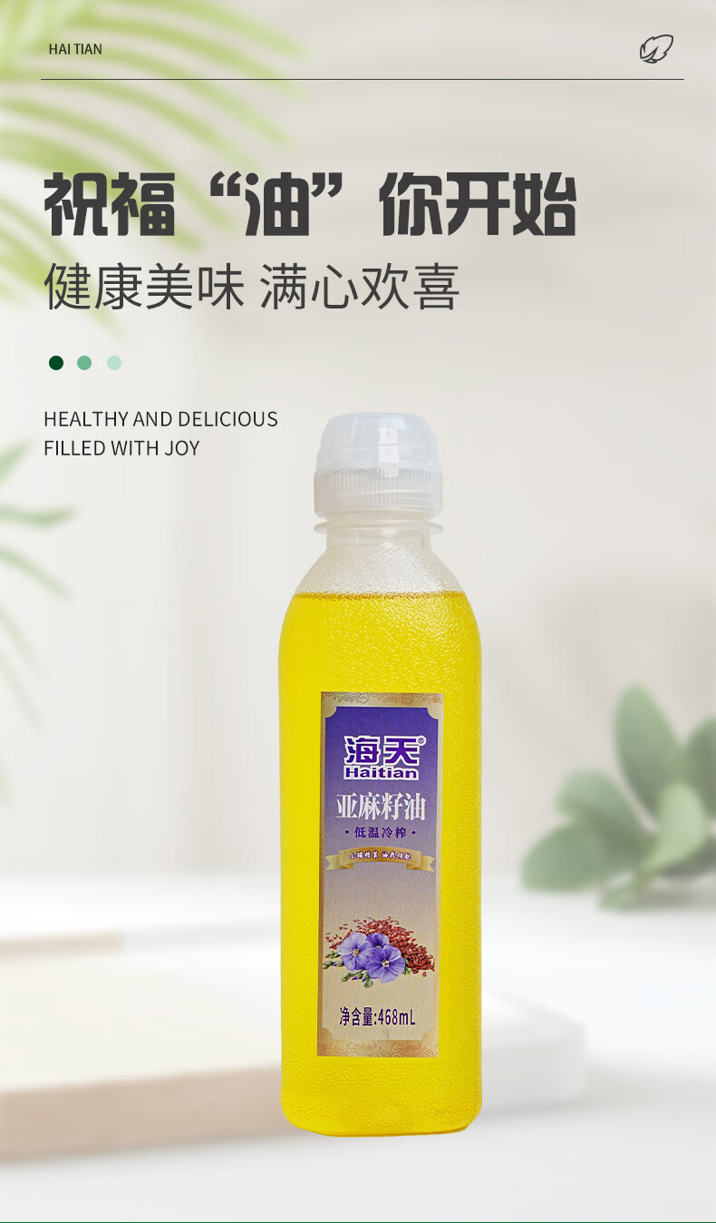 物理低温冷榨 冷烹两用 ;油体清澈 味道清香;头道初榨 0胆固醇 亚麻酸大于52%