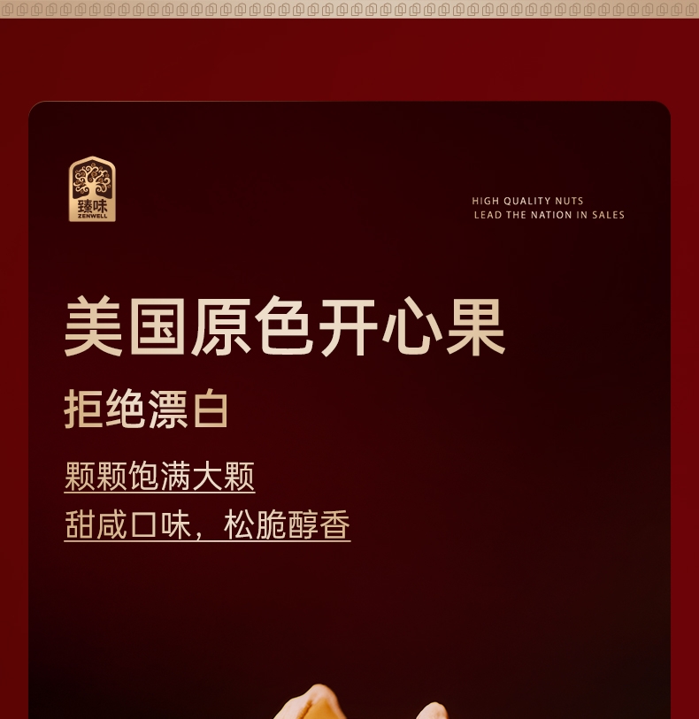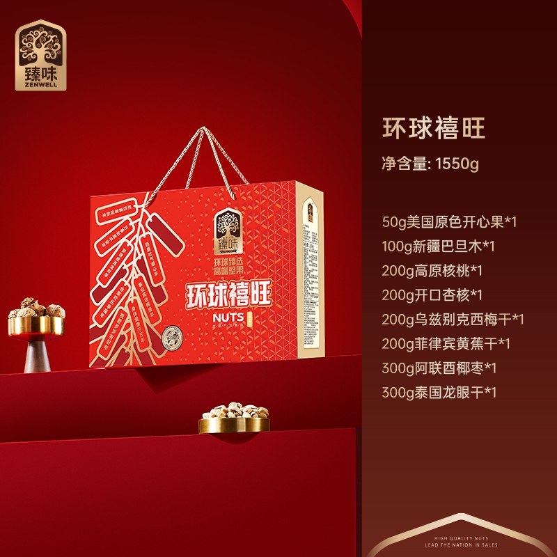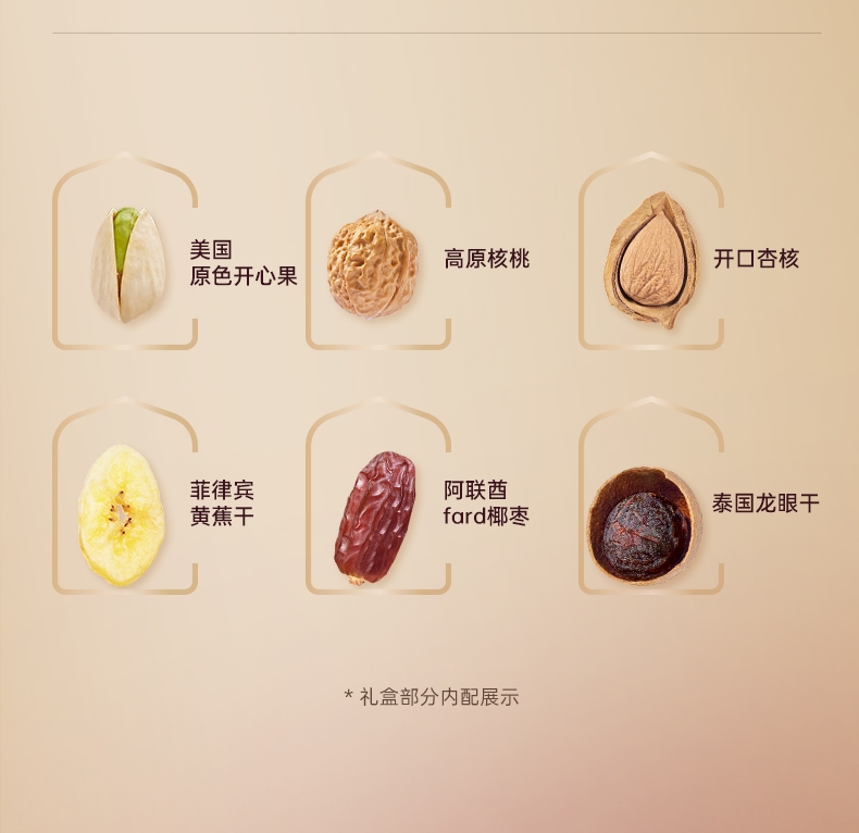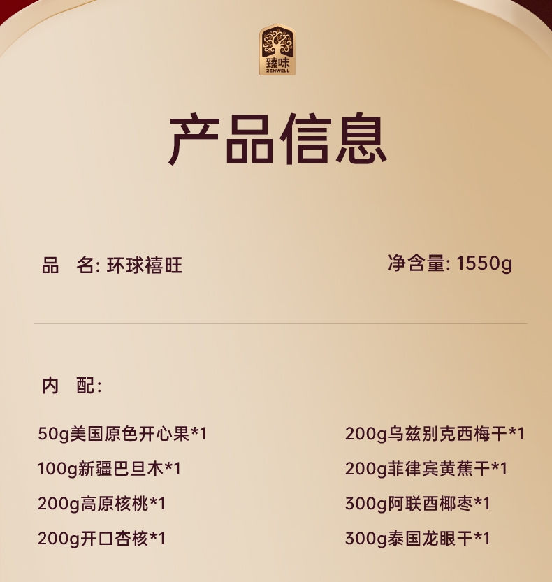 配置清单:1、臻味50g美国原味开心果*1 2、臻味100g新疆巴旦木*1 3、臻味200g高原核桃*1 4、臻味200g开口杏核*1 5、臻味200g乌兹别克西梅干*1 6、臻味200g菲律宾黄蕉干*1 7、臻味300g阿联酋椰枣*1 8、臻味300g泰国龙眼干*1