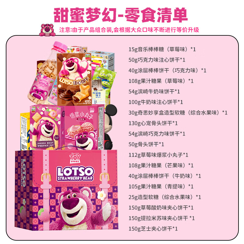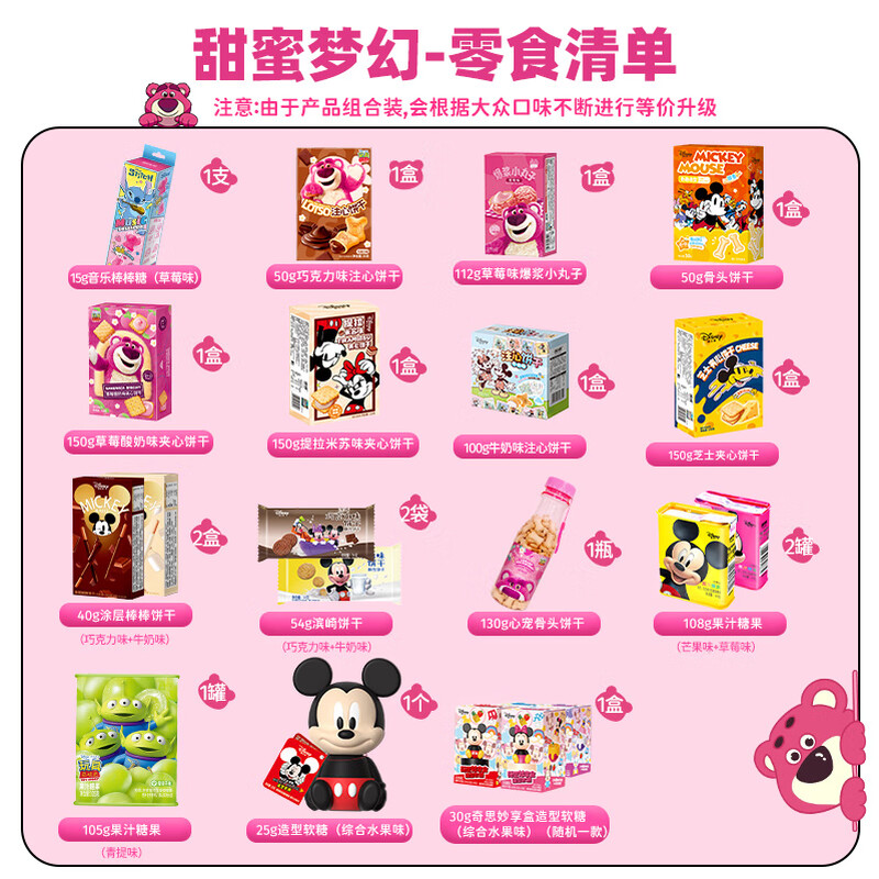 - 配置:15g音乐棒棒糖 50g注心饼干 40g涂层棒棒饼干(巧克力味) 150g提拉米苏味夹心饼干 108g果汁糖果(草莓味) 54g滨崎牛奶味饼干 30g奇思妙享盒造型软糖(综合水果味) 130g心宠骨头饼干 54g滨崎巧克力味饼干 50g骨头饼干 112g草莓味爆浆小丸子BSD-C 150g草莓酸奶味夹心饼干 108g果汁糖果(芒果味) 40g涂层棒棒饼干(牛奶味) 105g果汁糖果(青提子味) 100g注心饼干 25g造型软糖(综合水果味) 150g芝士夹心饼干