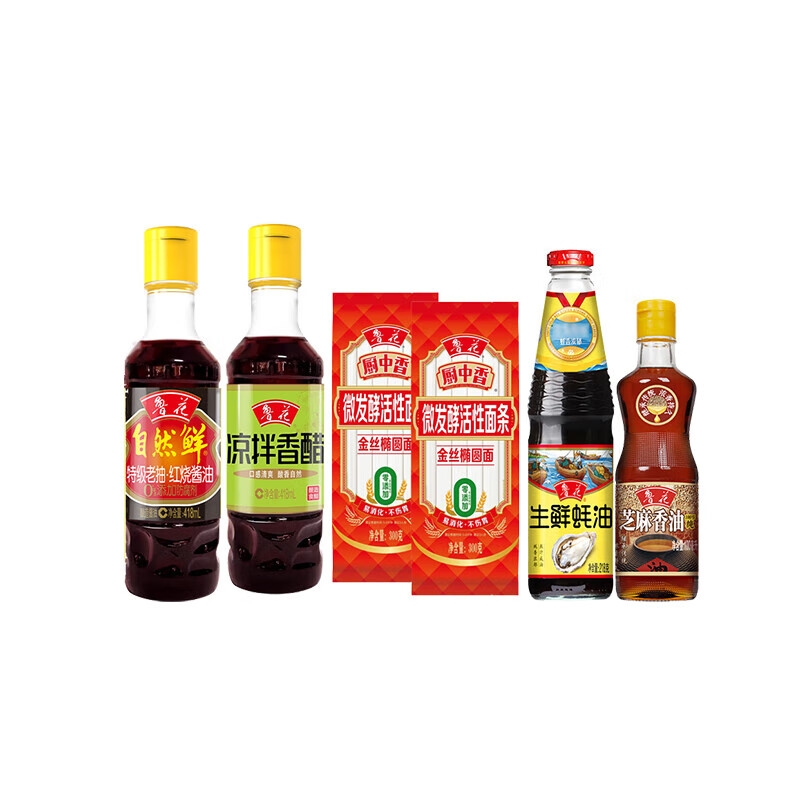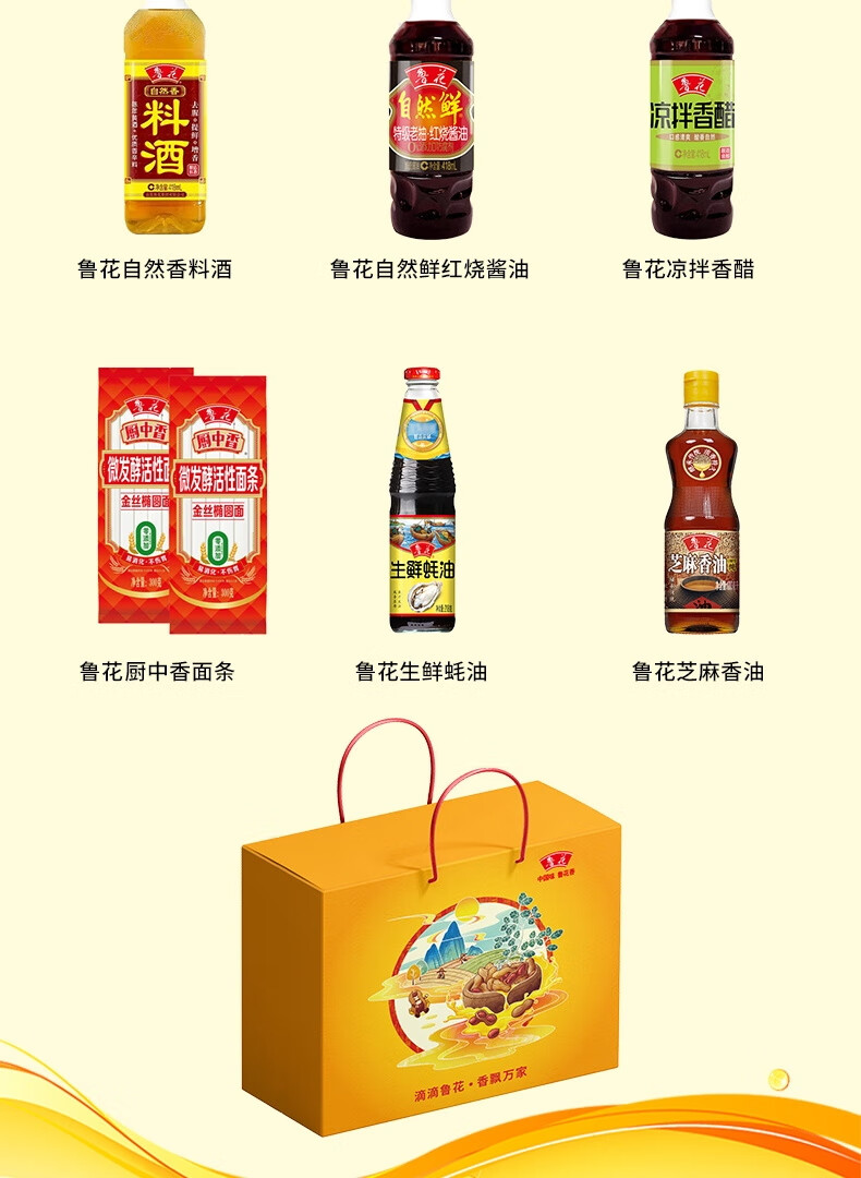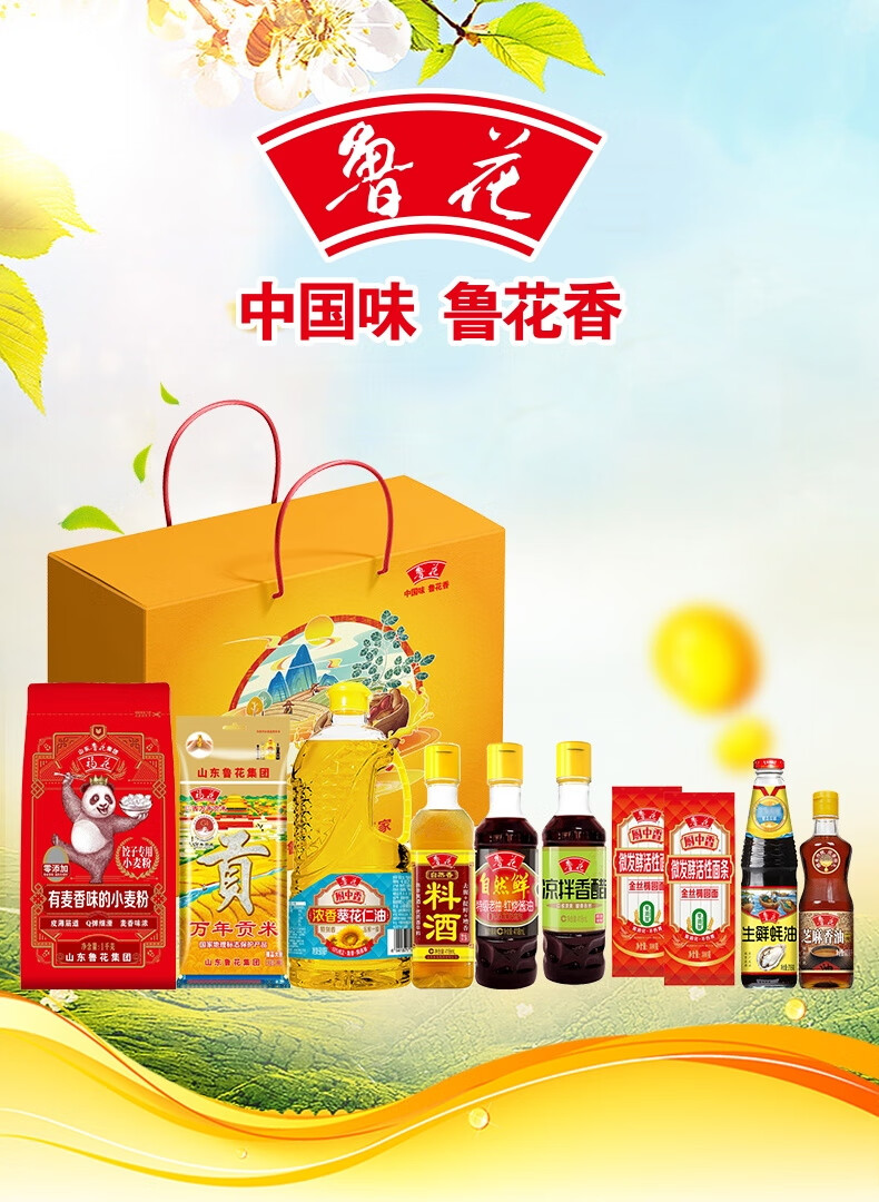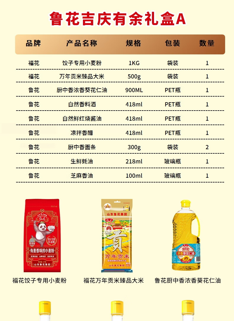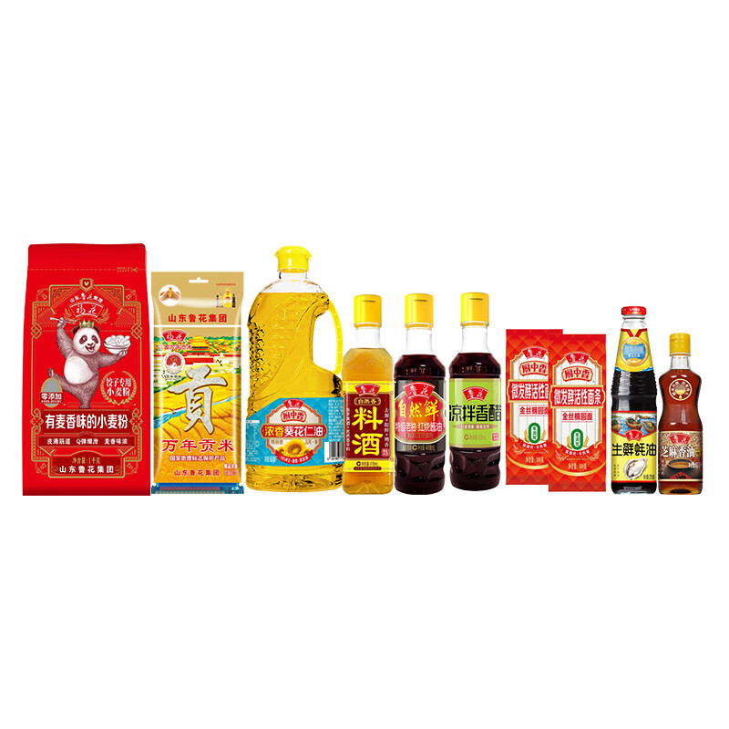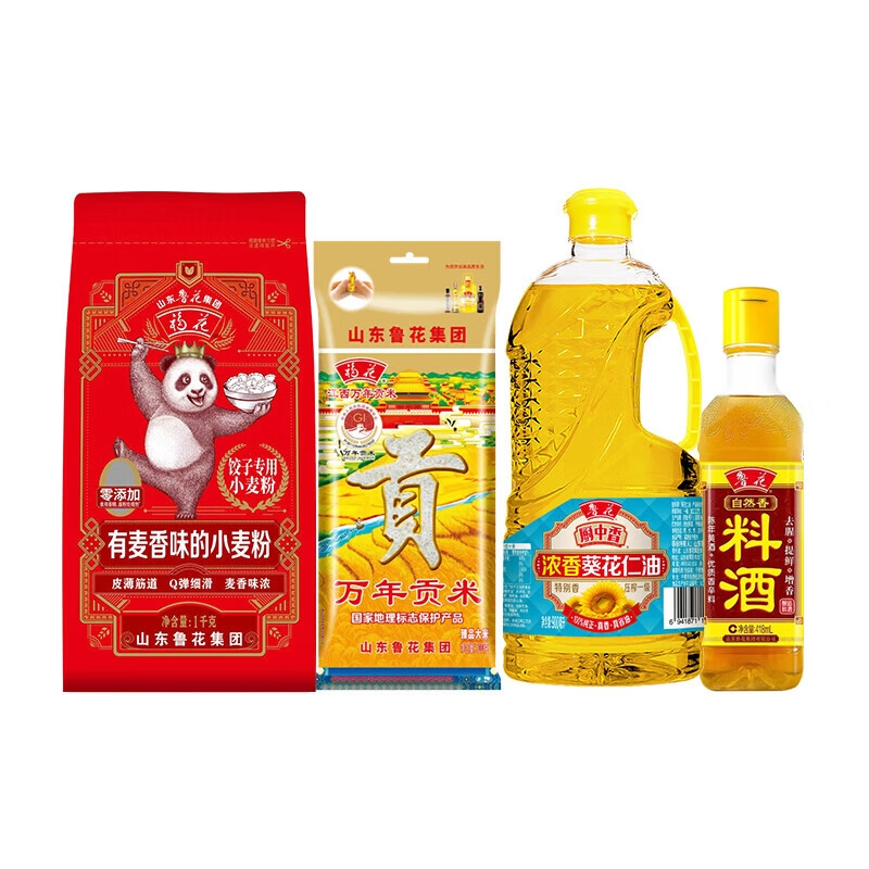 配置:福花 饺子专用小麦粉 1KG 袋装*1 福花 万年贡米臻品大米 500g 袋装*1 鲁花 厨中香浓香葵花仁油 900ML PET瓶*1 鲁花 自然香料酒 418ml PET瓶*1 鲁花 自然鲜红烧酱油 418ml PET瓶*1 鲁花 凉拌香醋 418ml PET瓶*1 鲁花 厨中香金丝椭圆面 300g 袋装*2 鲁花 生鲜蚝油 218ml 玻璃瓶*1 鲁花 芝麻香油 100ml 玻璃瓶*1