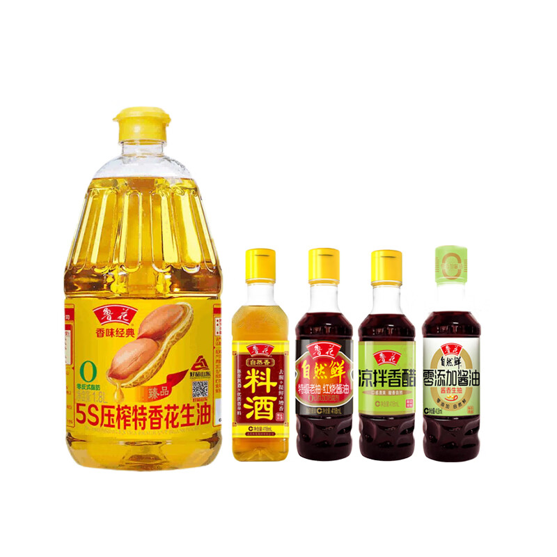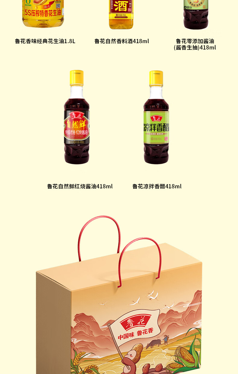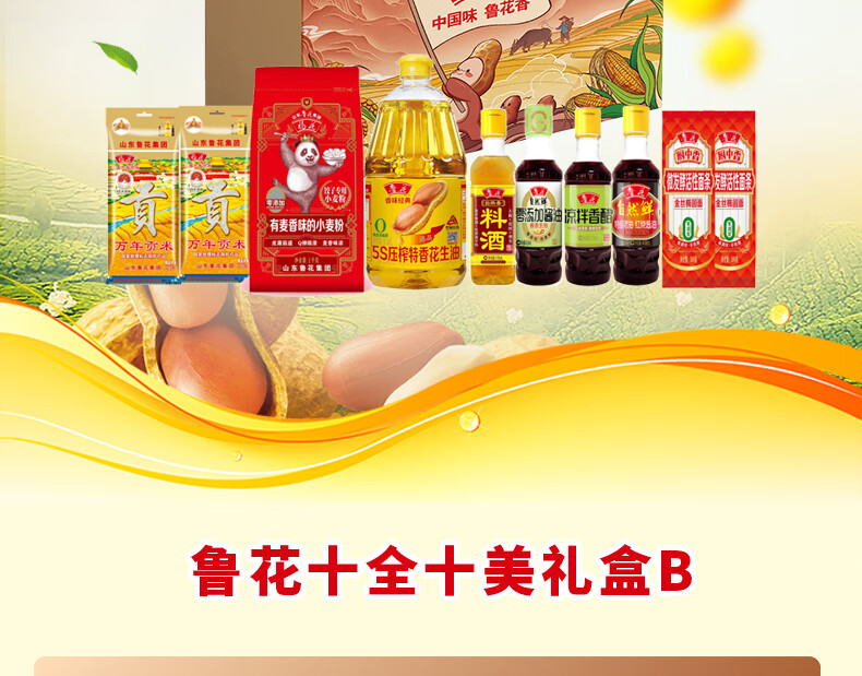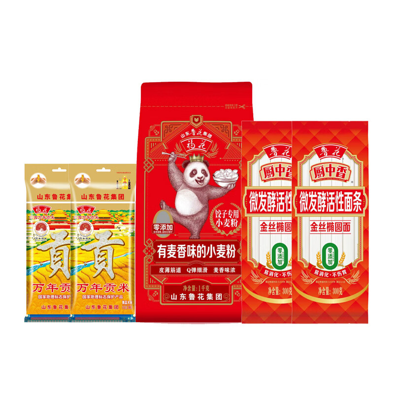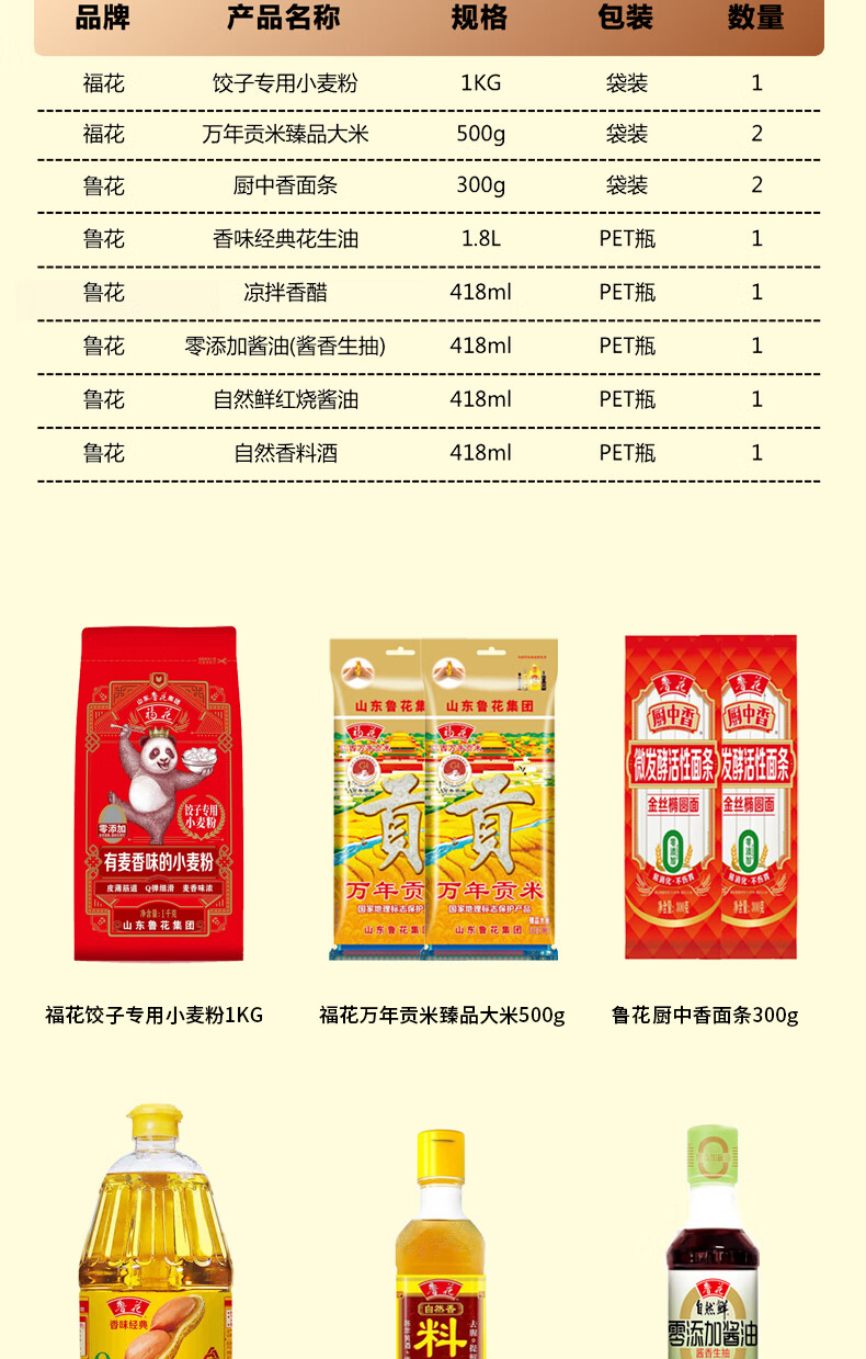 配置:福花 饺子专用小麦粉 1KG 袋装*1 福花 万年贡米臻品大米 500g 袋装*2 鲁花 厨中香金丝椭圆面 300g 袋装*2 鲁花 香味经典花生油 1.8L PET瓶*1 鲁花 凉拌香醋 418ml PET瓶*1 鲁花 零添加酱油(酱香生抽) 418ml PET瓶*1 鲁花 自然鲜红烧酱油 418ml PET瓶*1 鲁花 自然香料酒 418ml PET瓶*1