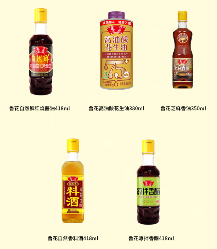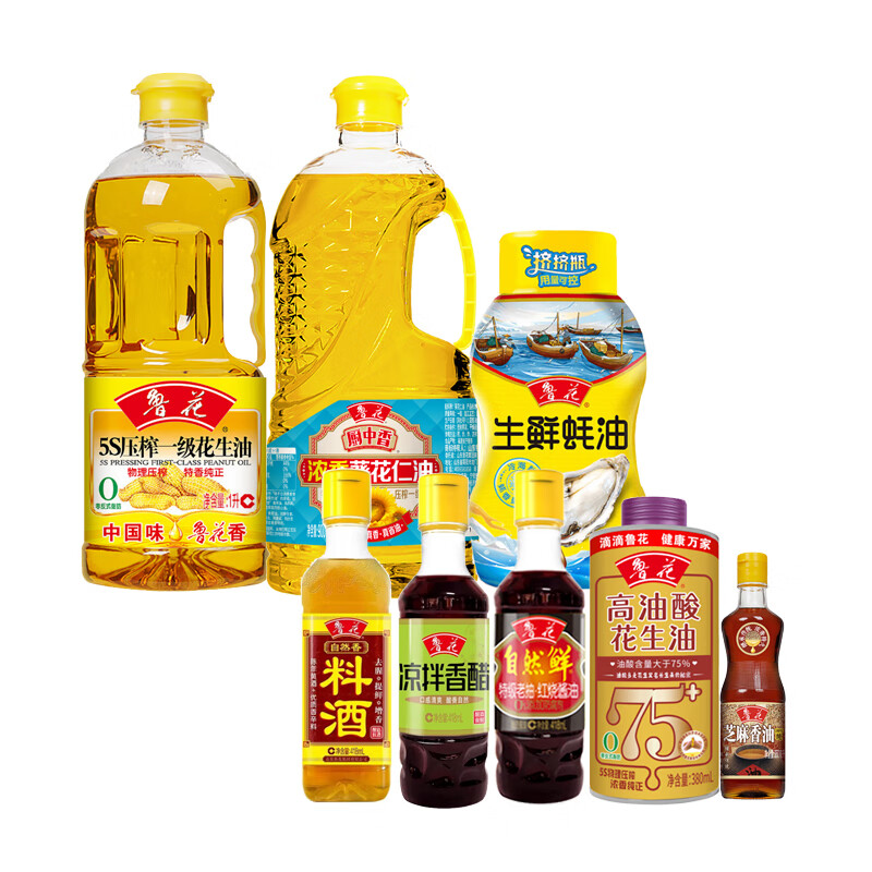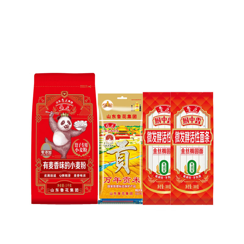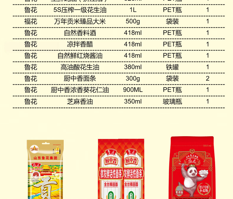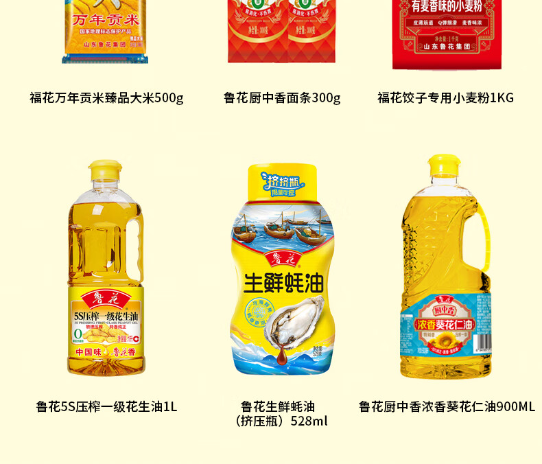 配置:福花 饺子专用小麦粉 1KG 袋装*1 鲁花 生鲜蚝油(挤压瓶) 528ml PET瓶*1 鲁花 5S压榨一级花生油 1L PET瓶*1 福花 万年贡米臻品大米 500g 袋装*1 鲁花 自然香料酒 418ml PET瓶*1 鲁花 凉拌香醋 418ml PET瓶*1 鲁花 自然鲜红烧酱油 418ml PET瓶*1 鲁花 高油酸花生油 380ml 铁罐*1 鲁花 厨中香金丝椭圆面 300g 袋装*2 鲁花 厨中香浓香葵花仁油 900ML PET瓶*1 鲁花 芝麻香油 350ml 玻璃瓶*1