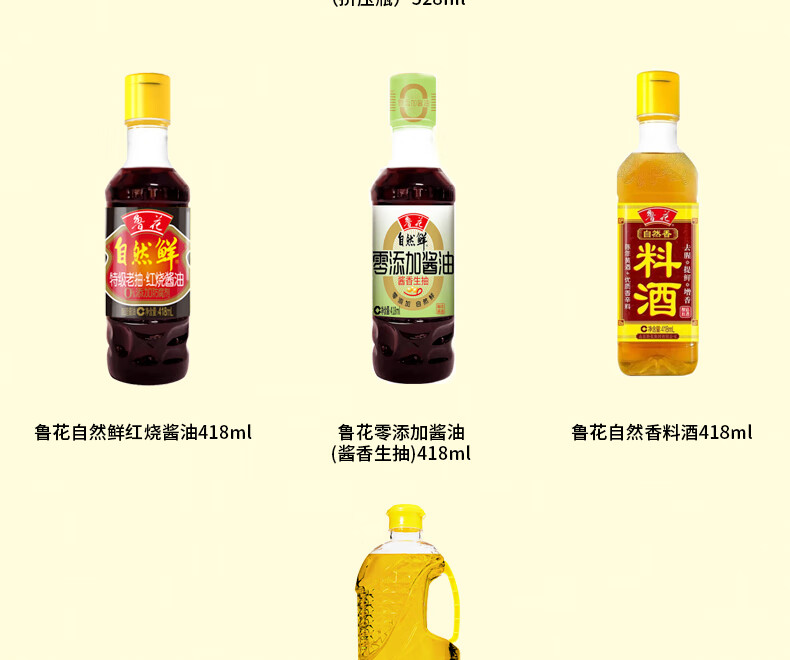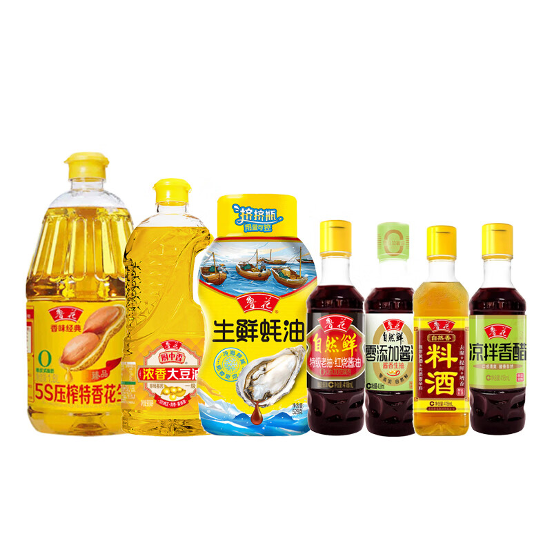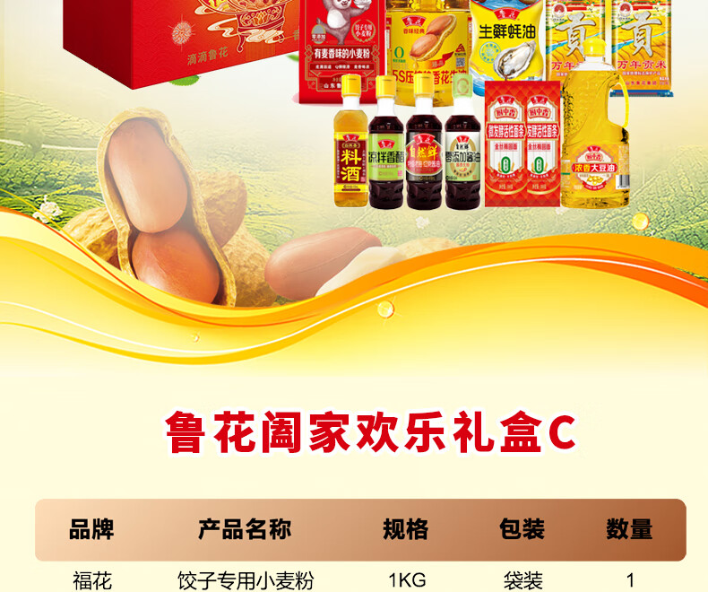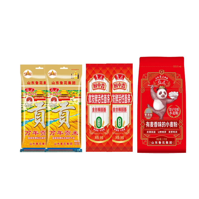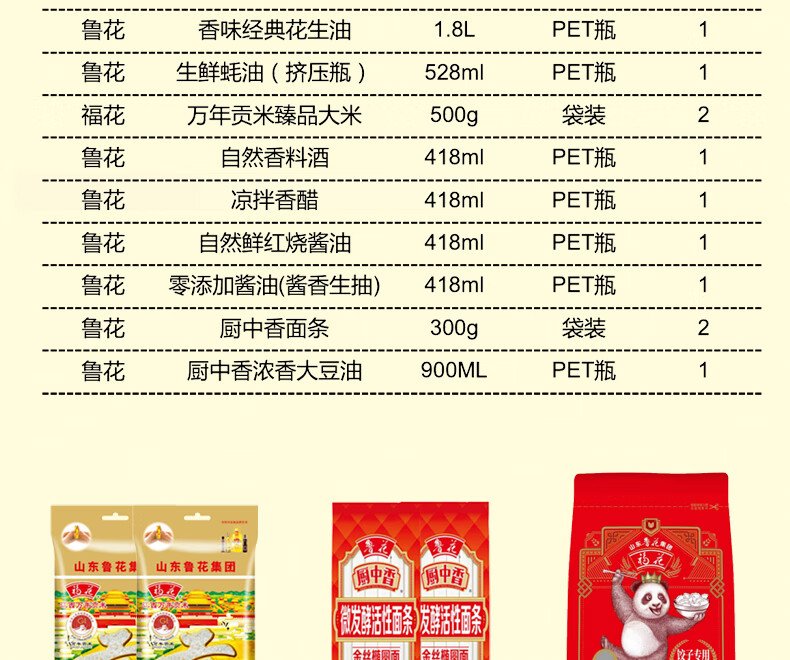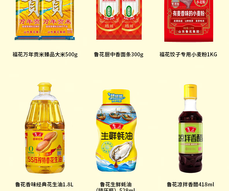 配置:福花 饺子专用小麦粉 1KG 袋装*1 鲁花 香味经典花生油 1.8L PET瓶*1 鲁花 生鲜蚝油(挤压瓶) 528ml PET瓶*1 福花 万年贡米臻品大米 500g 袋装*2 鲁花 自然香料酒 418ml PET瓶*1 鲁花 凉拌香醋 418ml PET瓶*1 鲁花 自然鲜红烧酱油 418ml PET瓶*1 鲁花 零添加酱油(酱香生抽) 418ml PET瓶*1 鲁花 厨中香金丝椭圆面 300g 袋装*2 鲁花 厨中香浓香大豆油 900ML PET瓶*1